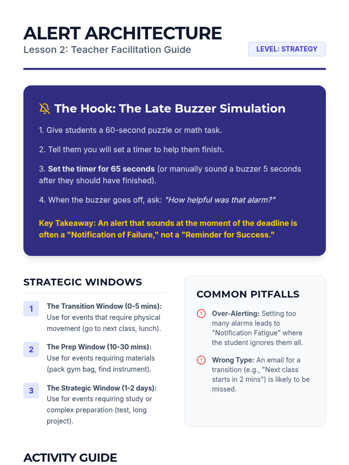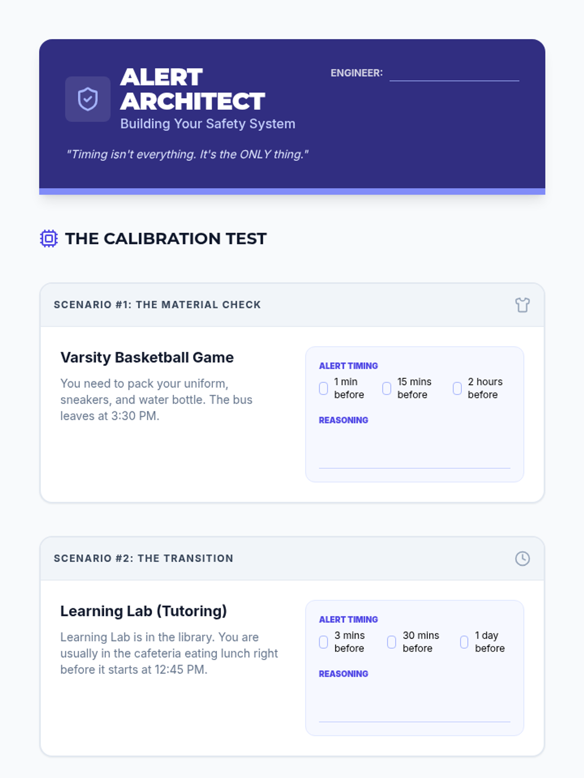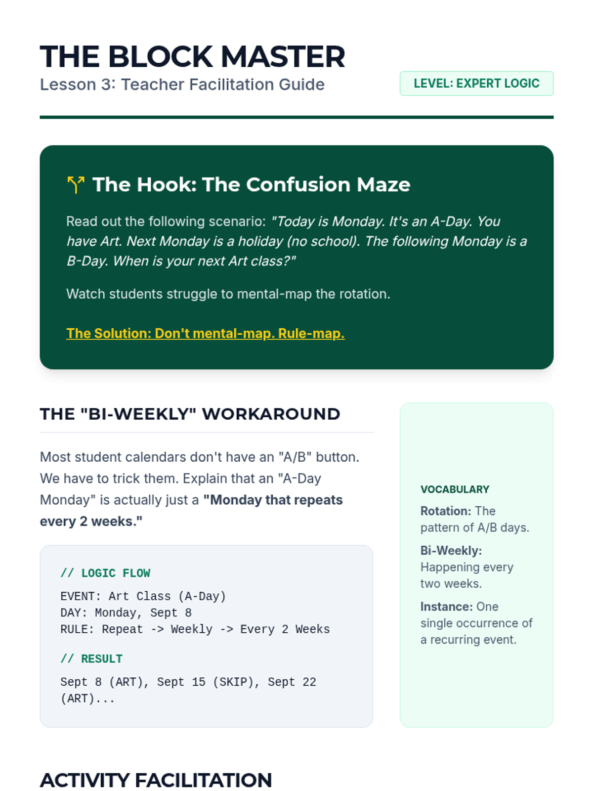 A specialized sequence for 9th-grade students focusing on using digital calendar automation (recurring events and smart alerts) to support executive function and memory. Students move from basic repetition to complex A/B scheduling and multi-layered reminder systems.