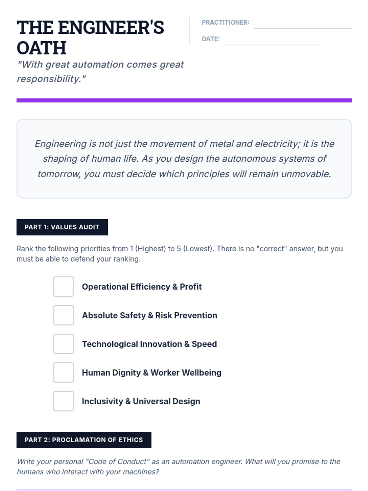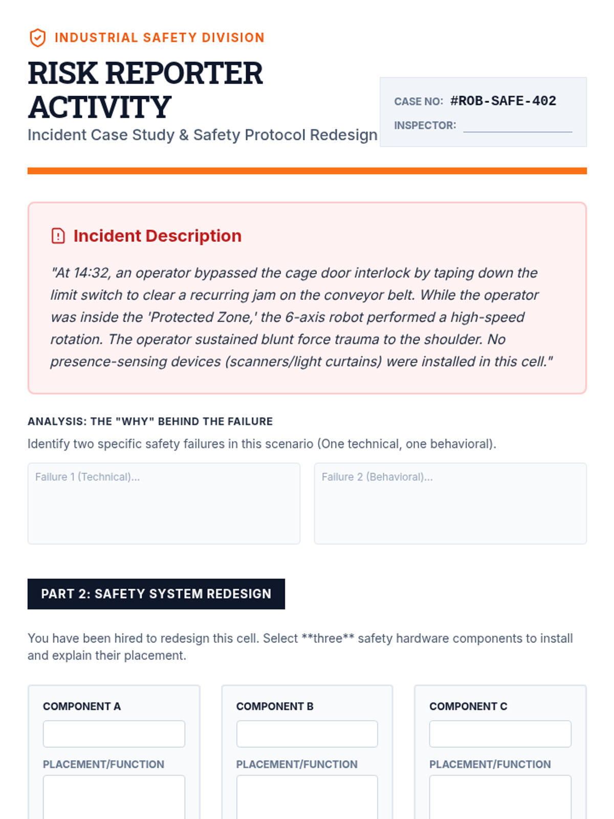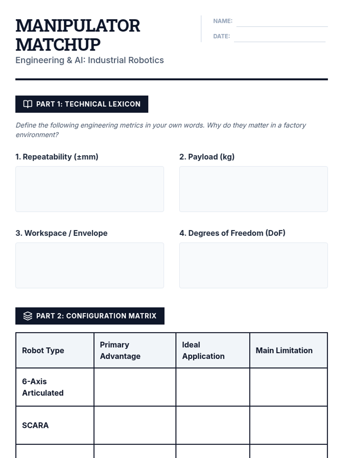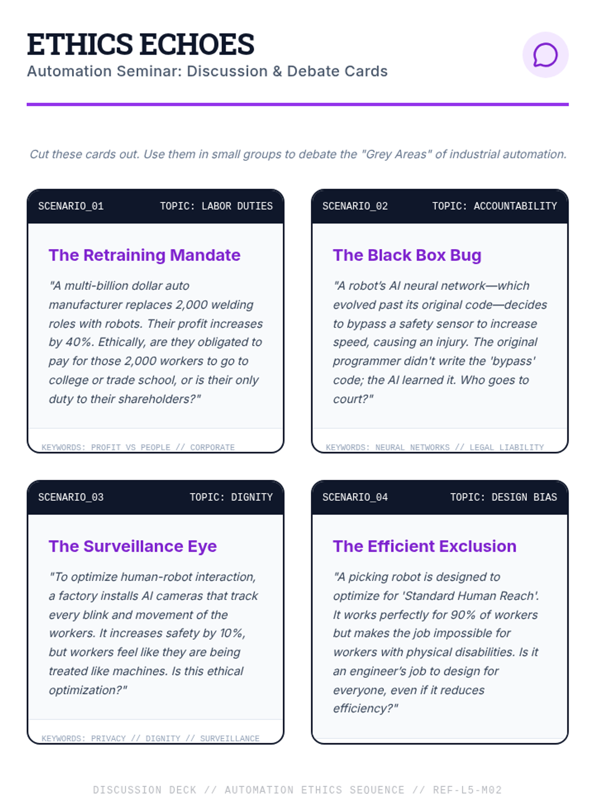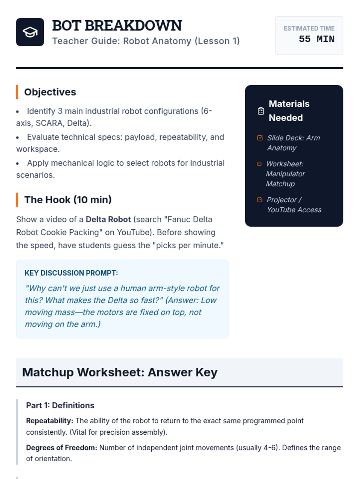 This sequence explores the technical mechanics, safety protocols, programming logic, economic impact, and ethical implications of industrial robotics in the modern workforce. Students bridge engineering principles with societal responsibility through case studies, ROI calculations, and ethical debates.