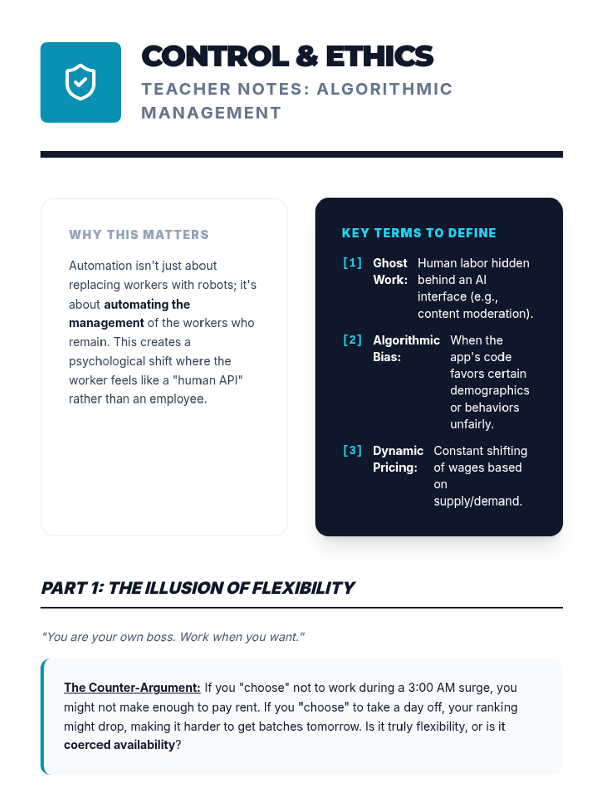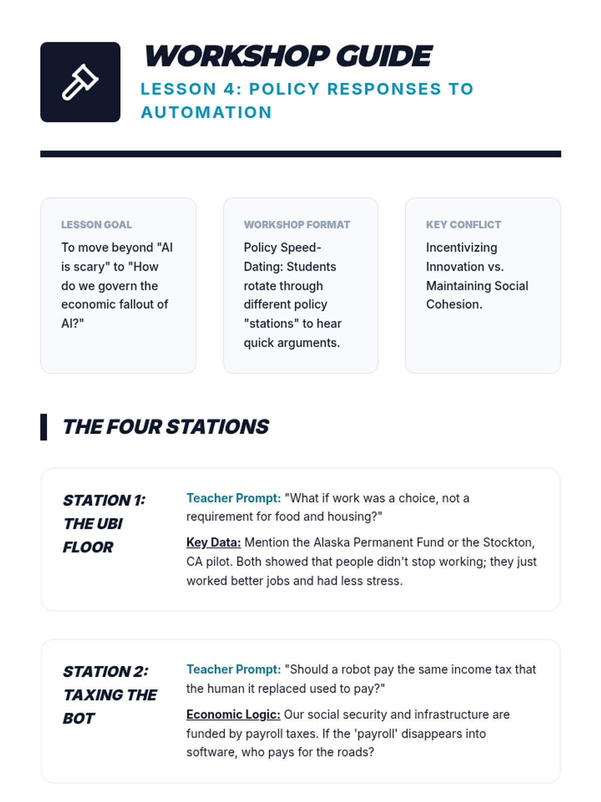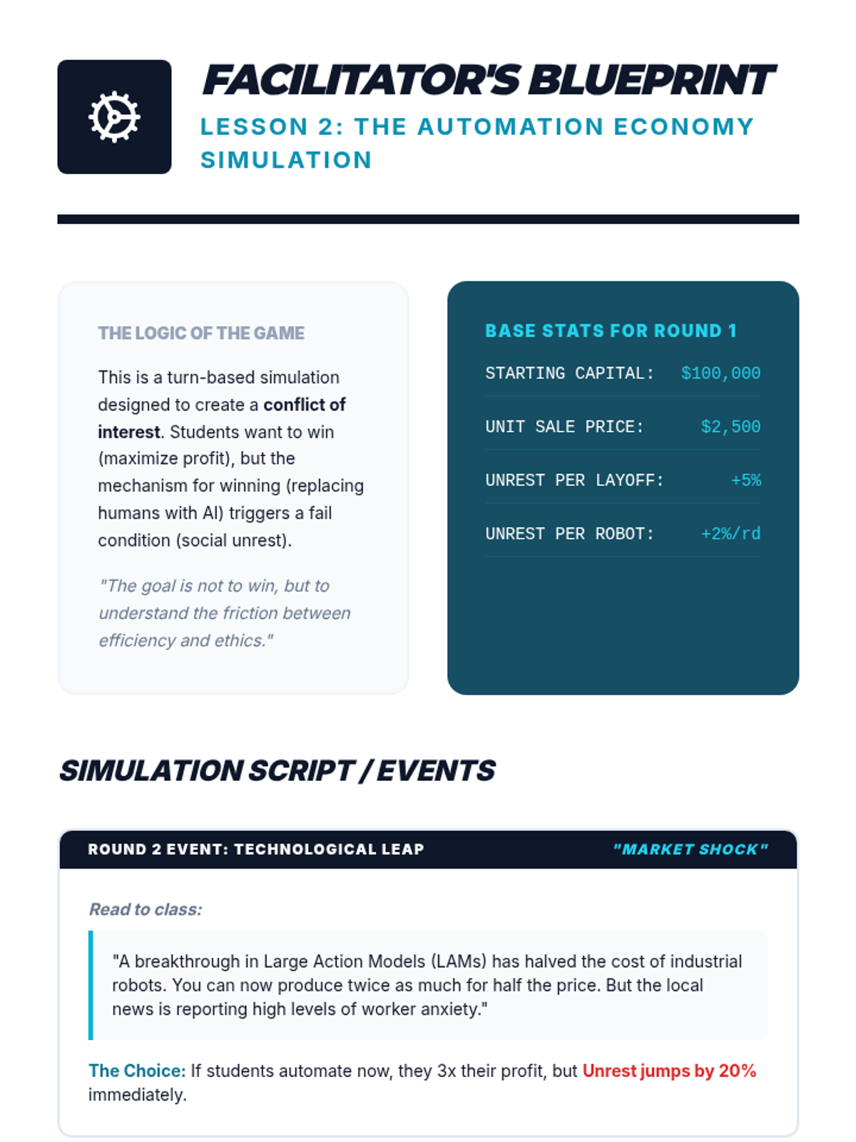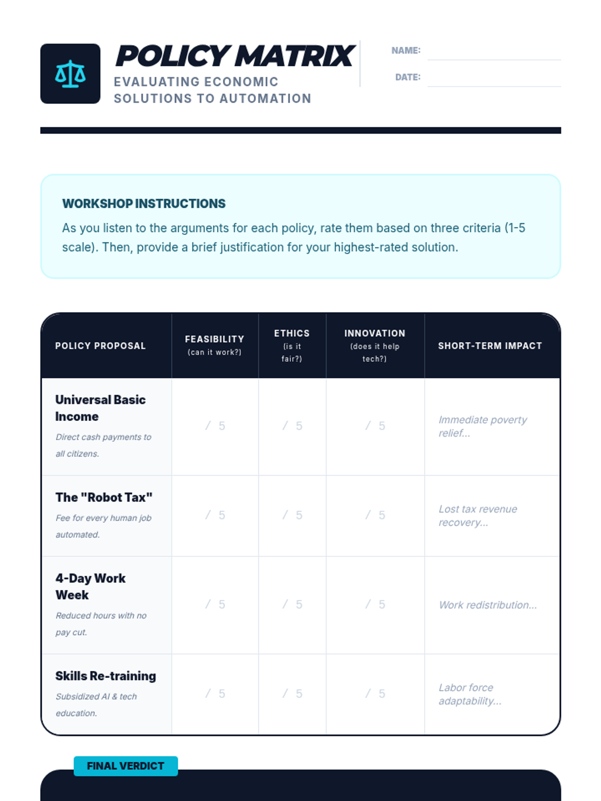 This sequence explores the economic and social disruptions caused by automation and AI. Students analyze historical patterns of labor displacement, participate in economic simulations, investigate the gig economy, debate policy solutions like UBI, and develop personalized career roadmaps focusing on uniquely human skills.