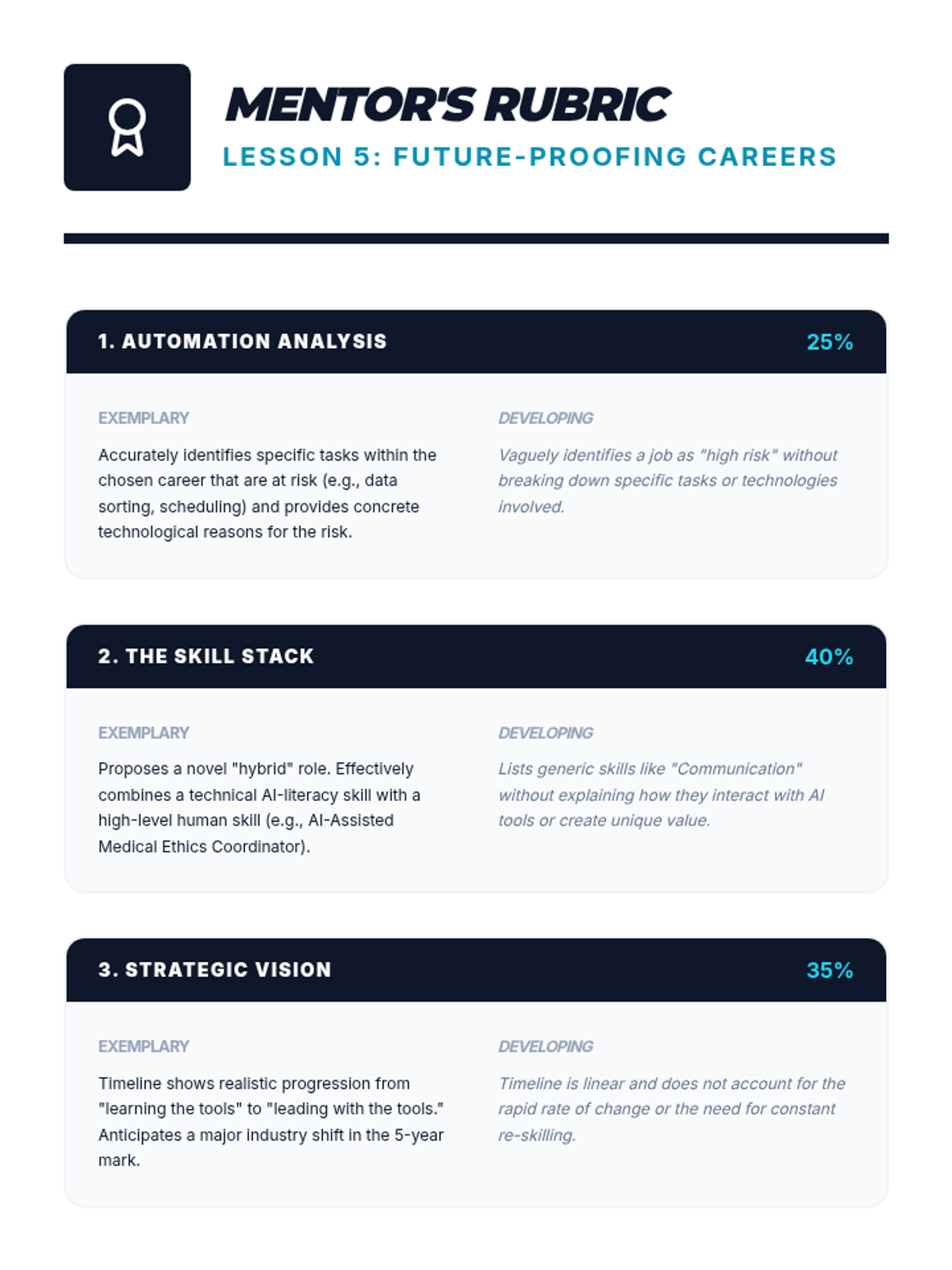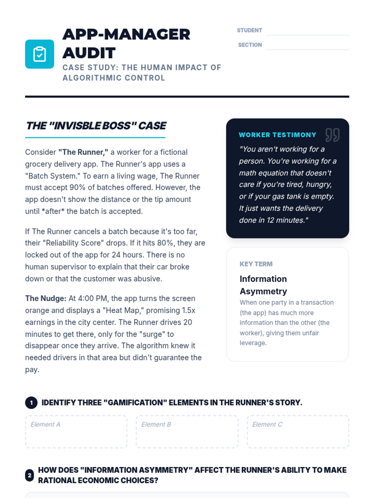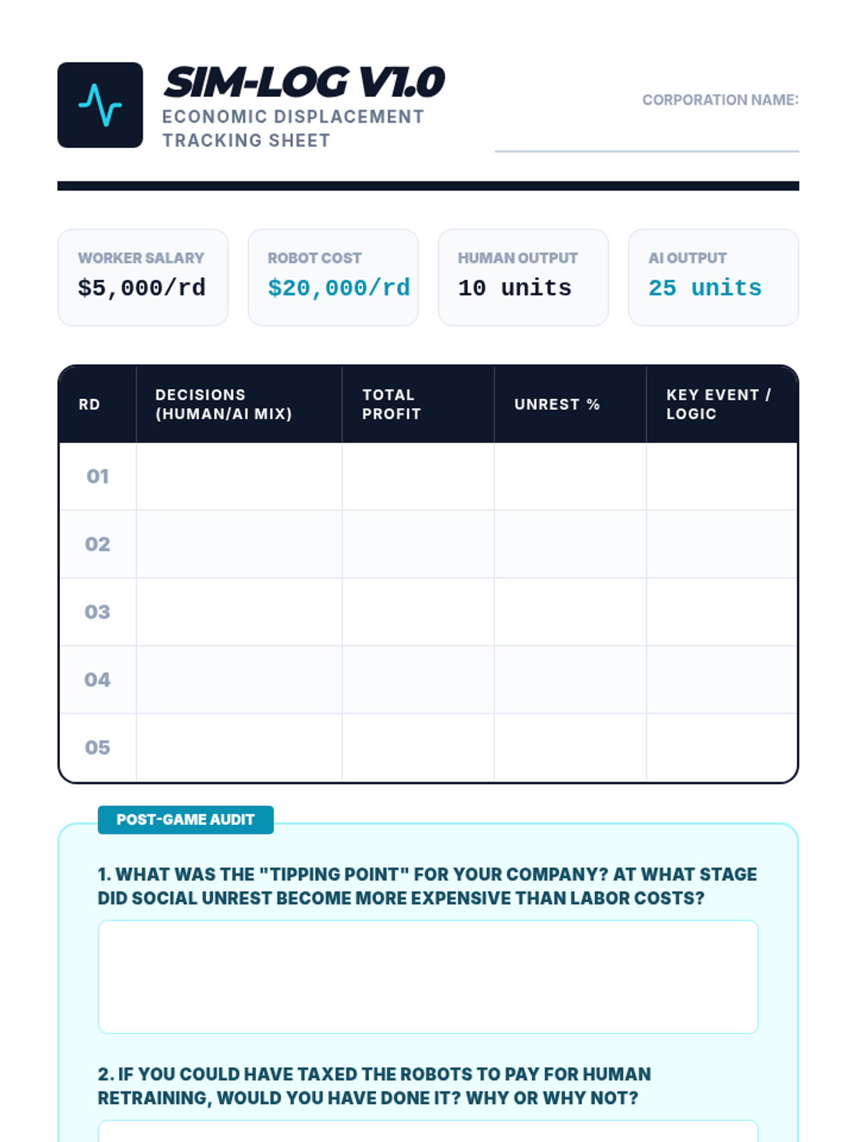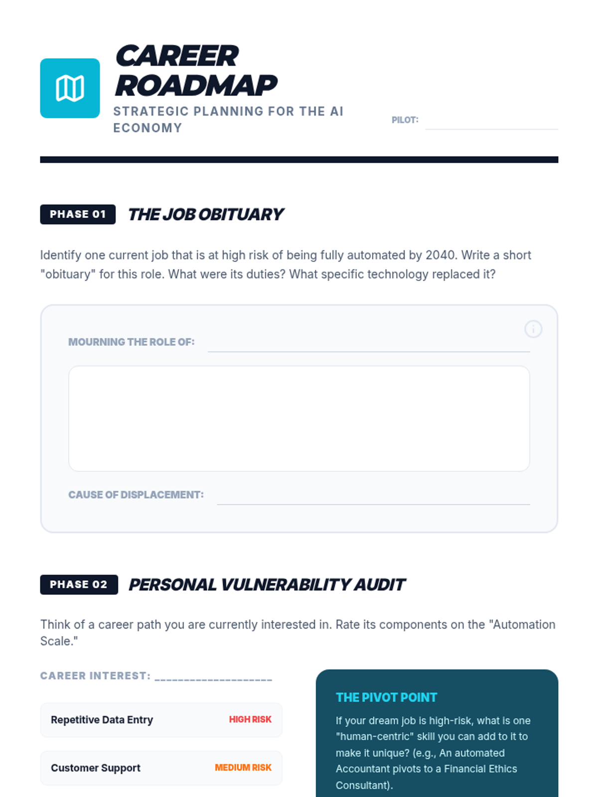 This sequence explores the economic and social disruptions caused by automation and AI. Students analyze historical patterns of labor displacement, participate in economic simulations, investigate the gig economy, debate policy solutions like UBI, and develop personalized career roadmaps focusing on uniquely human skills.
