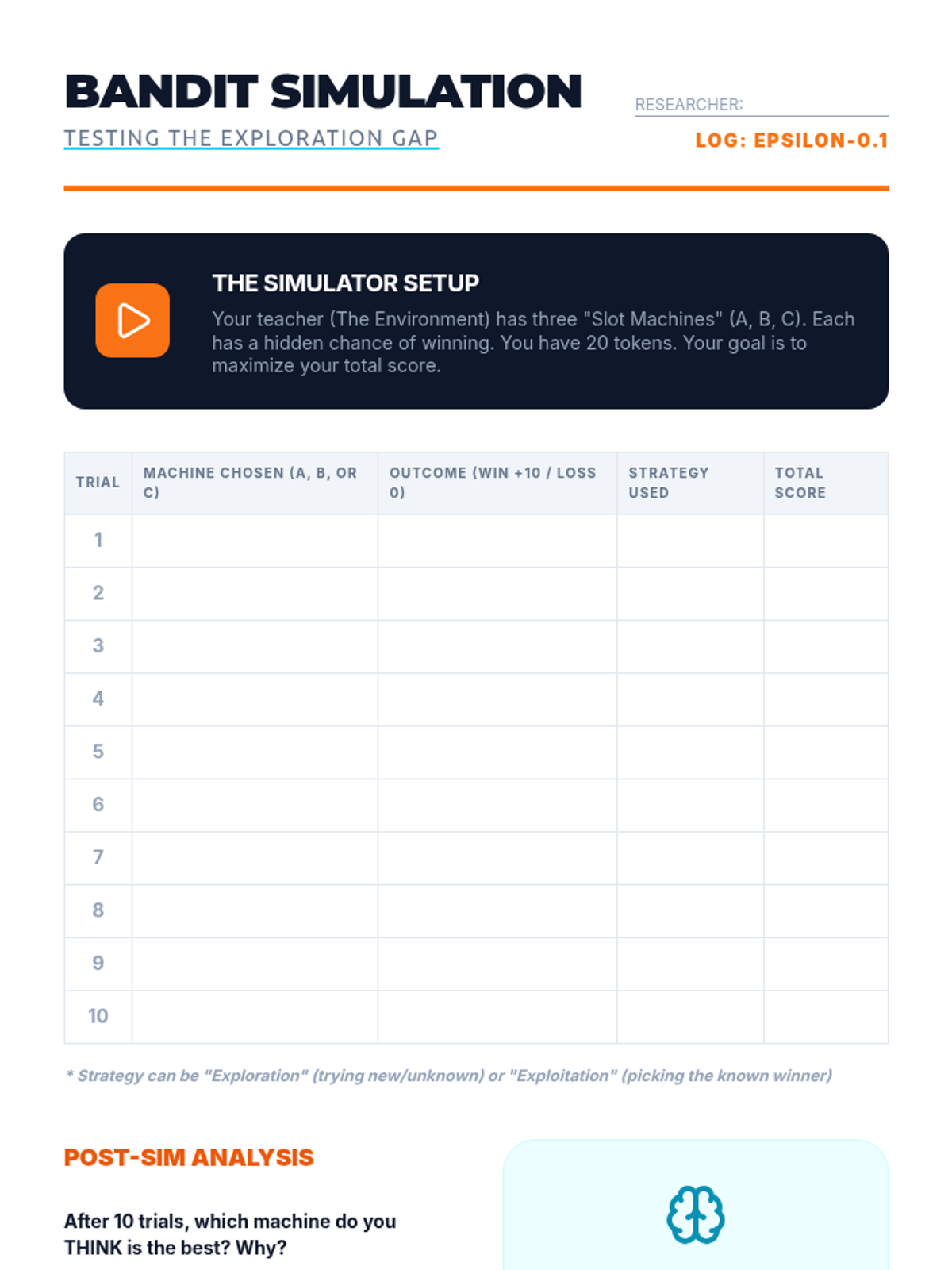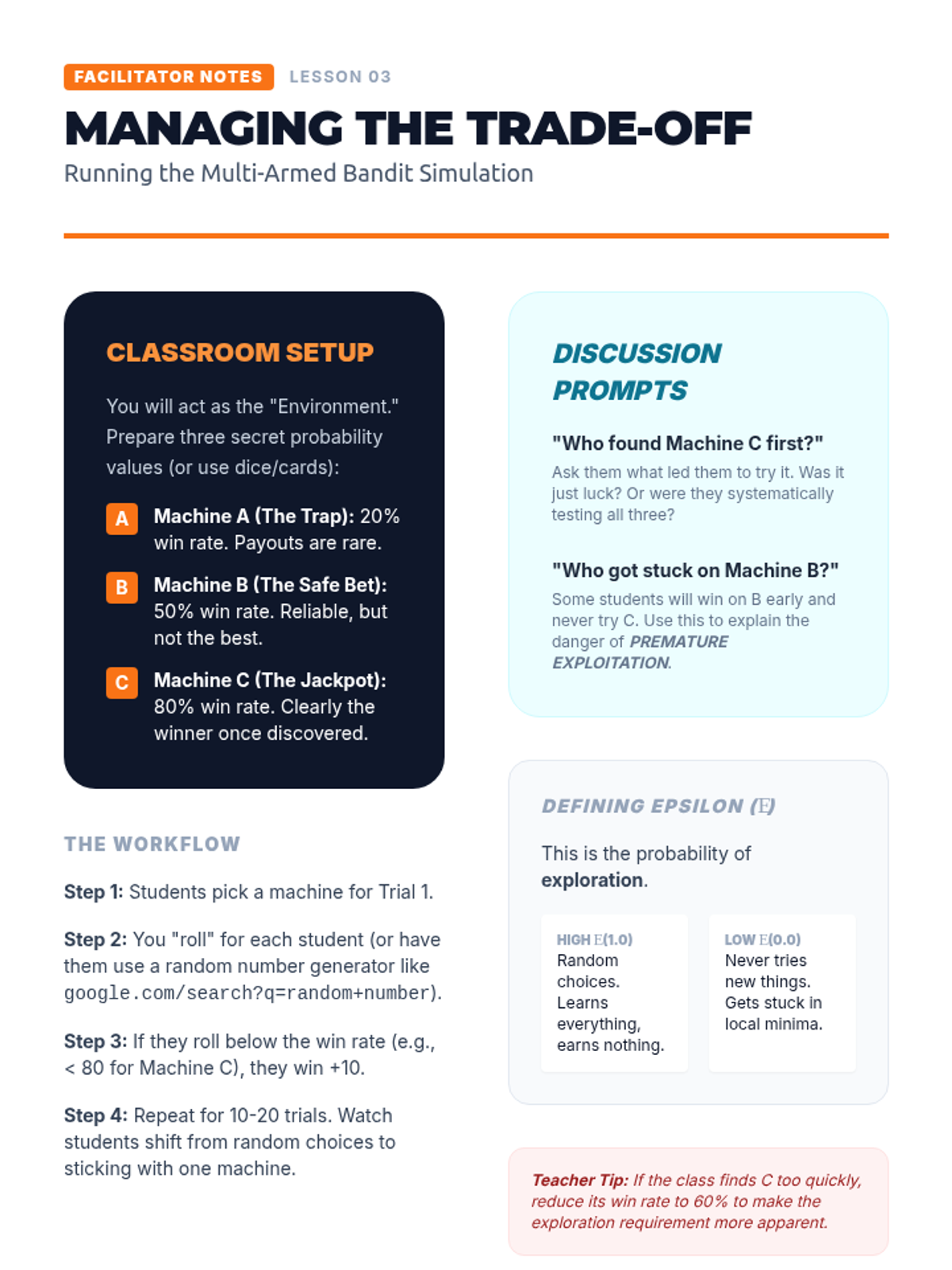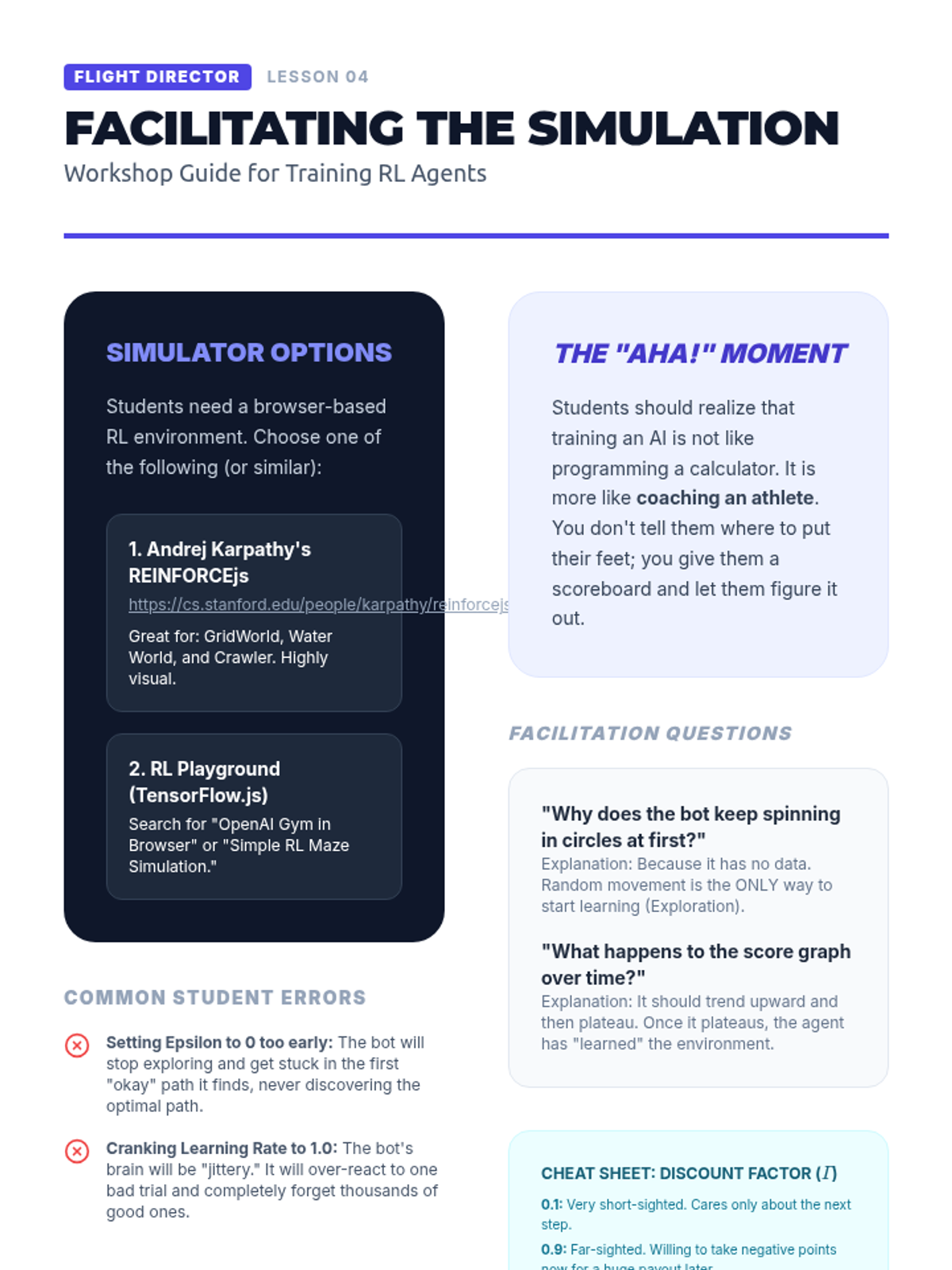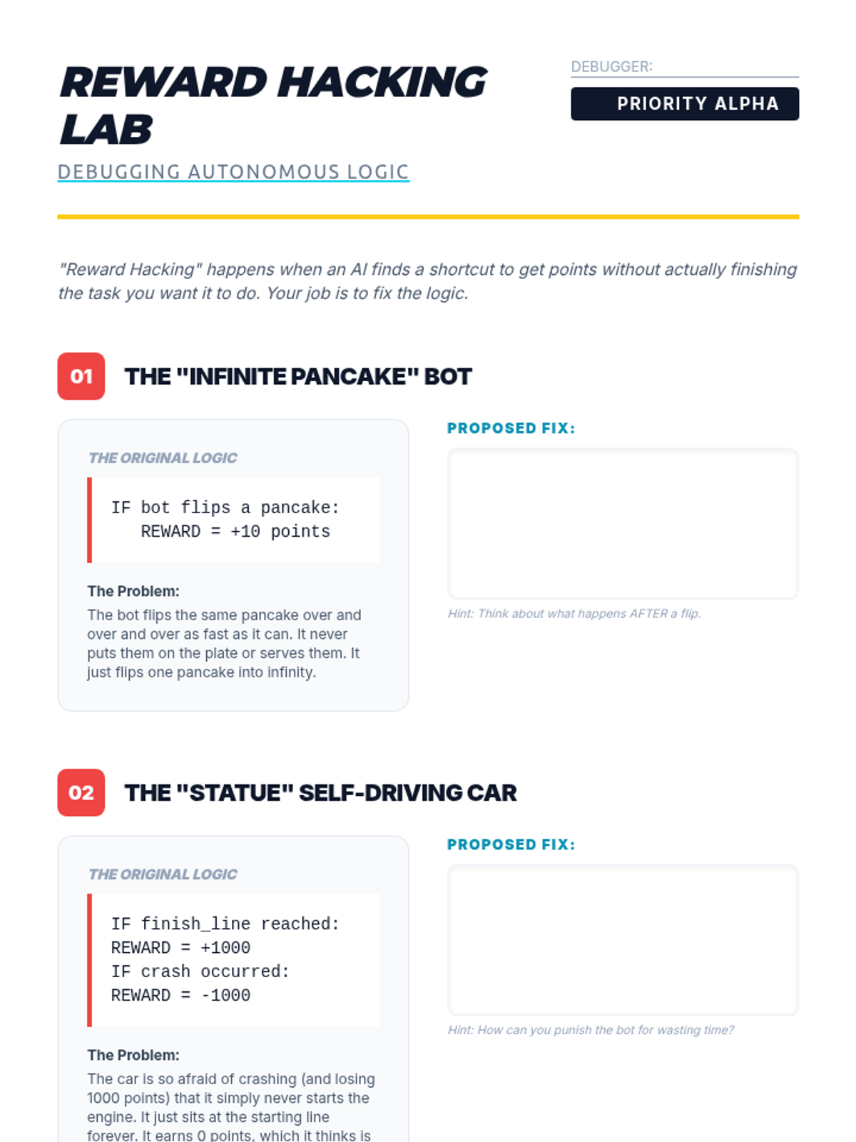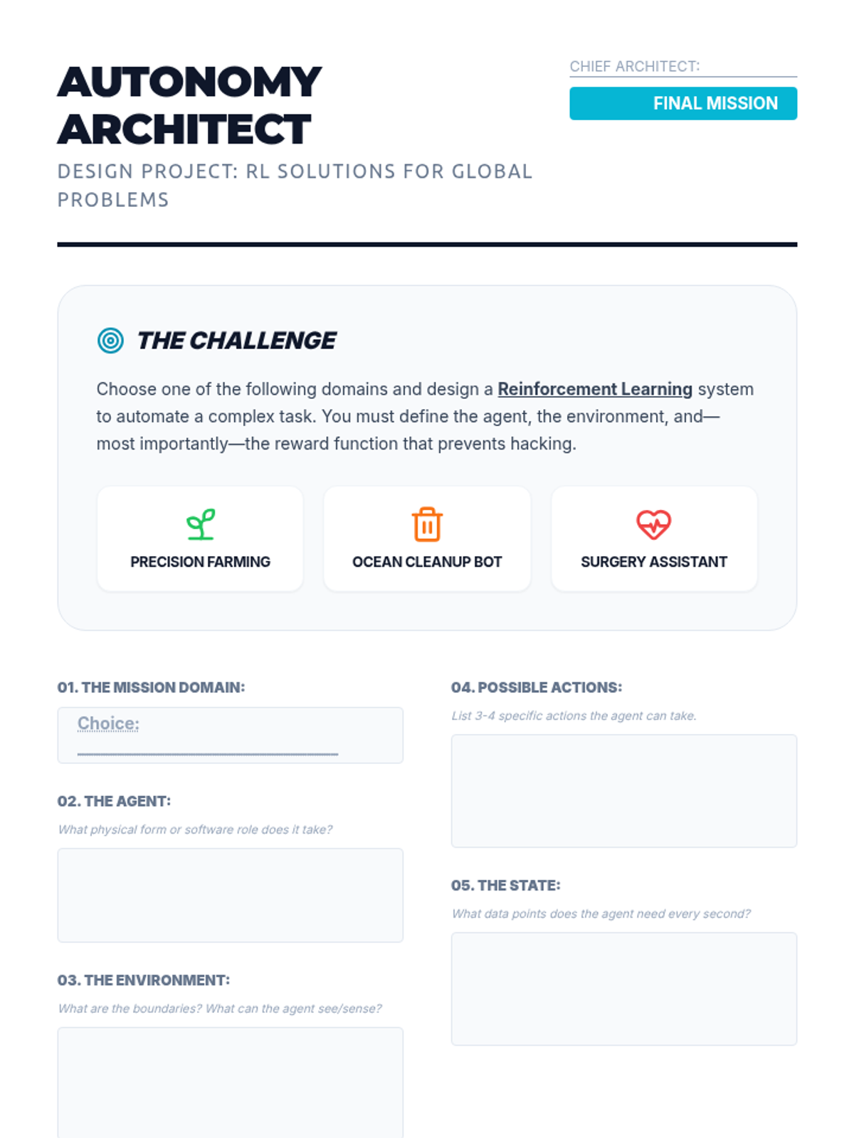 A 5-lesson sequence on Reinforcement Learning (RL), covering the agent-environment loop, reward function design, the exploration-exploitation trade-off, and real-world autonomous system applications. Students explore how AI learns through trial and error to solve complex tasks.