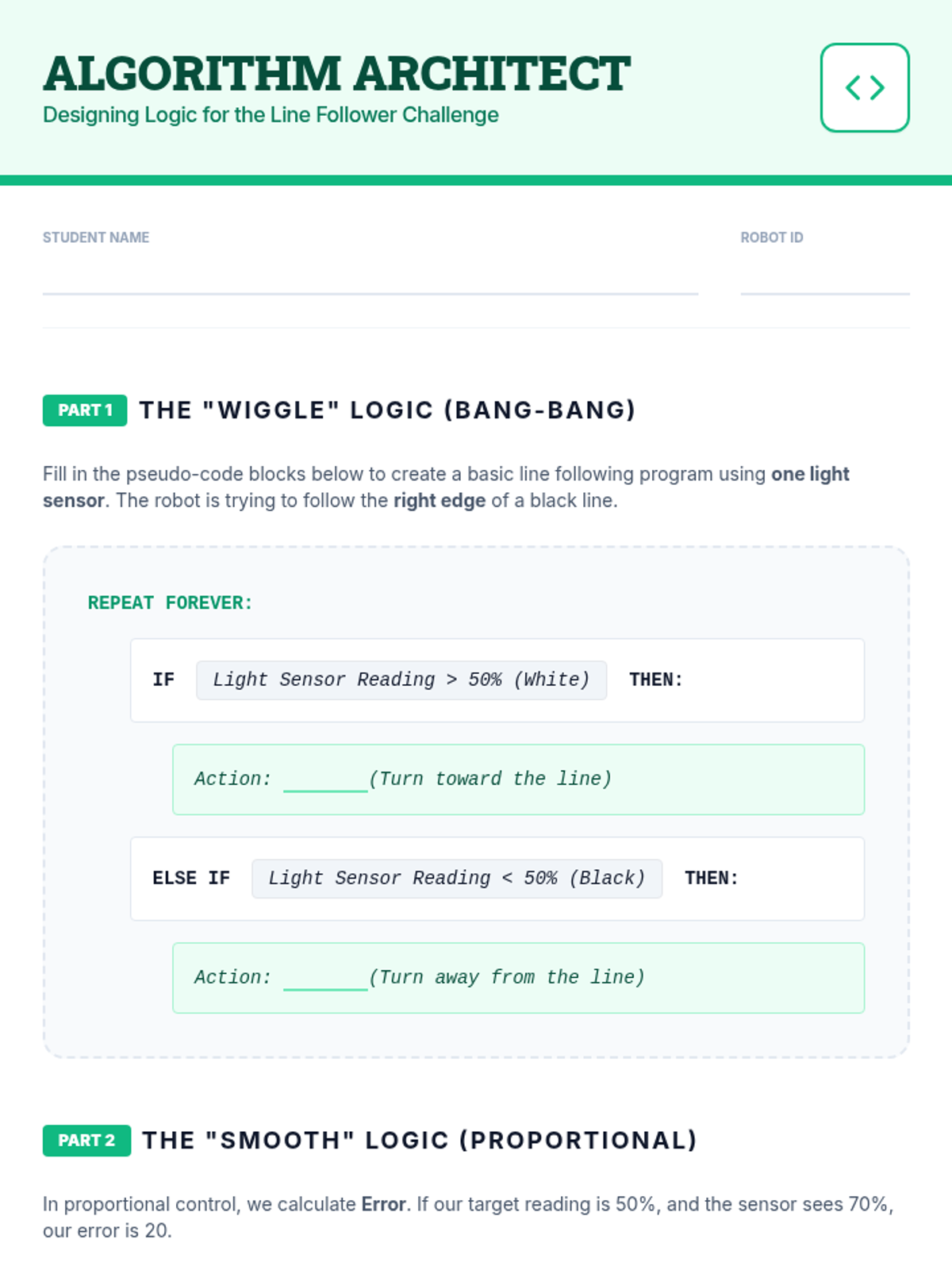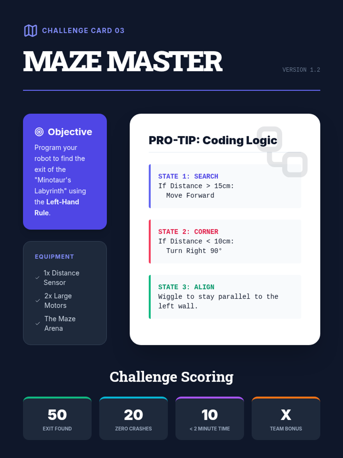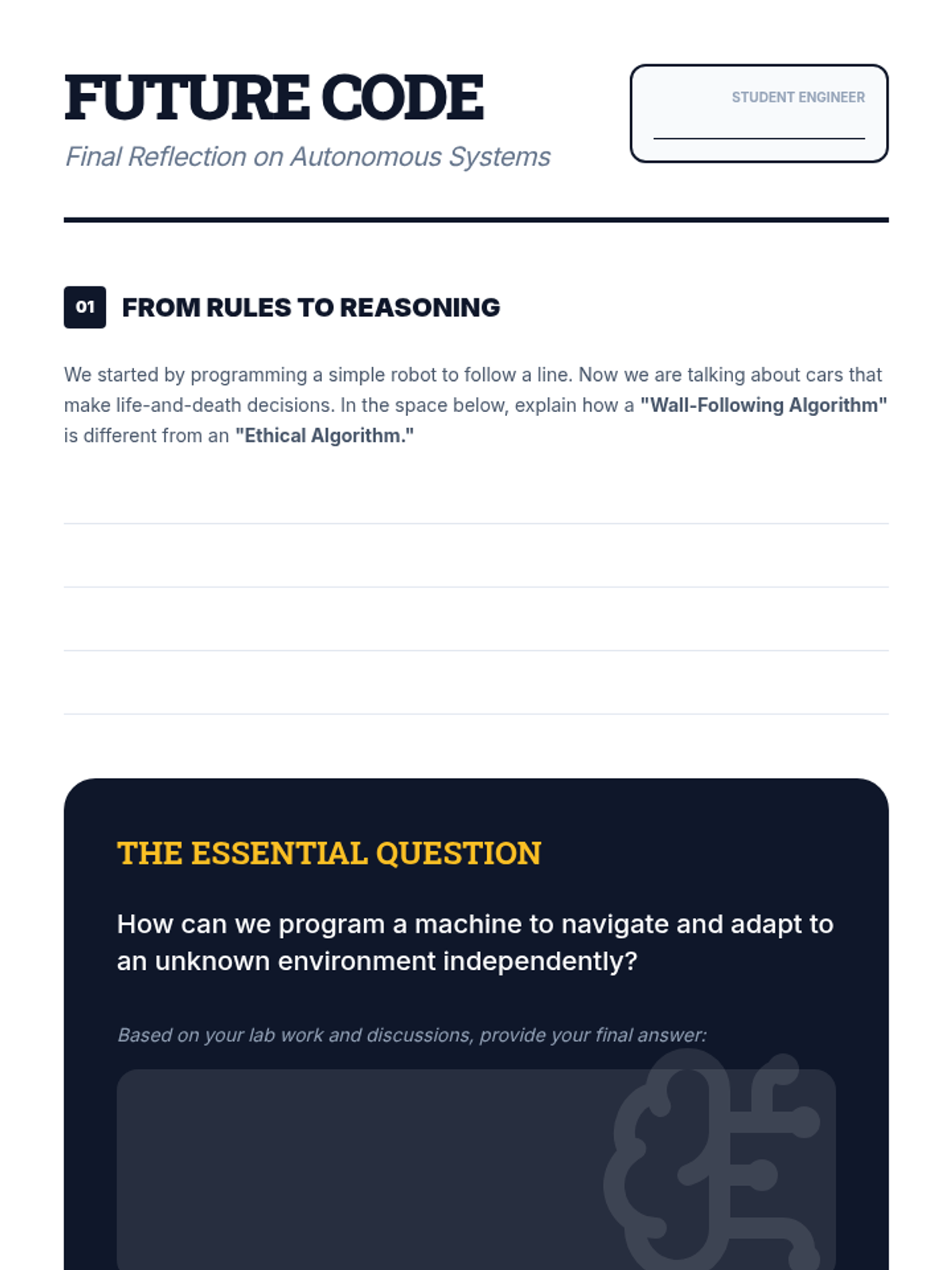 A 5-lesson sequence exploring the fundamentals of AI navigation in robotics, moving from simple automation to autonomous decision-making and ethical programming. Students build, program, and analyze robotic systems that navigate mazes and avoid obstacles using rule-based logic.