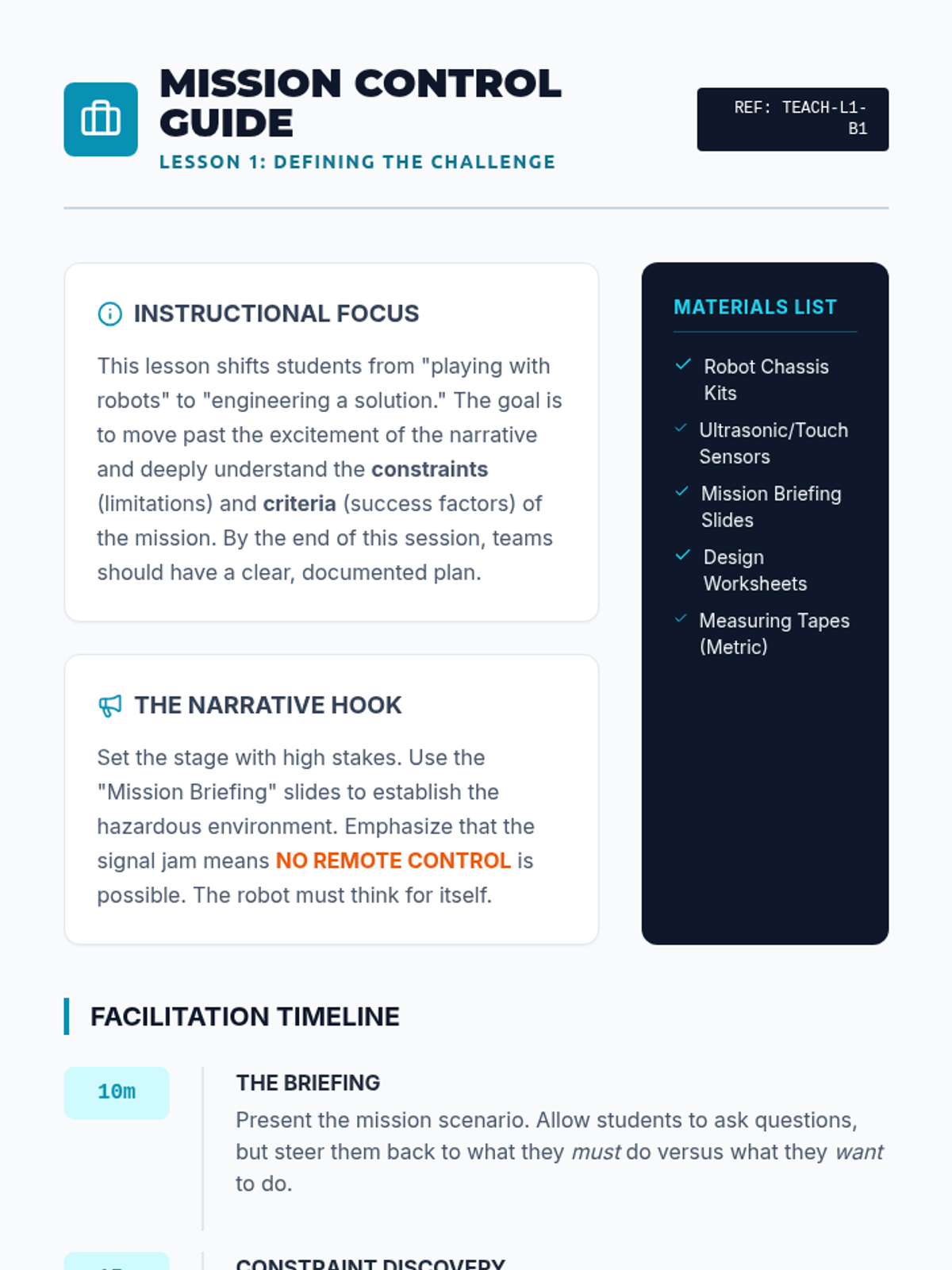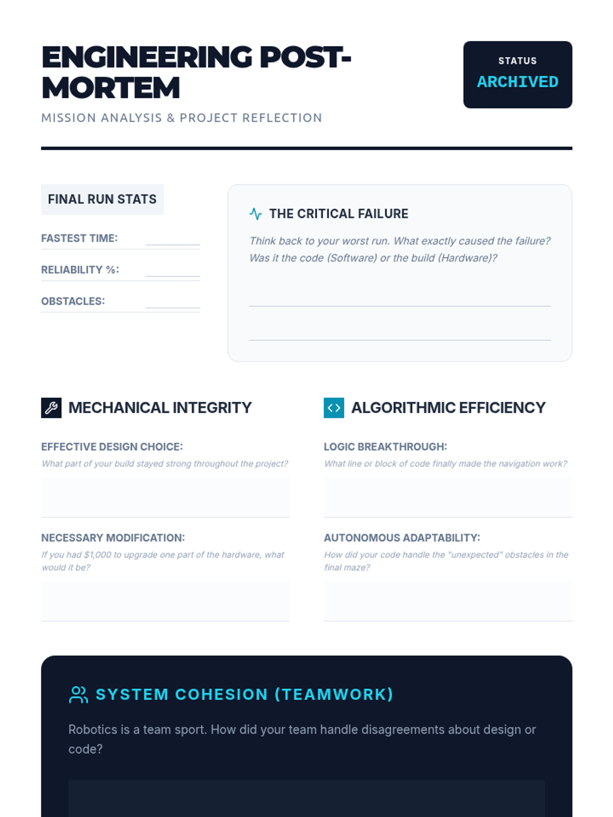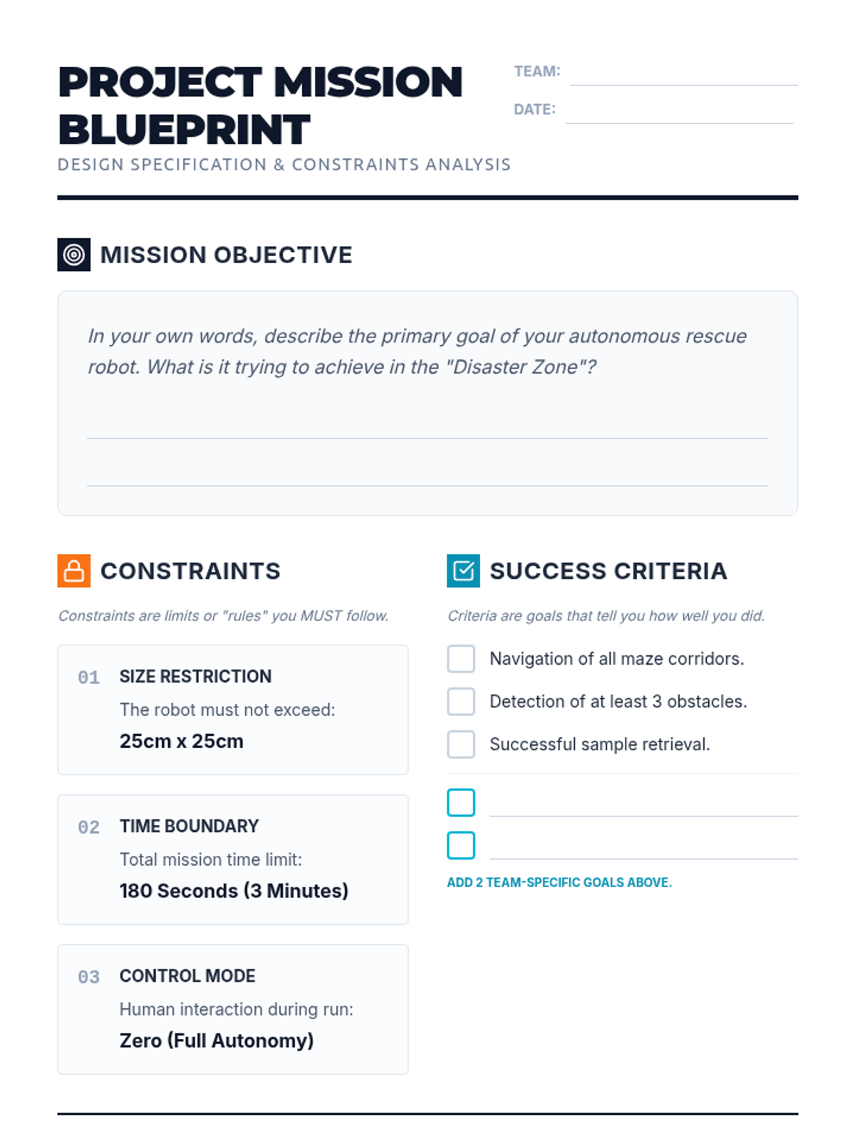 A comprehensive 5th-grade engineering sequence where students design, build, and code an autonomous rescue robot. Students follow the Engineering Design Process to navigate a complex environment, integrating mechanical systems with sensor-based logic.