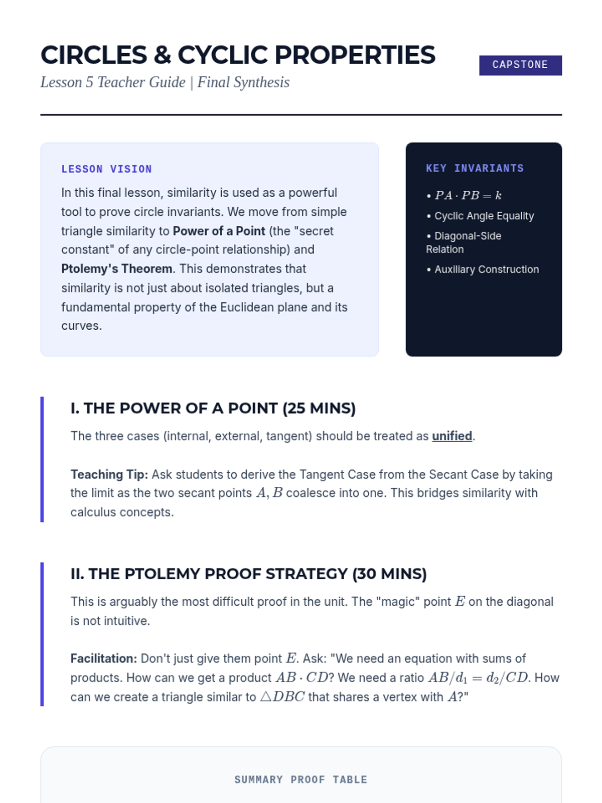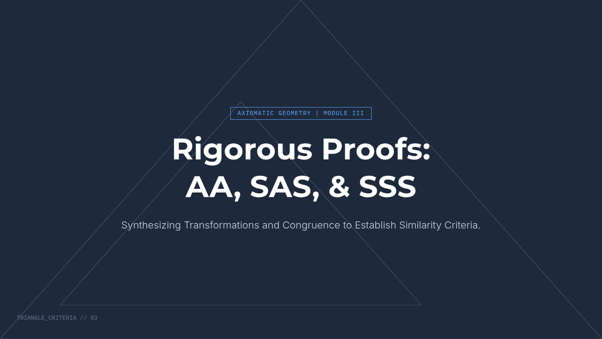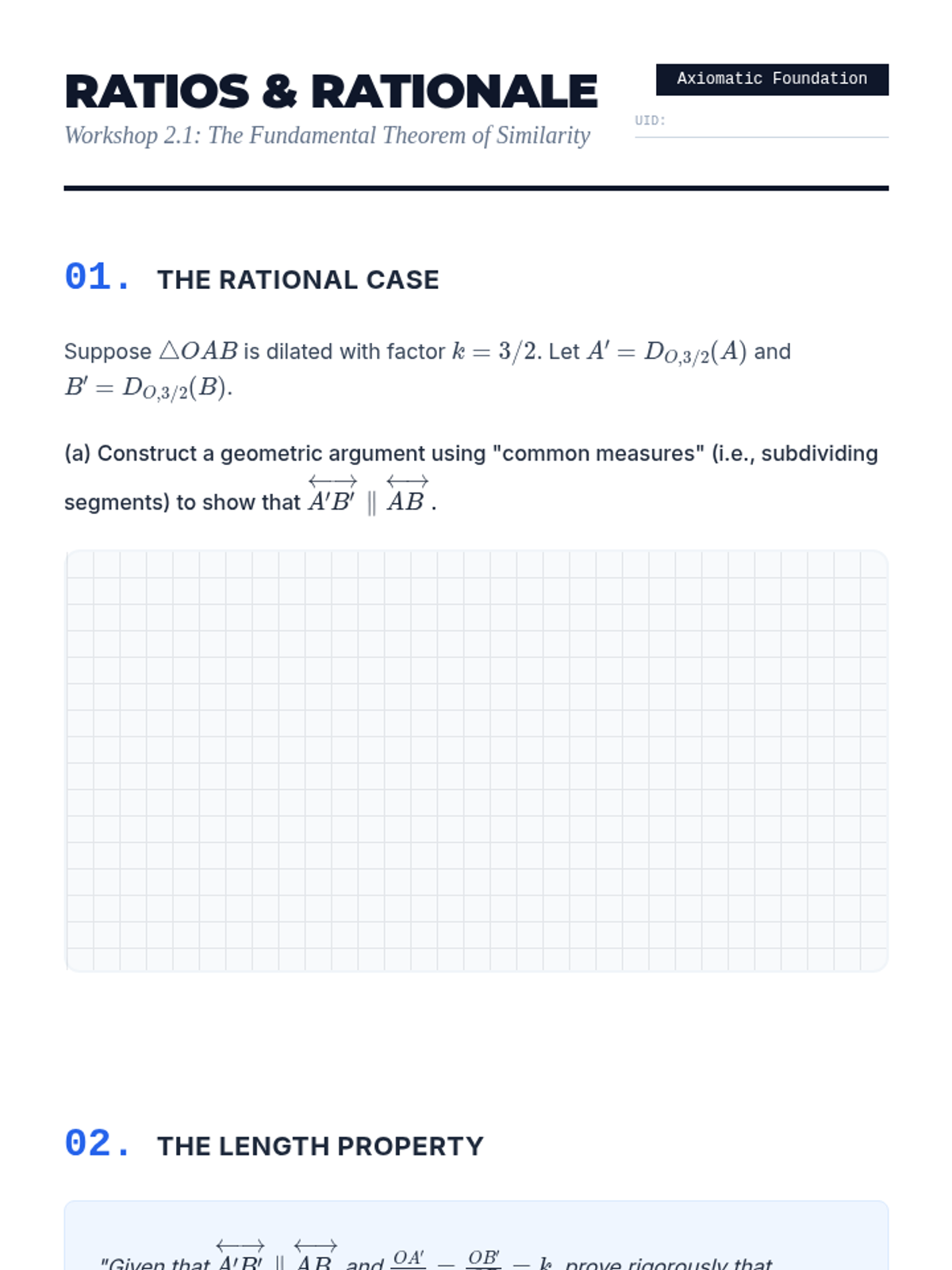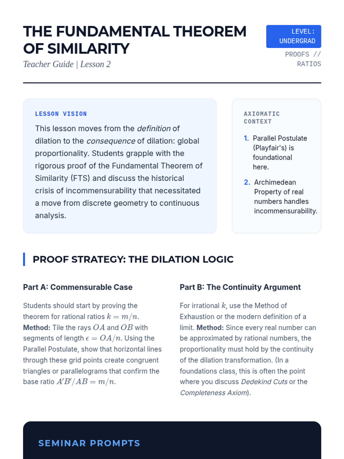 This undergraduate geometry sequence rigorously explores the axiomatic foundations of similarity, bridging the gap between transformational geometry and Euclidean proofs. Students move from the formal definition of dilations to proving major theorems like the Fundamental Theorem of Similarity, AA/SAS/SSS criteria, and advanced circle applications like Ptolemy's Theorem.