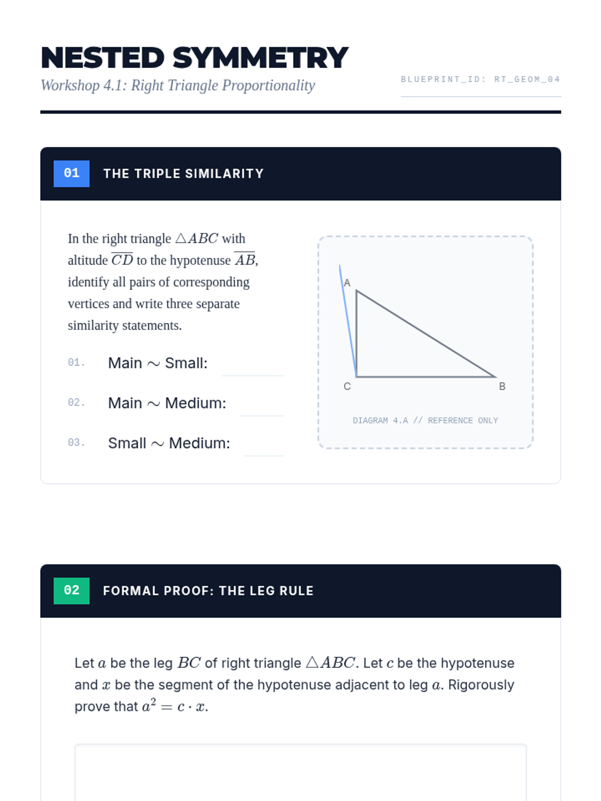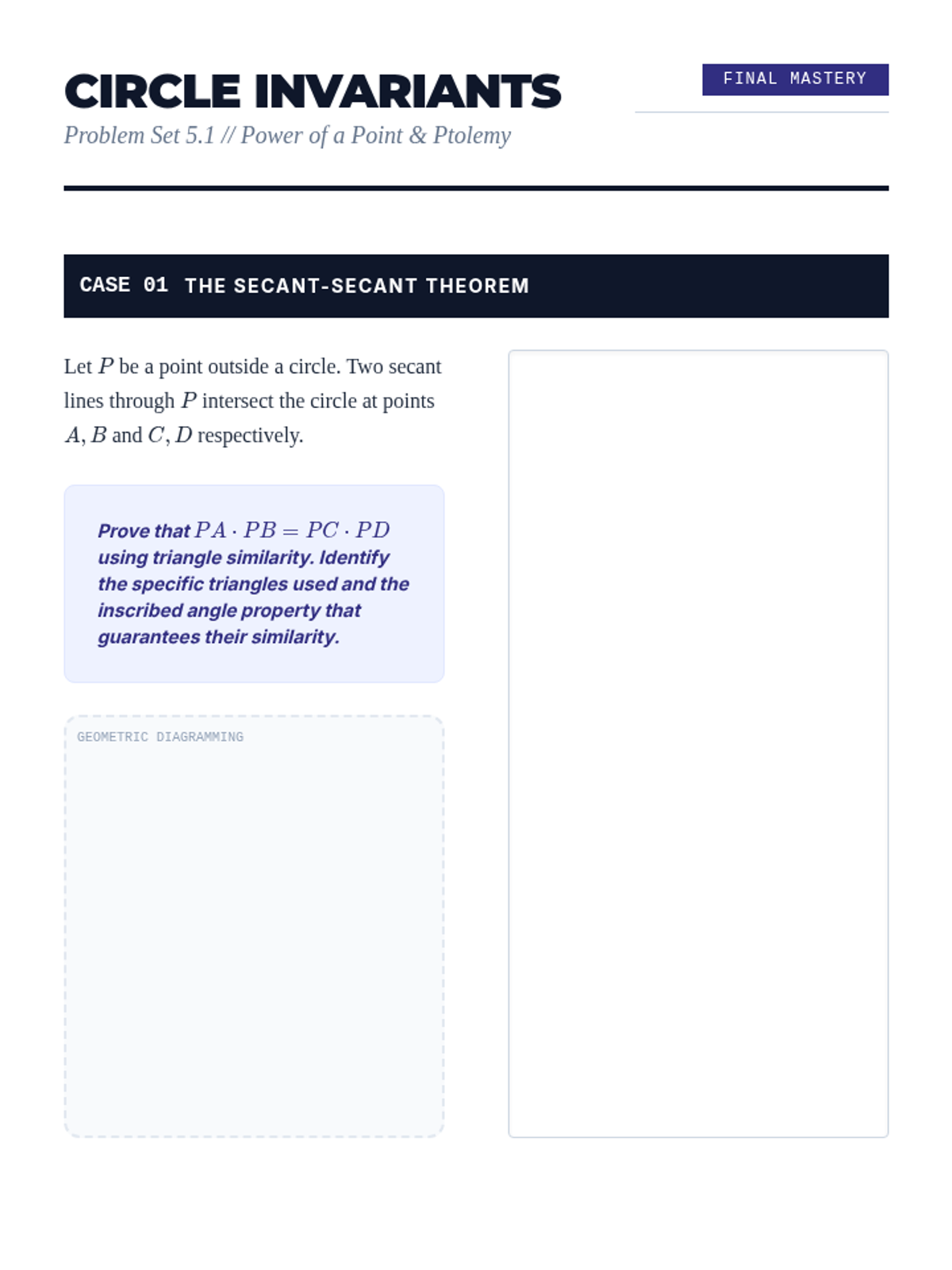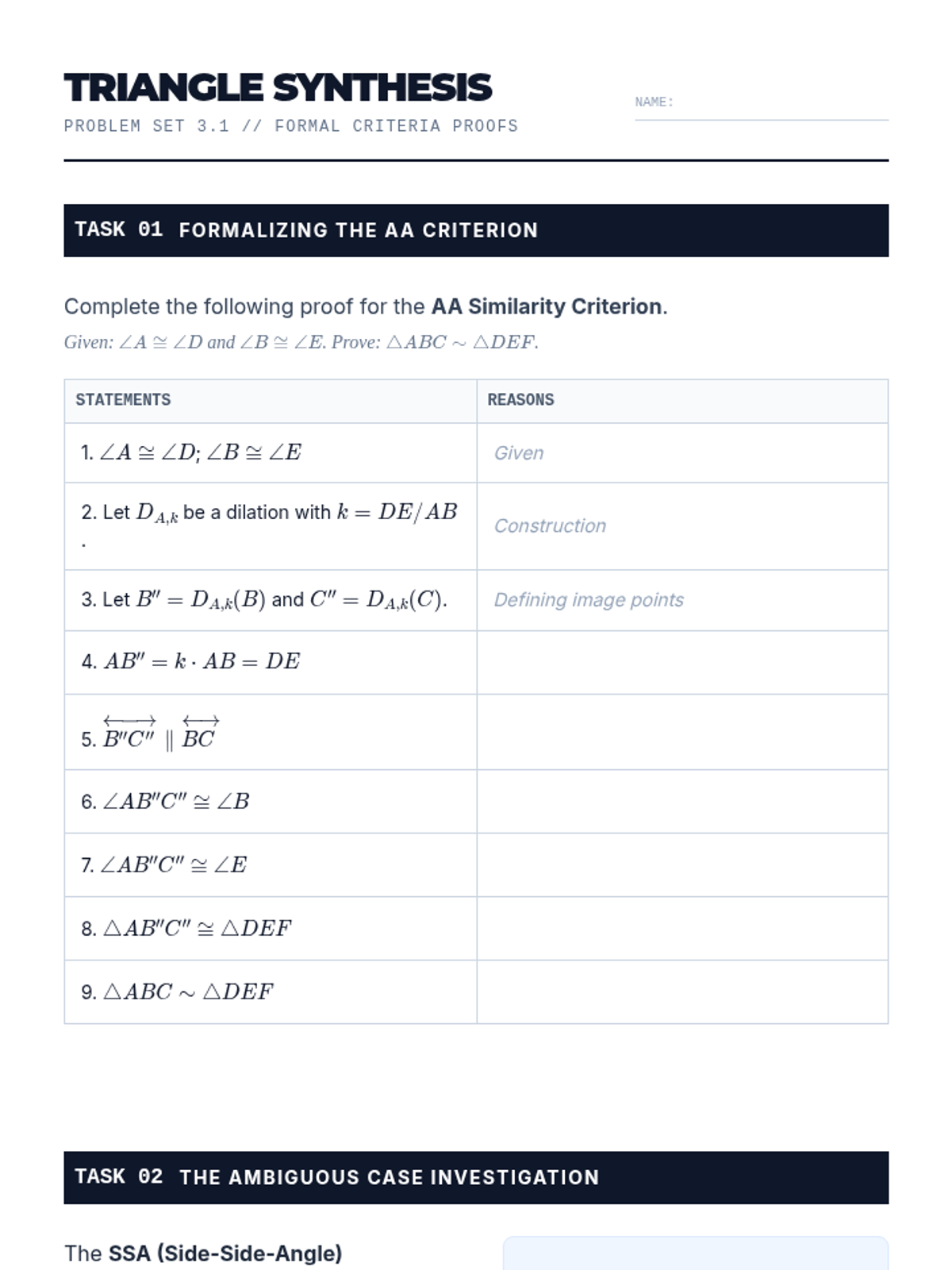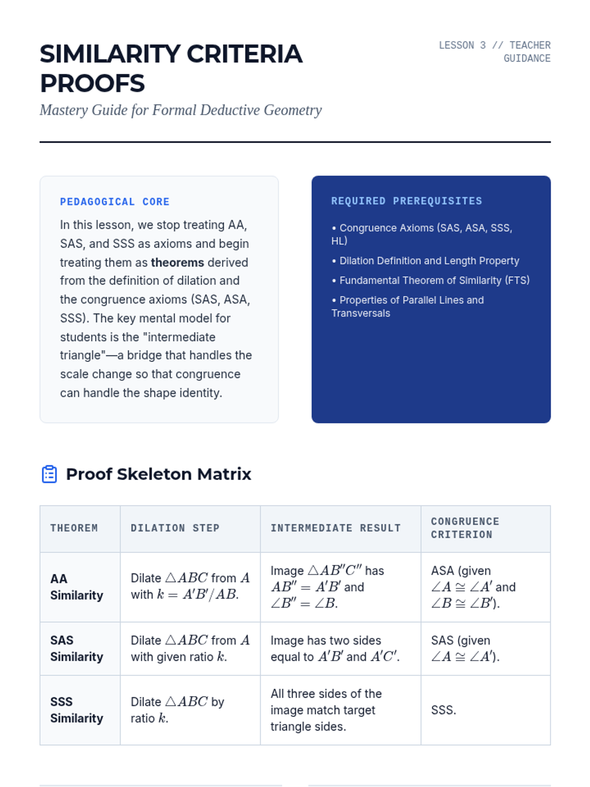 This undergraduate geometry sequence rigorously explores the axiomatic foundations of similarity, bridging the gap between transformational geometry and Euclidean proofs. Students move from the formal definition of dilations to proving major theorems like the Fundamental Theorem of Similarity, AA/SAS/SSS criteria, and advanced circle applications like Ptolemy's Theorem.