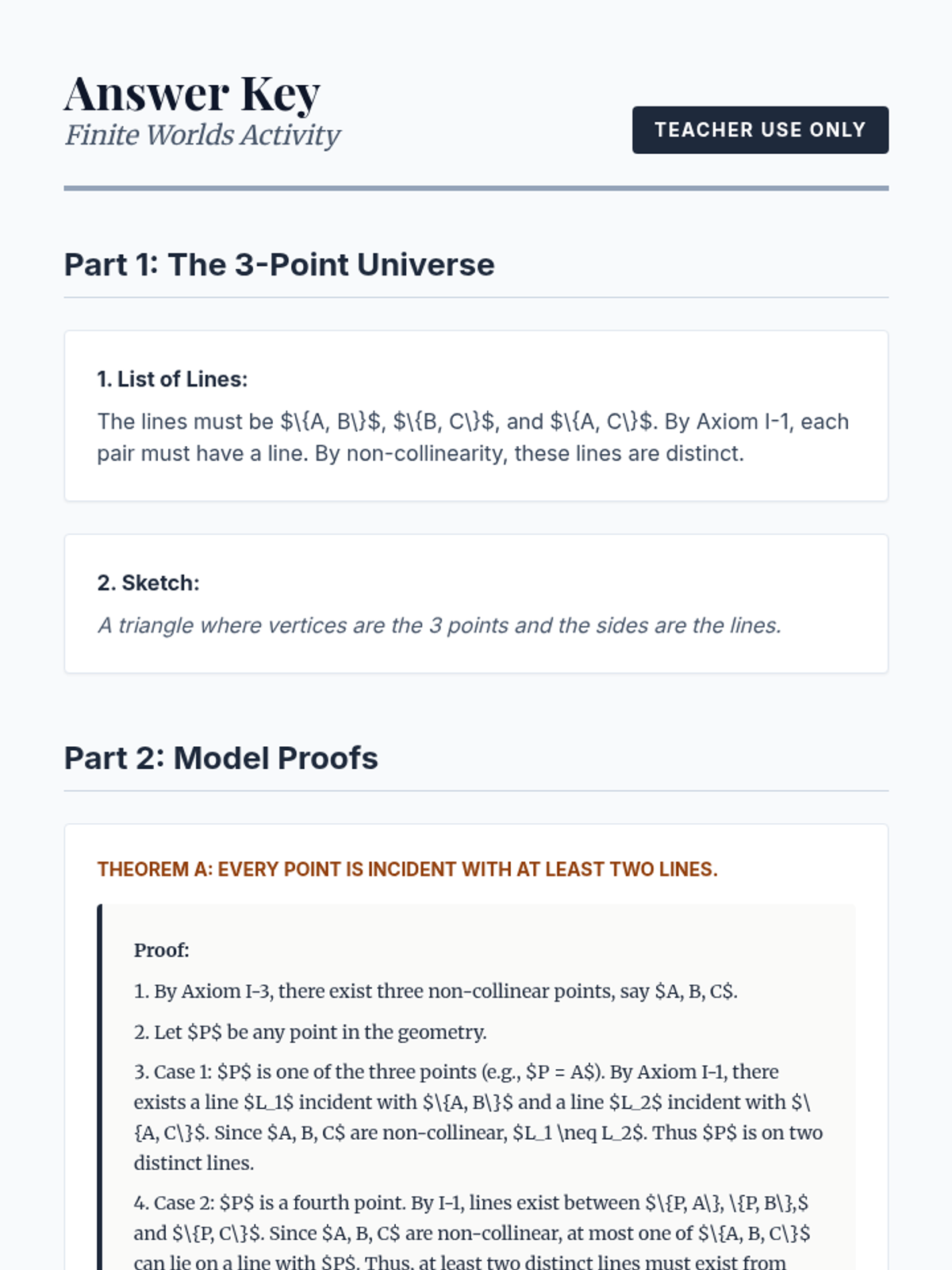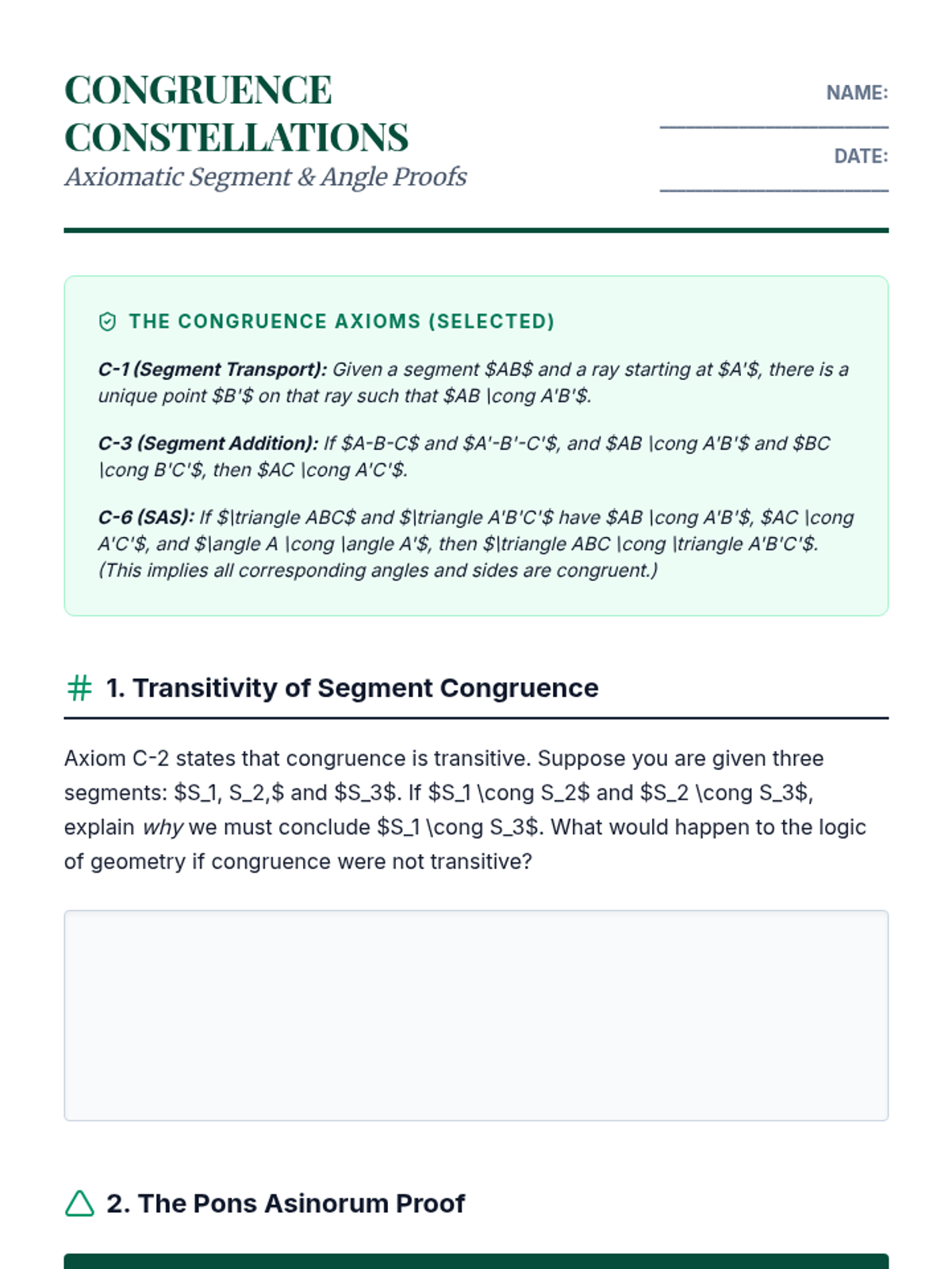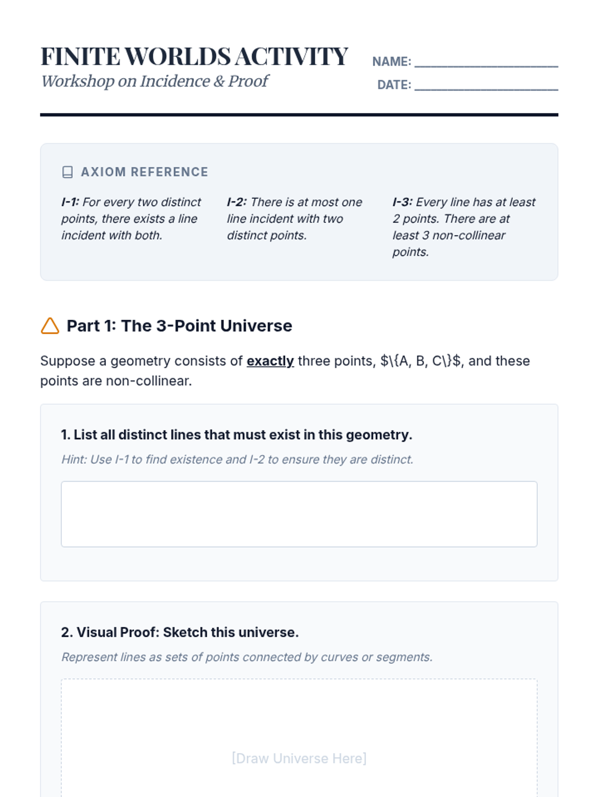 This undergraduate geometry sequence bridges the gap between high school intuition and formal mathematical rigor. Students transition from Euclid's historical 'Elements' to Hilbert's modern axiomatic system, learning to prove theorems about incidence, betweenness, and congruence while eliminating reliance on visual 'obviousness'.