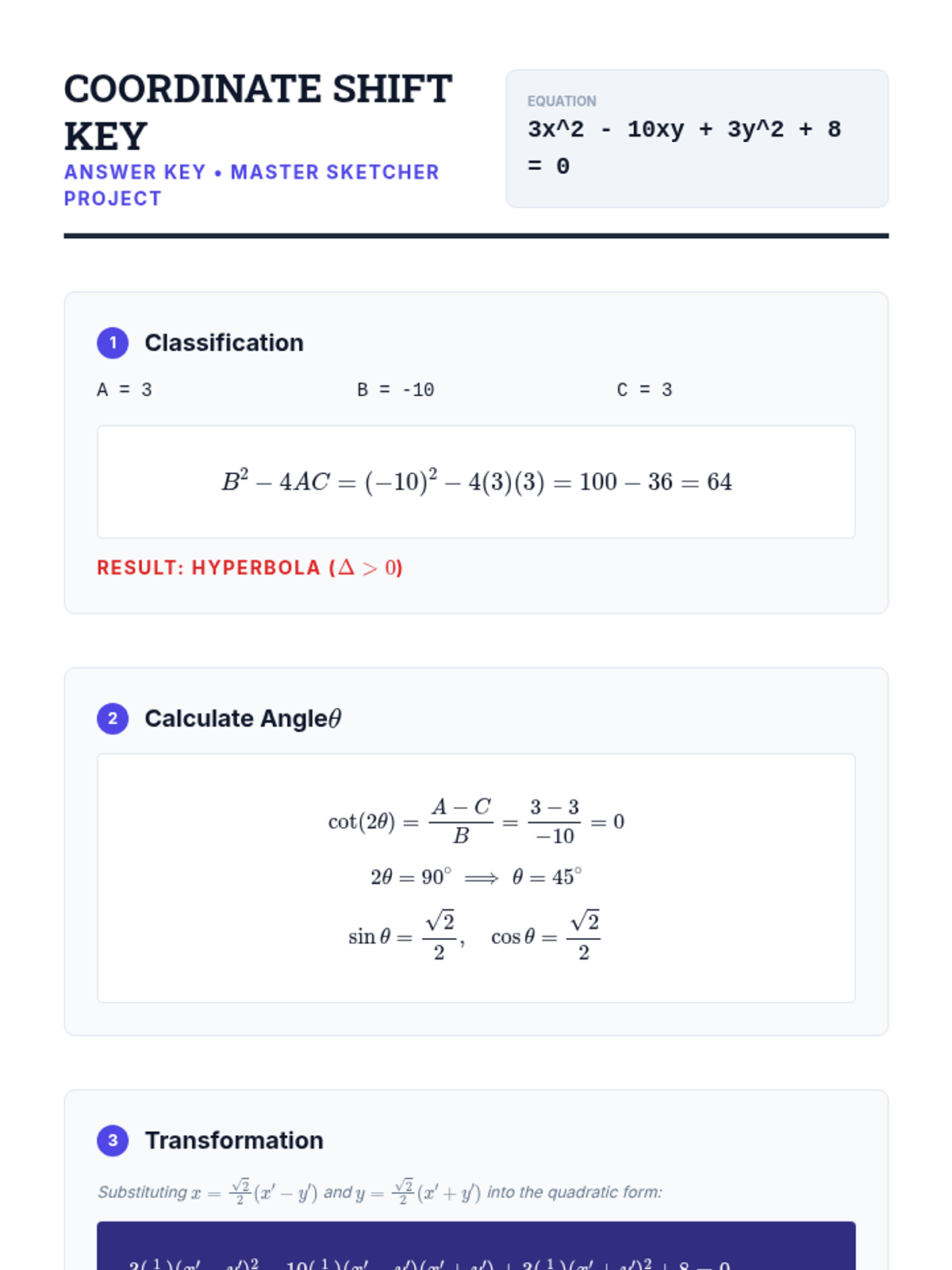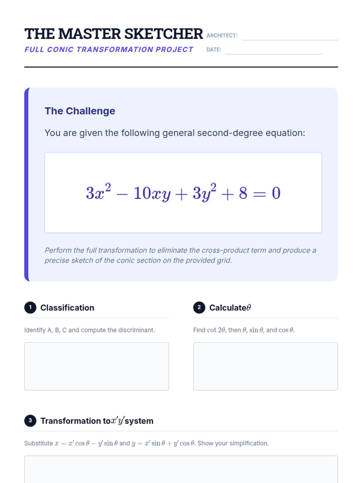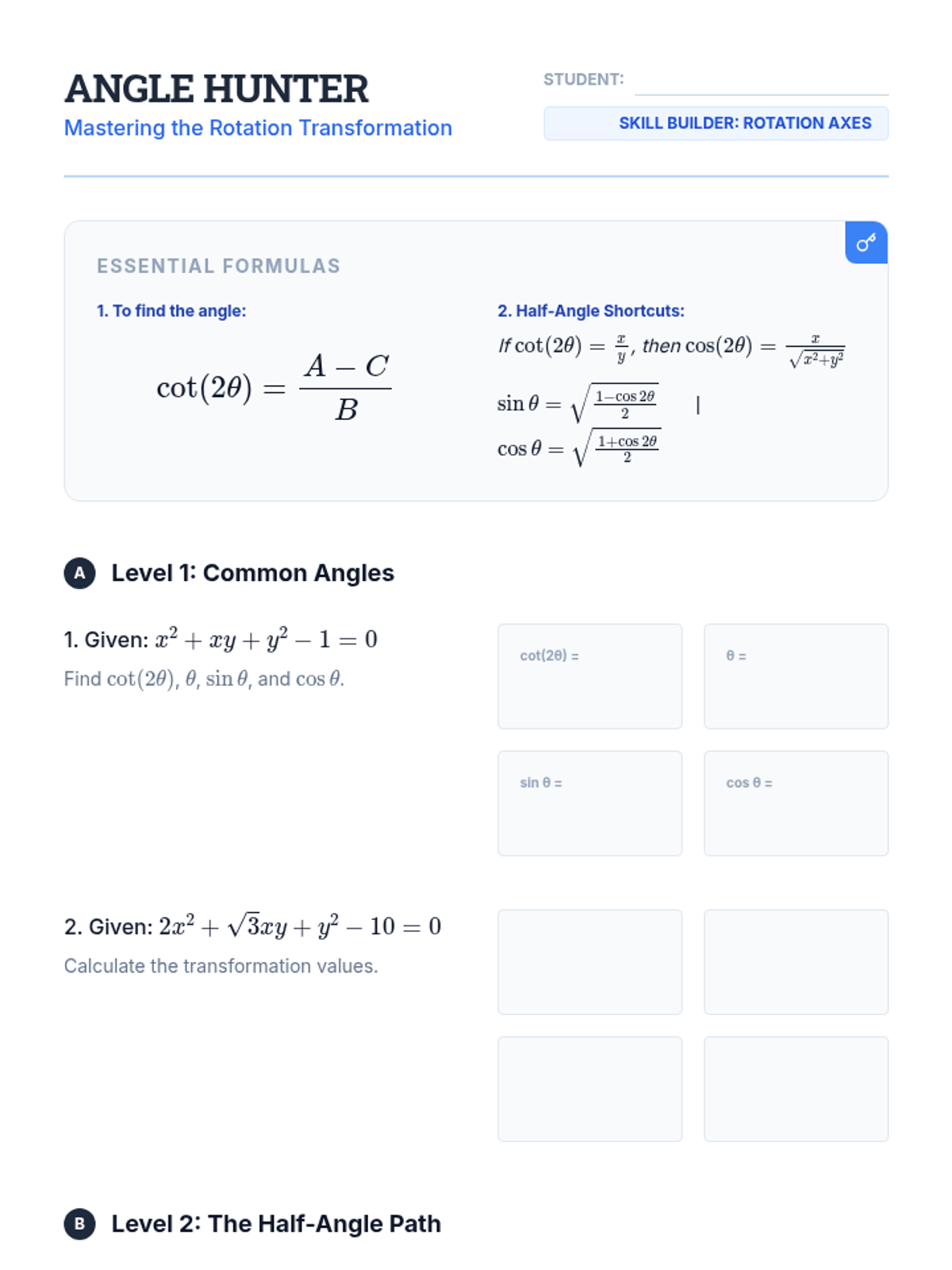 An advanced exploration of the general second-degree equation, focusing on identifying, rotating, and graphing conics with cross-product terms using both trigonometric and matrix methods.