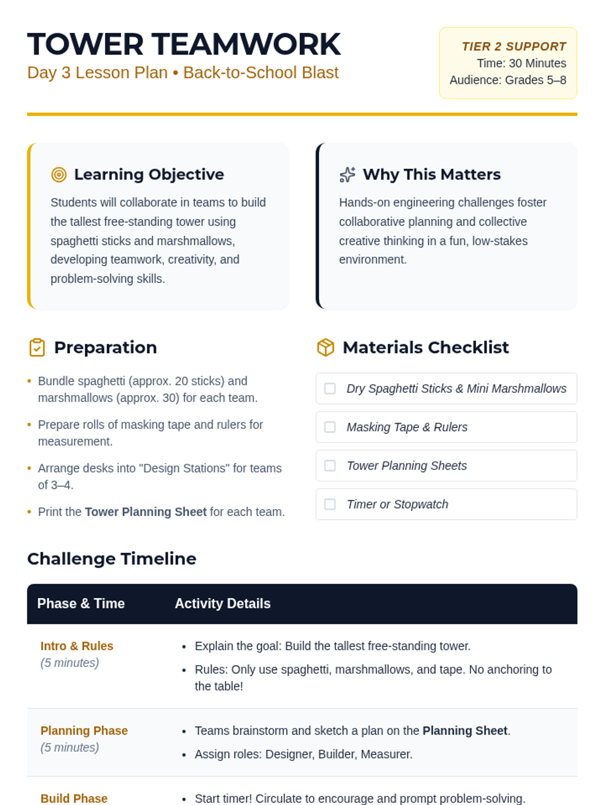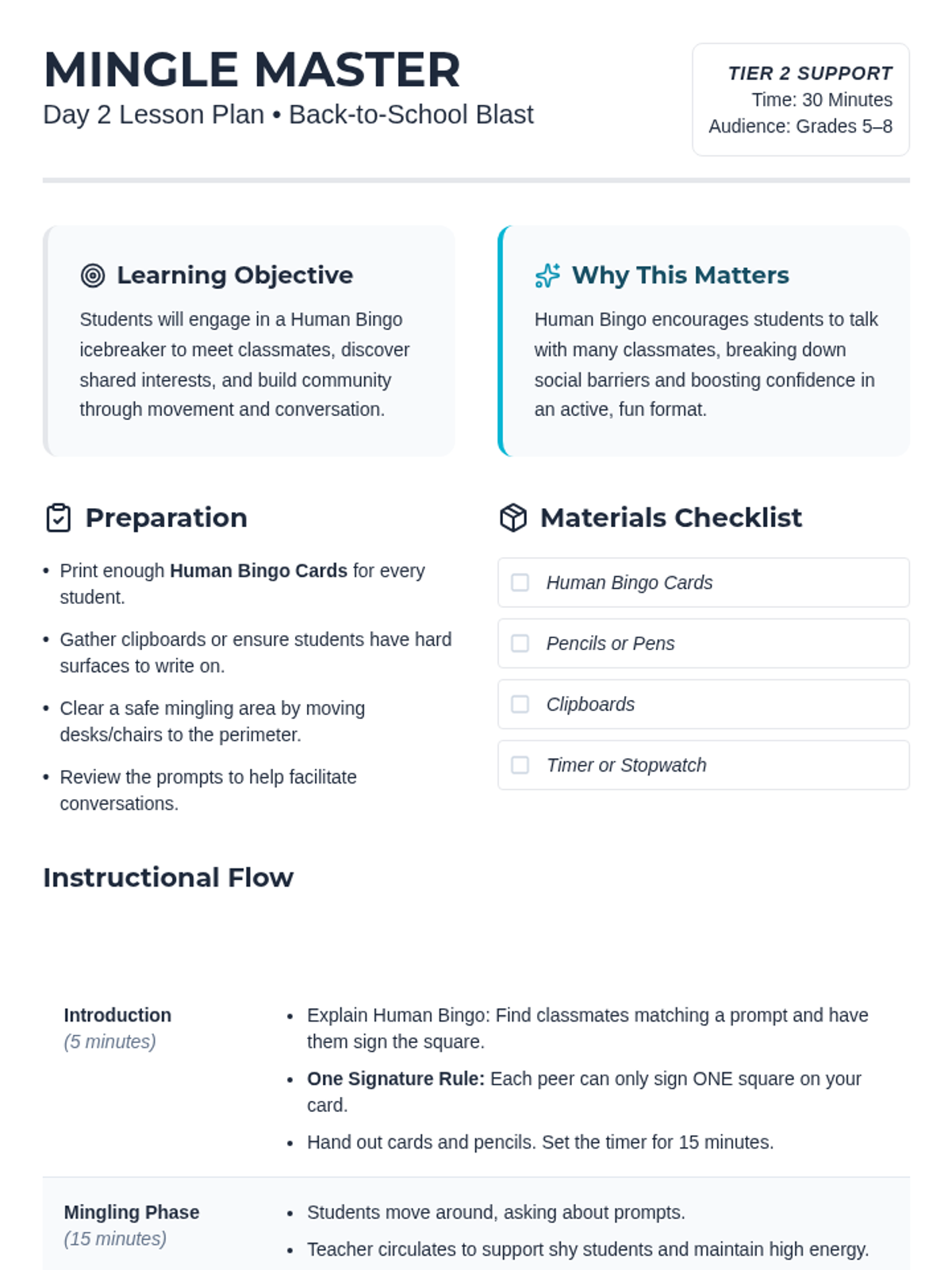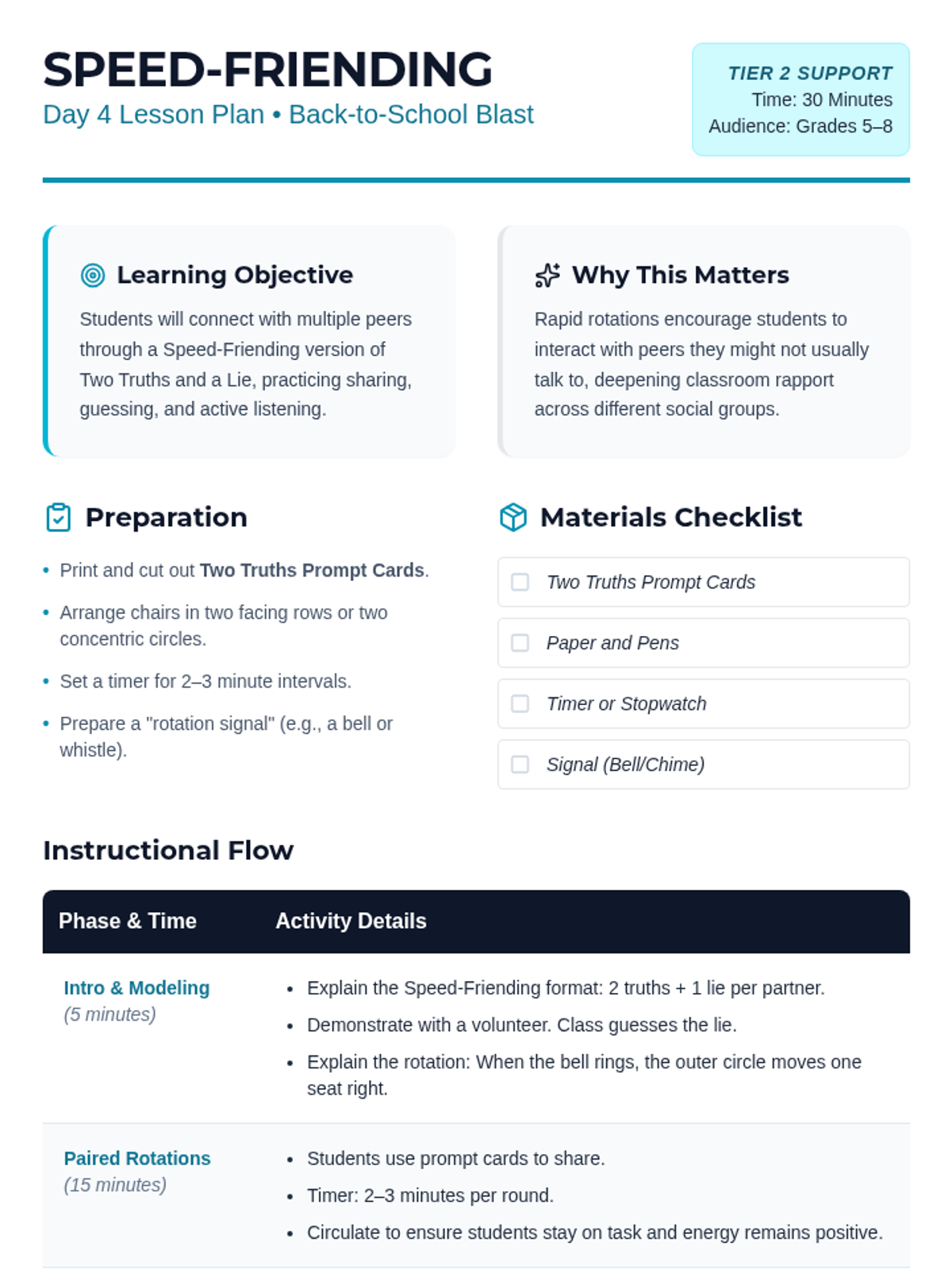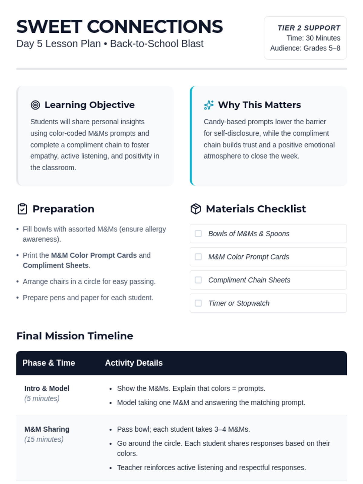 A 5-day series of 30-minute icebreaker sessions for middle schoolers to build rapport, communication, and a positive classroom atmosphere through Tier 2 group supports.