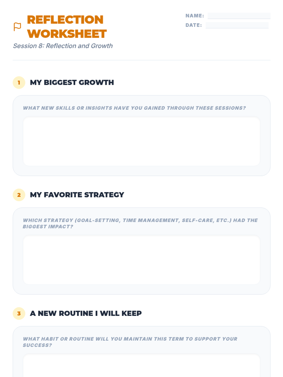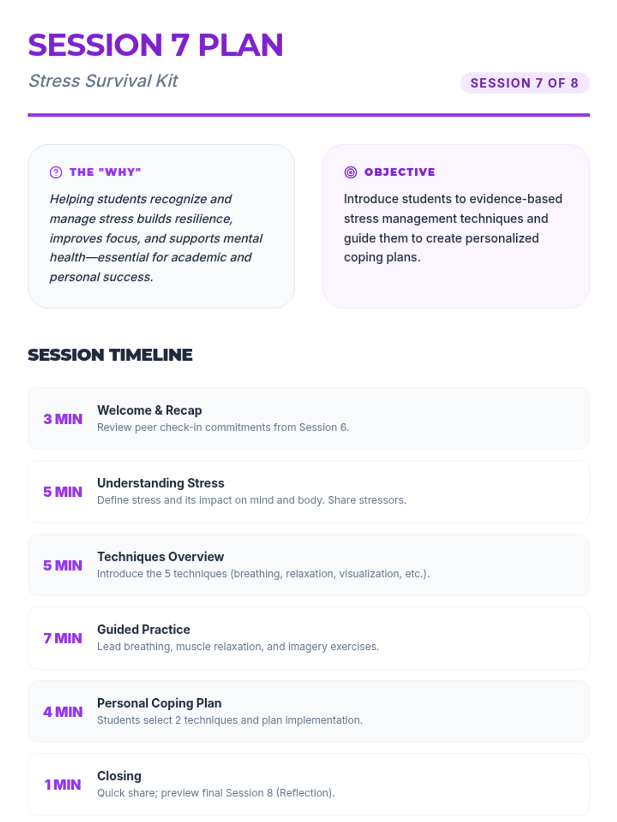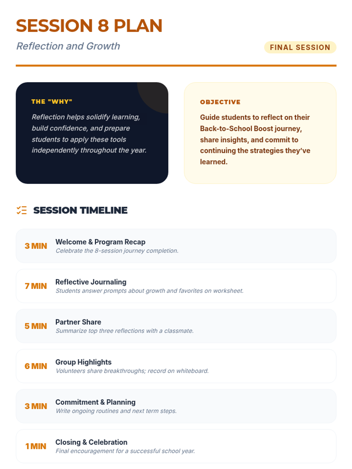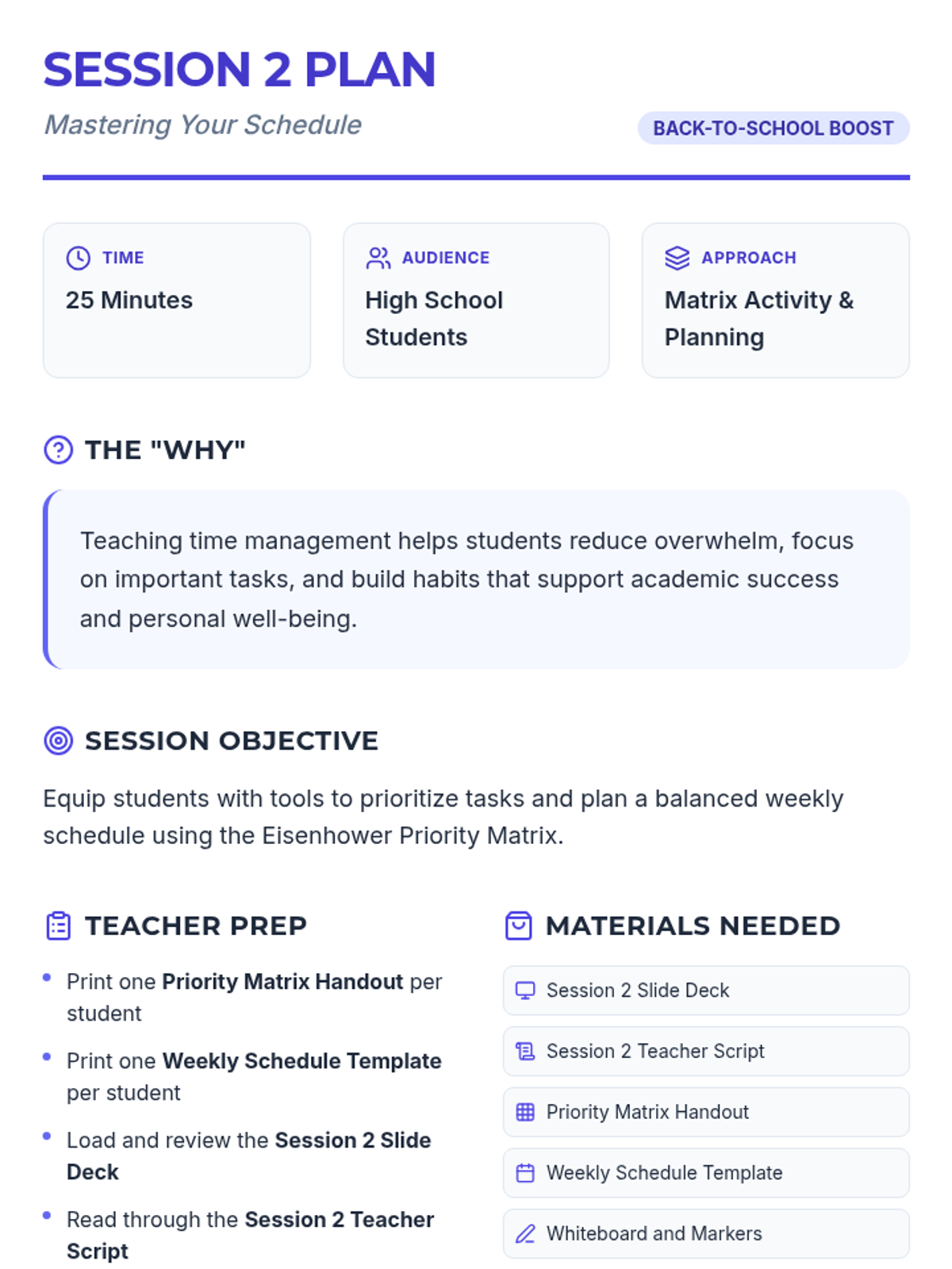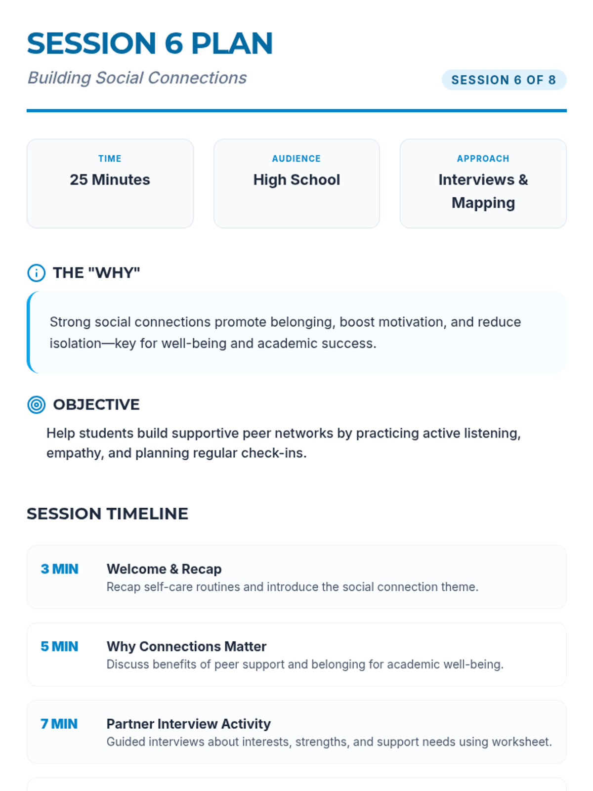 A dynamic 8-session program to help high school students transition back to school by building routines, confidence, and social connections. This Tier 1 program equips students with strategies for time management, goal setting, organization, study habits, and self-care.