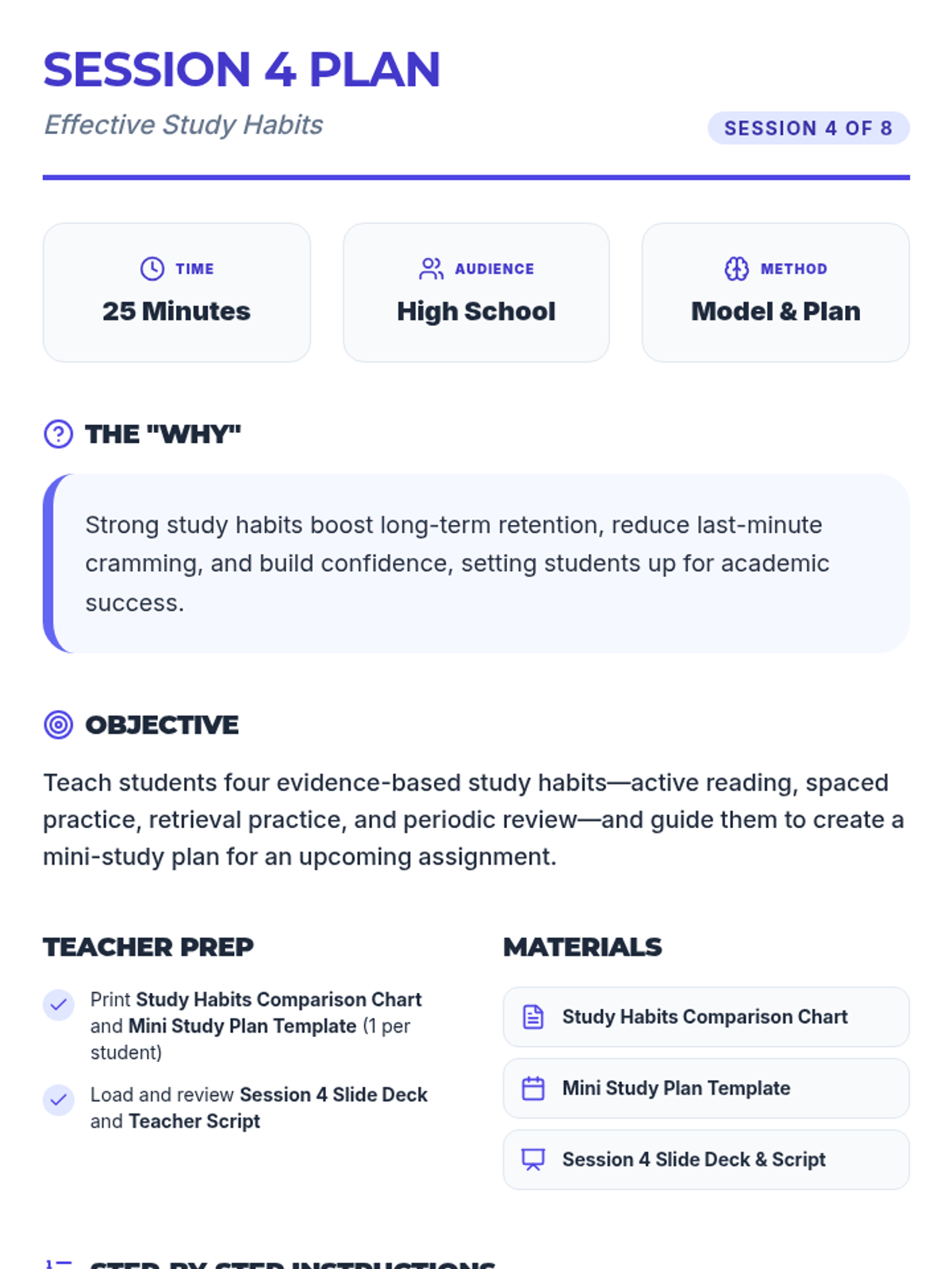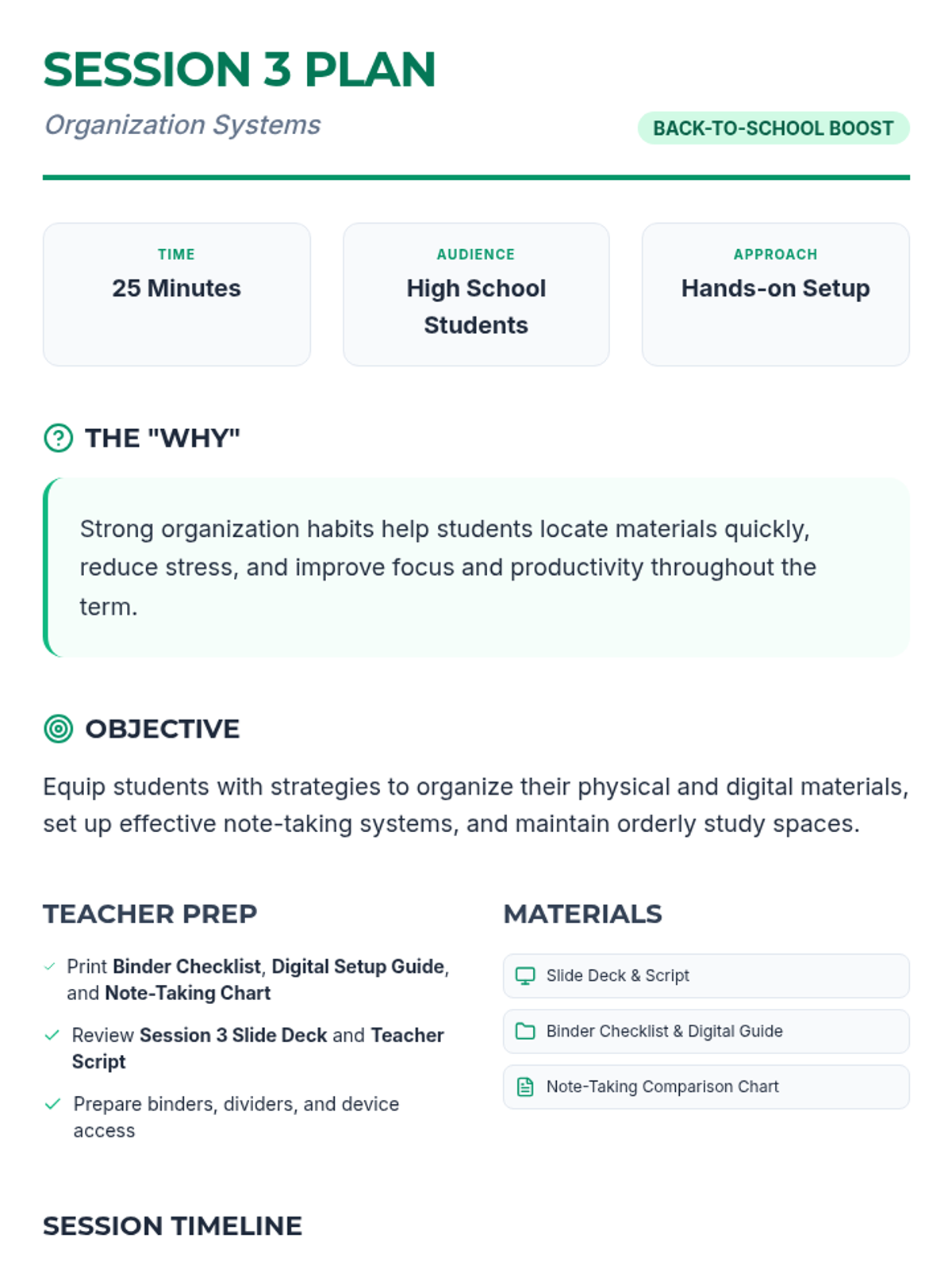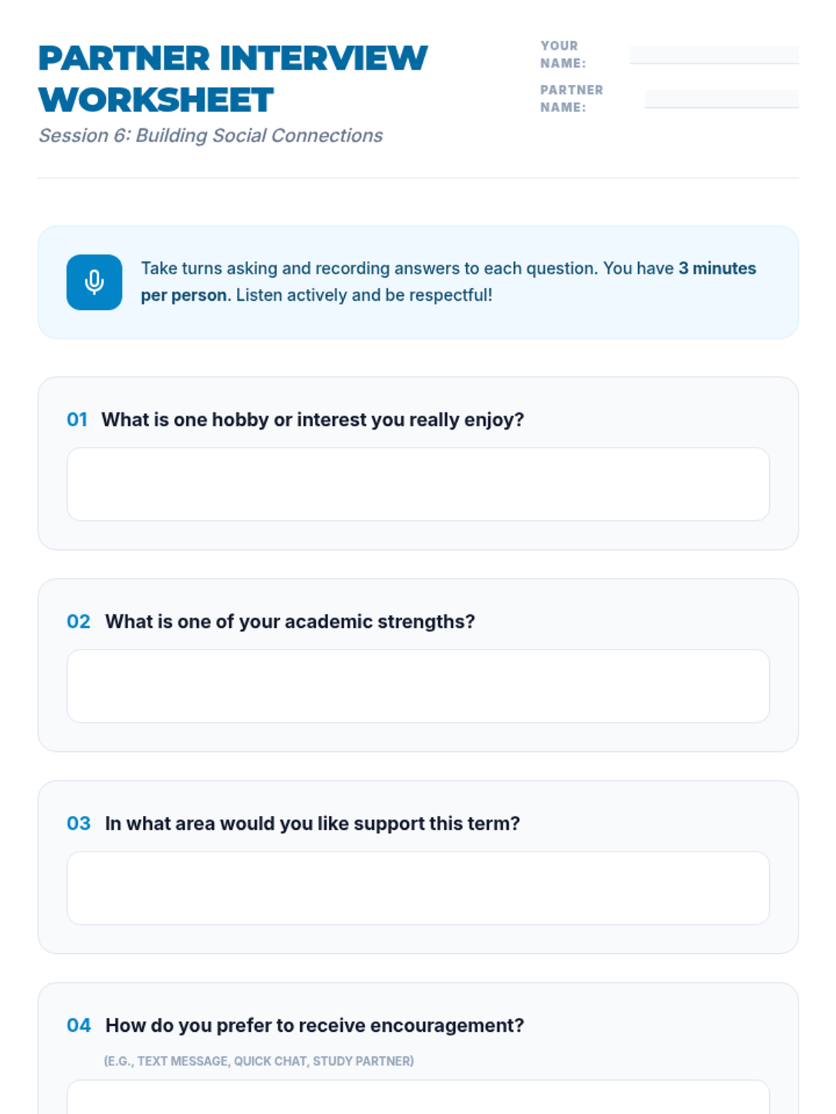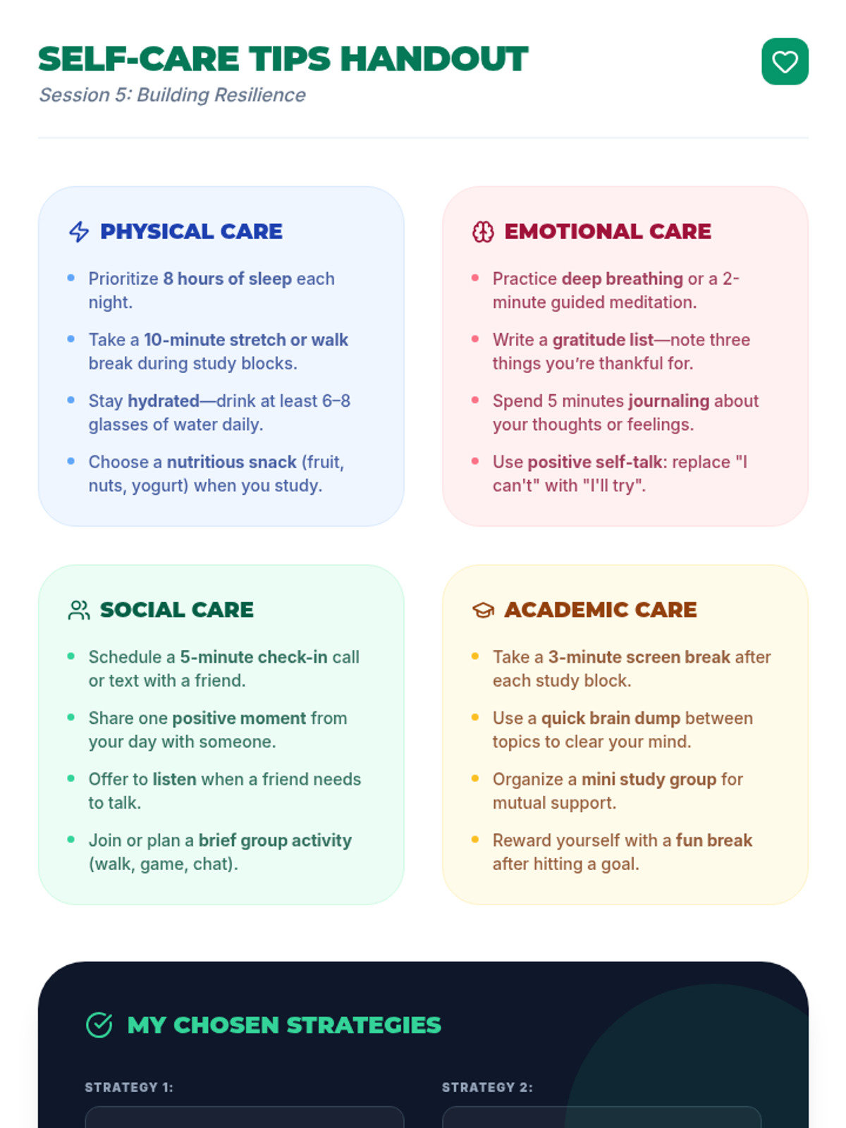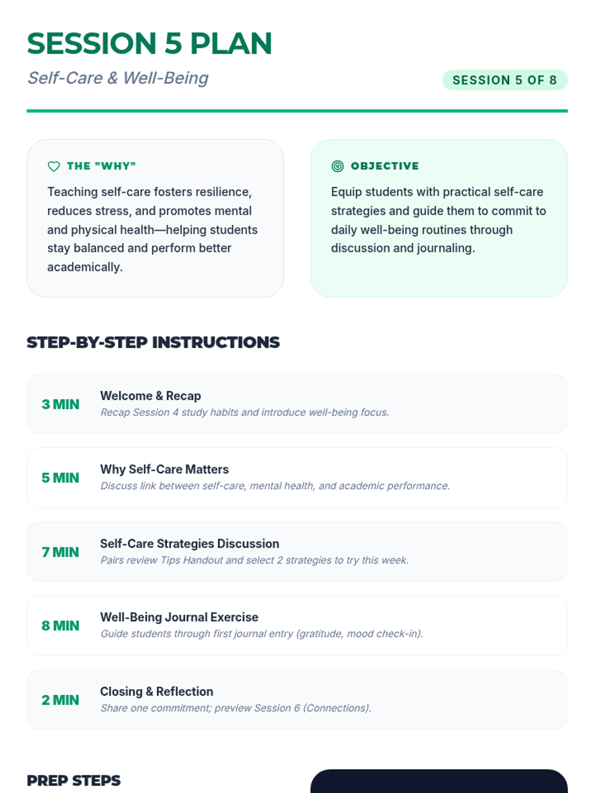 A dynamic 8-session program to help high school students transition back to school by building routines, confidence, and social connections. This Tier 1 program equips students with strategies for time management, goal setting, organization, study habits, and self-care.