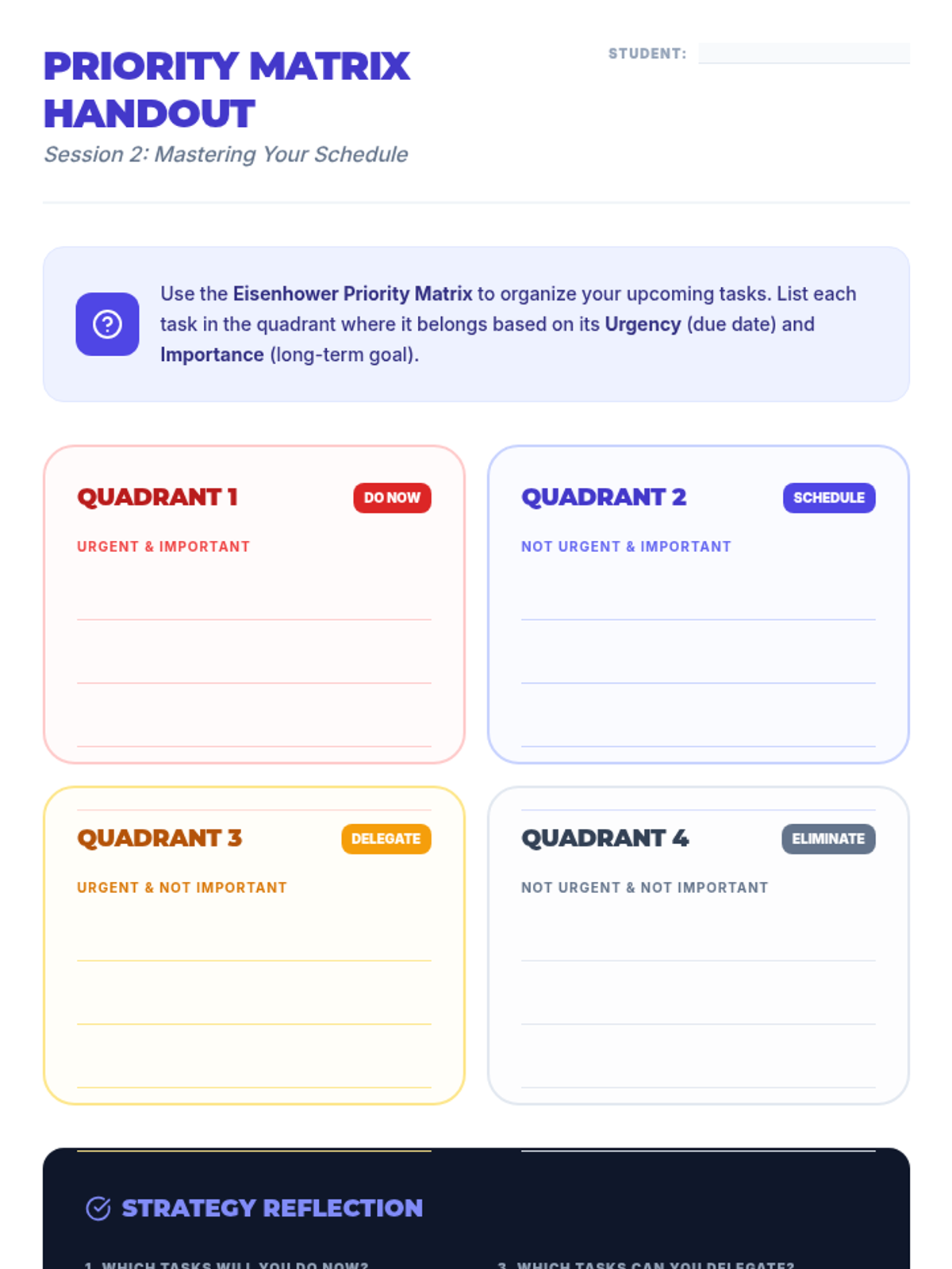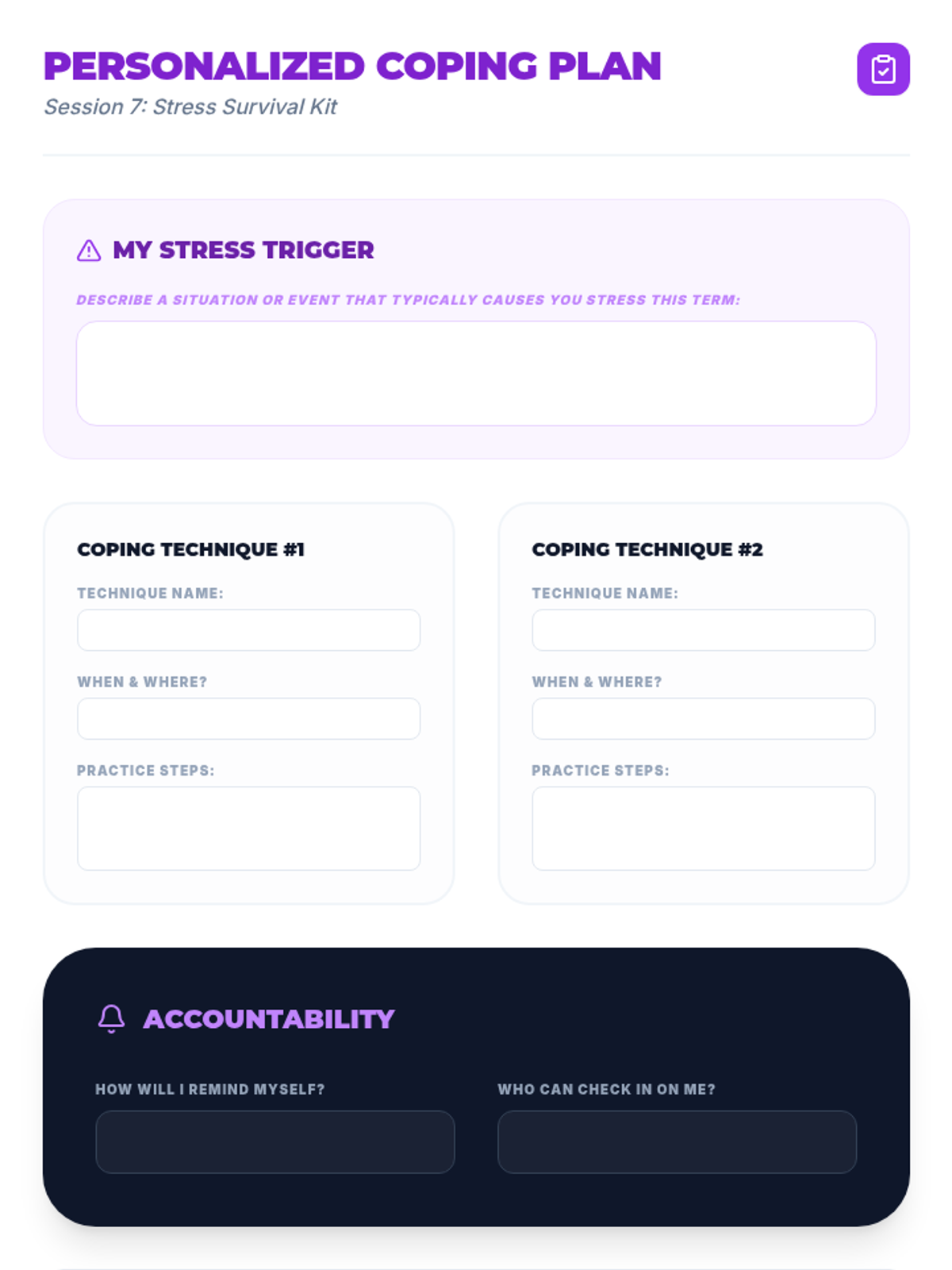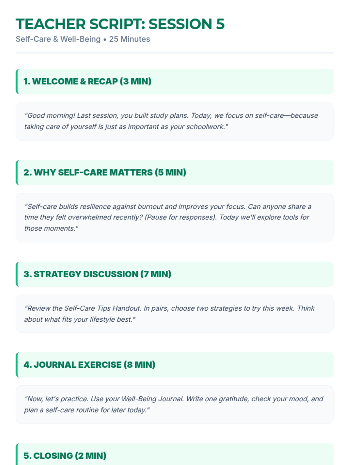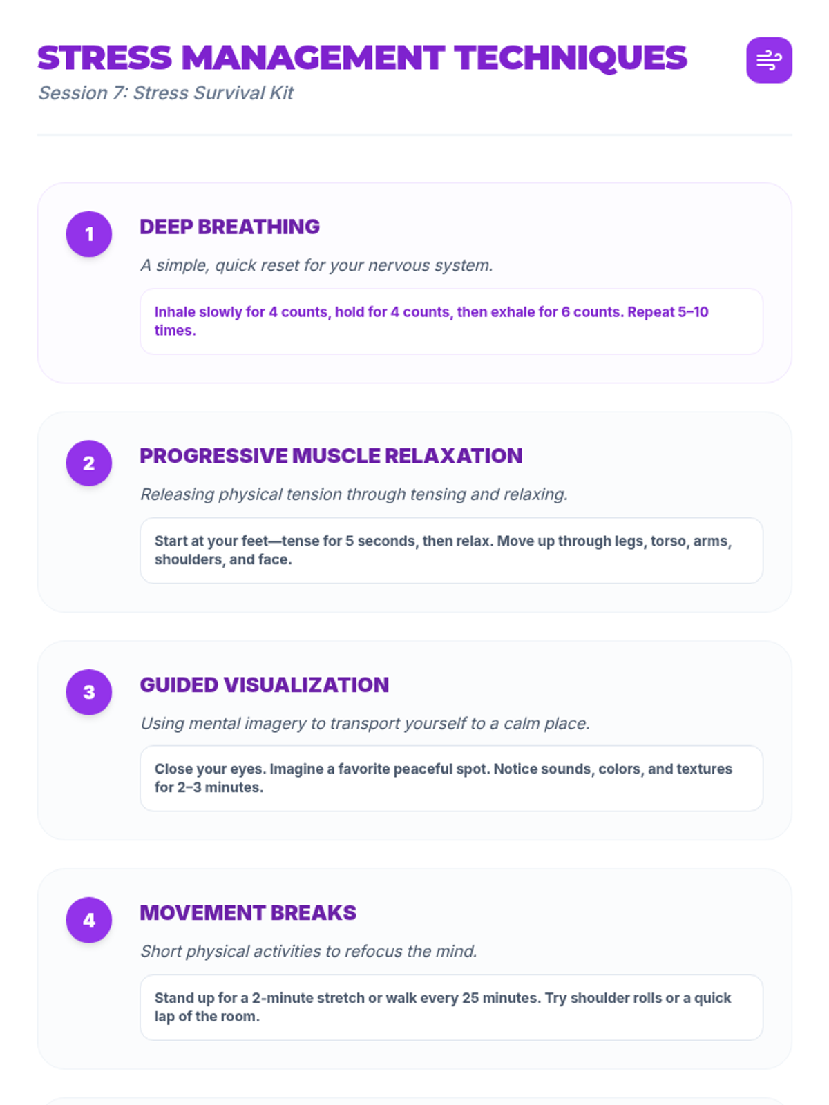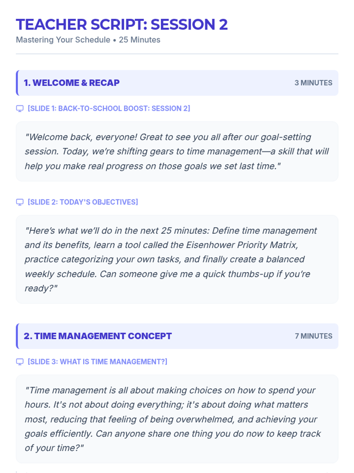 A dynamic 8-session program to help high school students transition back to school by building routines, confidence, and social connections. This Tier 1 program equips students with strategies for time management, goal setting, organization, study habits, and self-care.