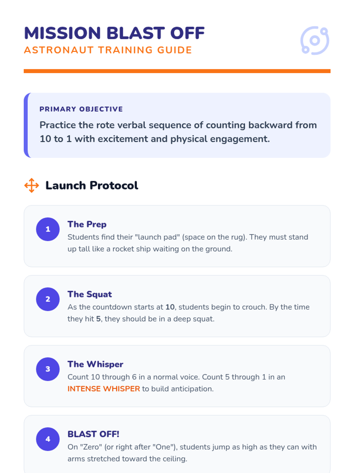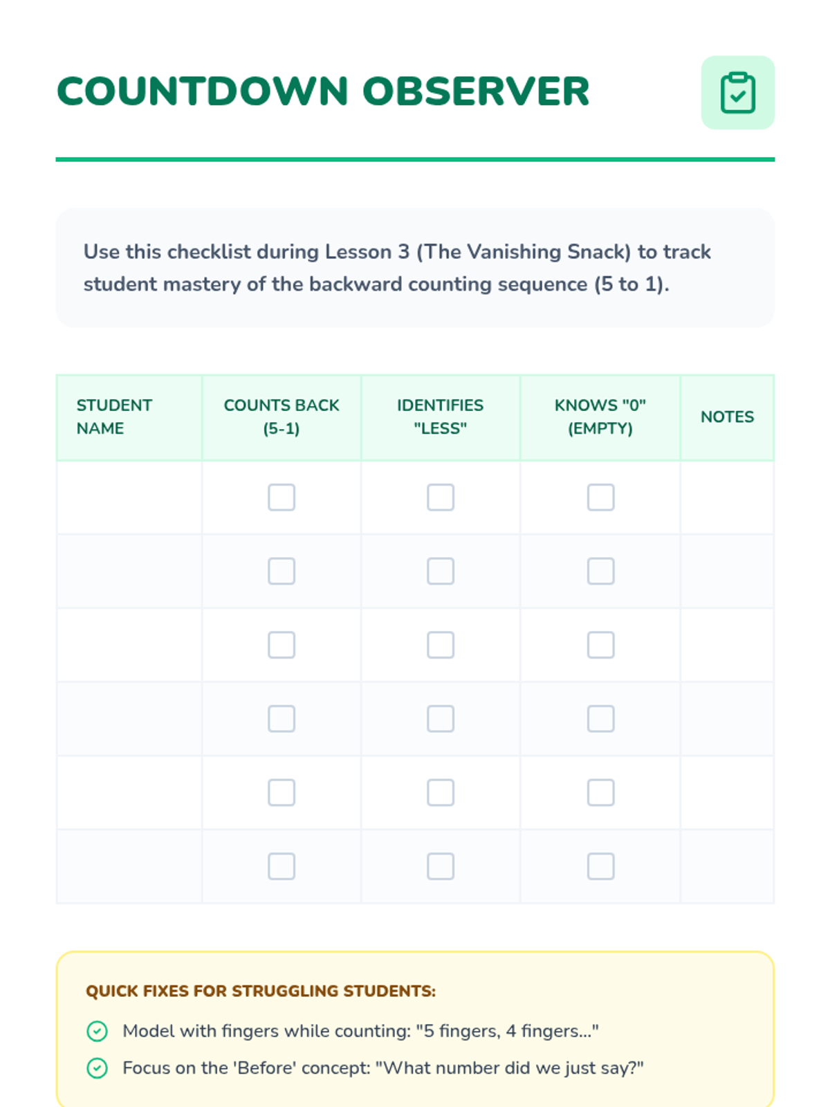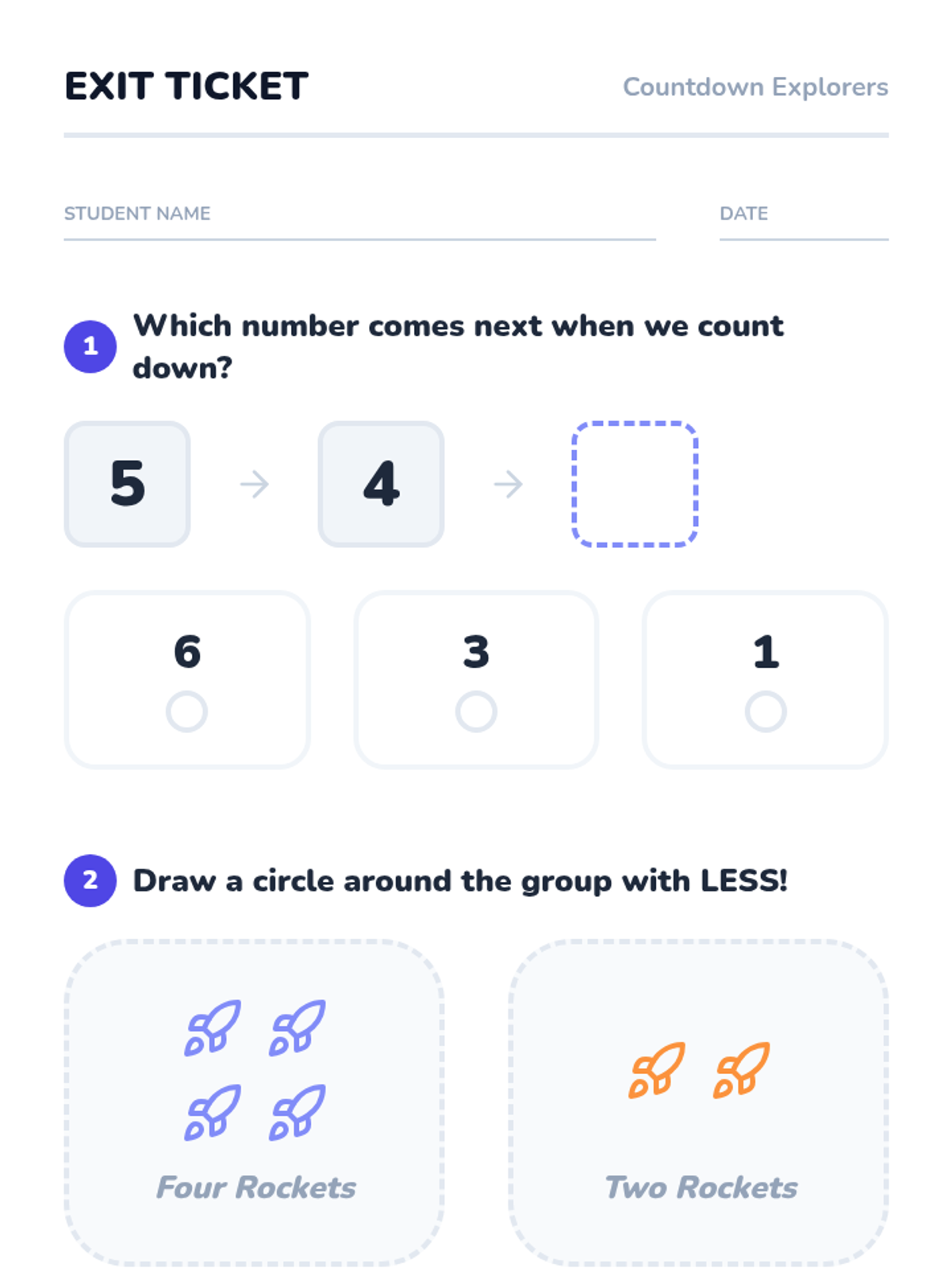A Pre-K math sequence focused on backward counting from 5 and 10 using engaging simulations like rocket launches, disappearing snacks, and songs. Students explore the concept of decreasing quantity and prepare for subtraction.