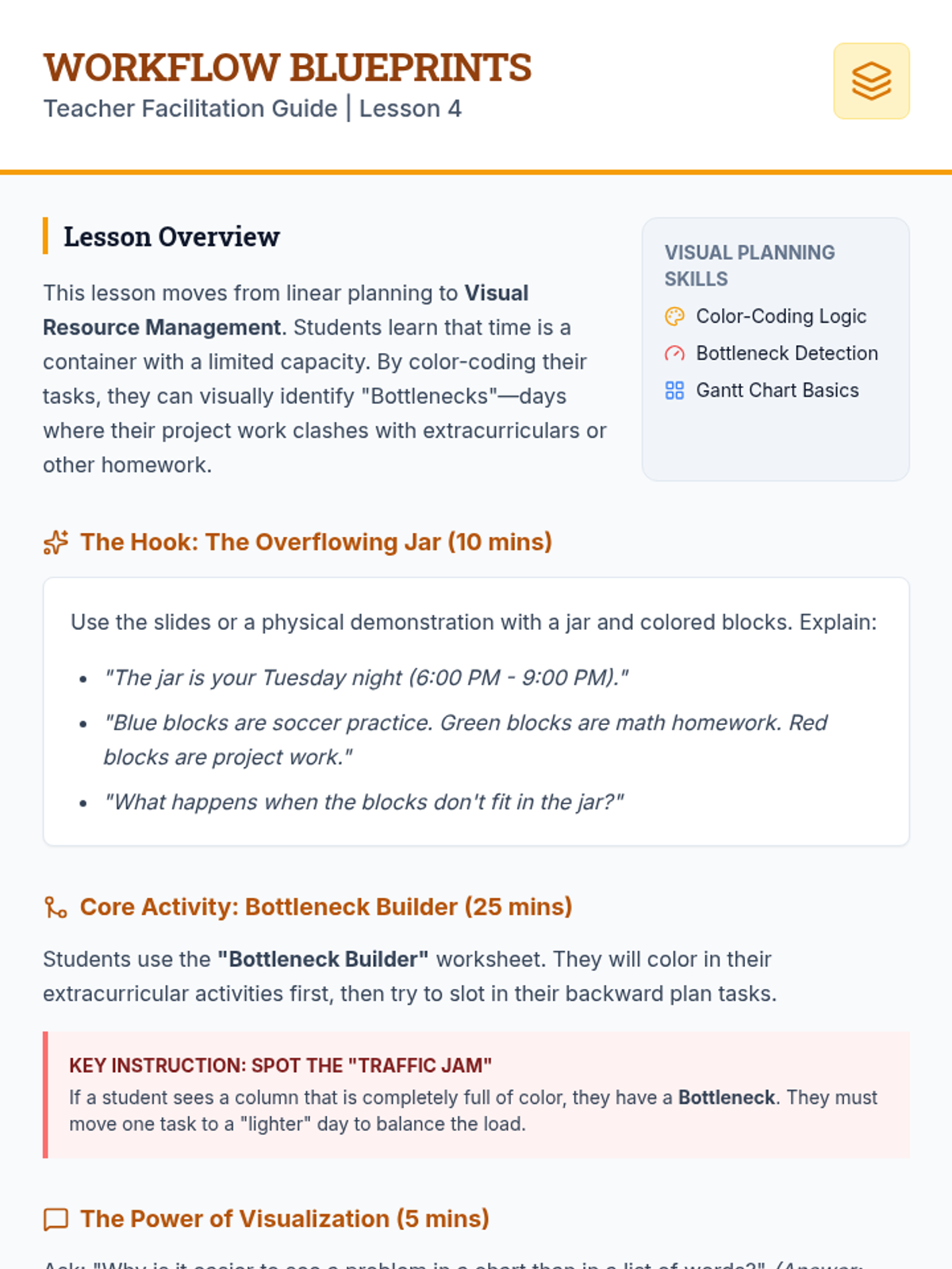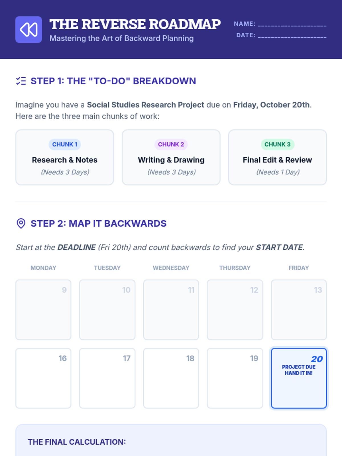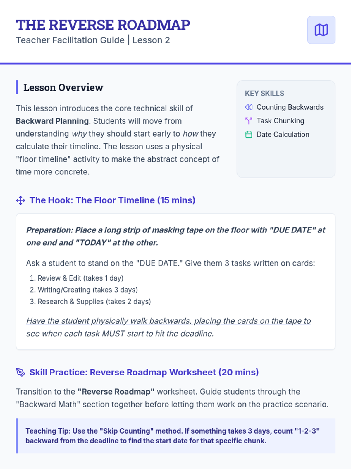 A 5-lesson sequence for 7th-grade students on project planning through backward design. Students learn to map deadlines, set milestones, visualize workflows, and establish review routines to reduce stress and avoid the 'panic zone'.