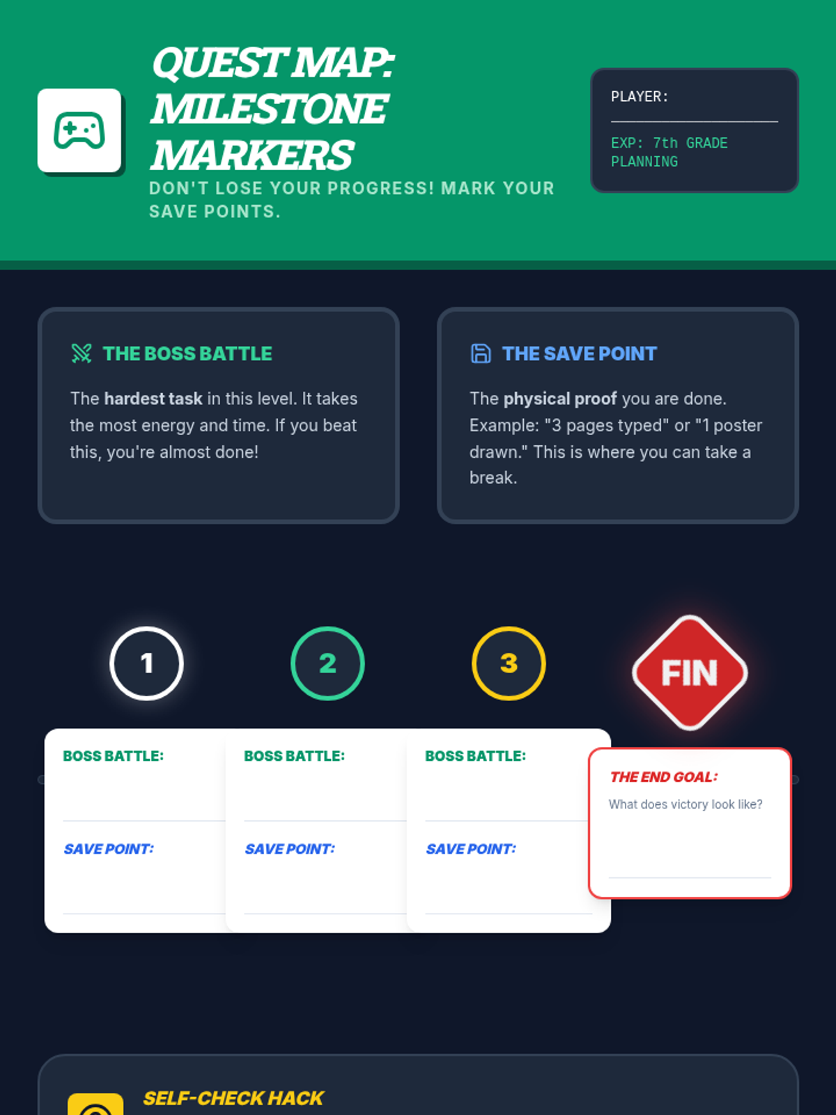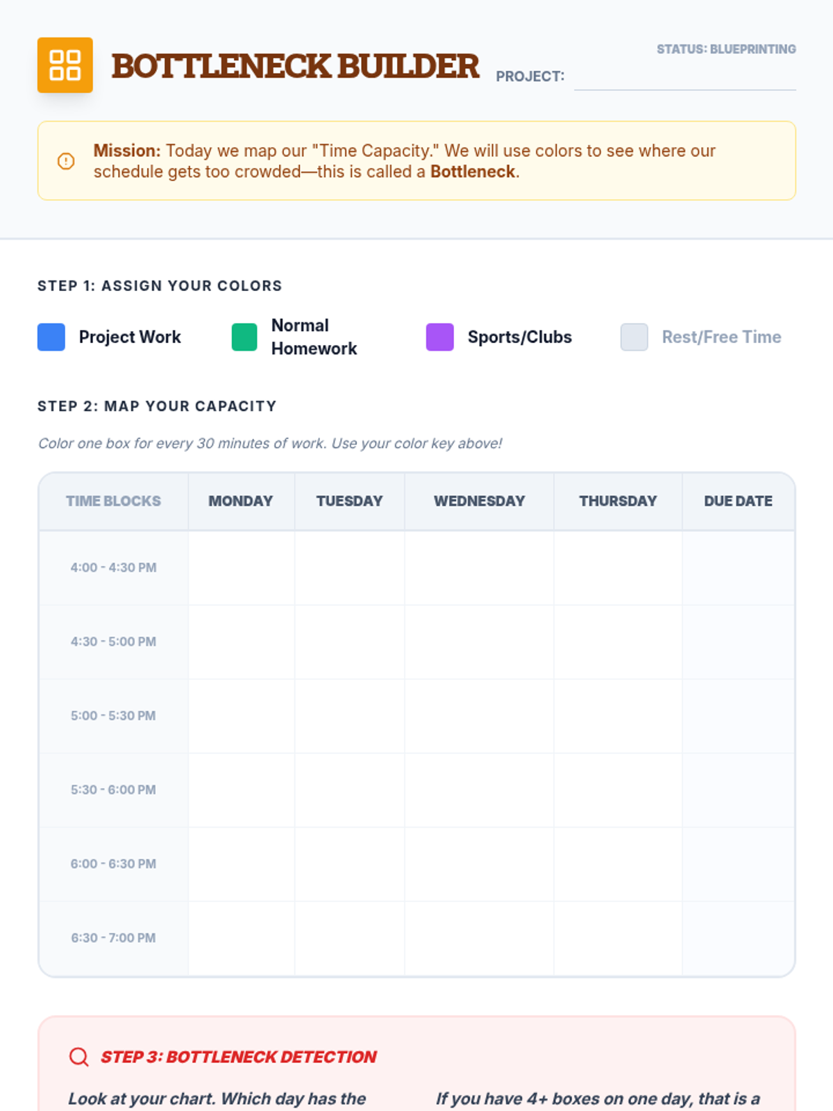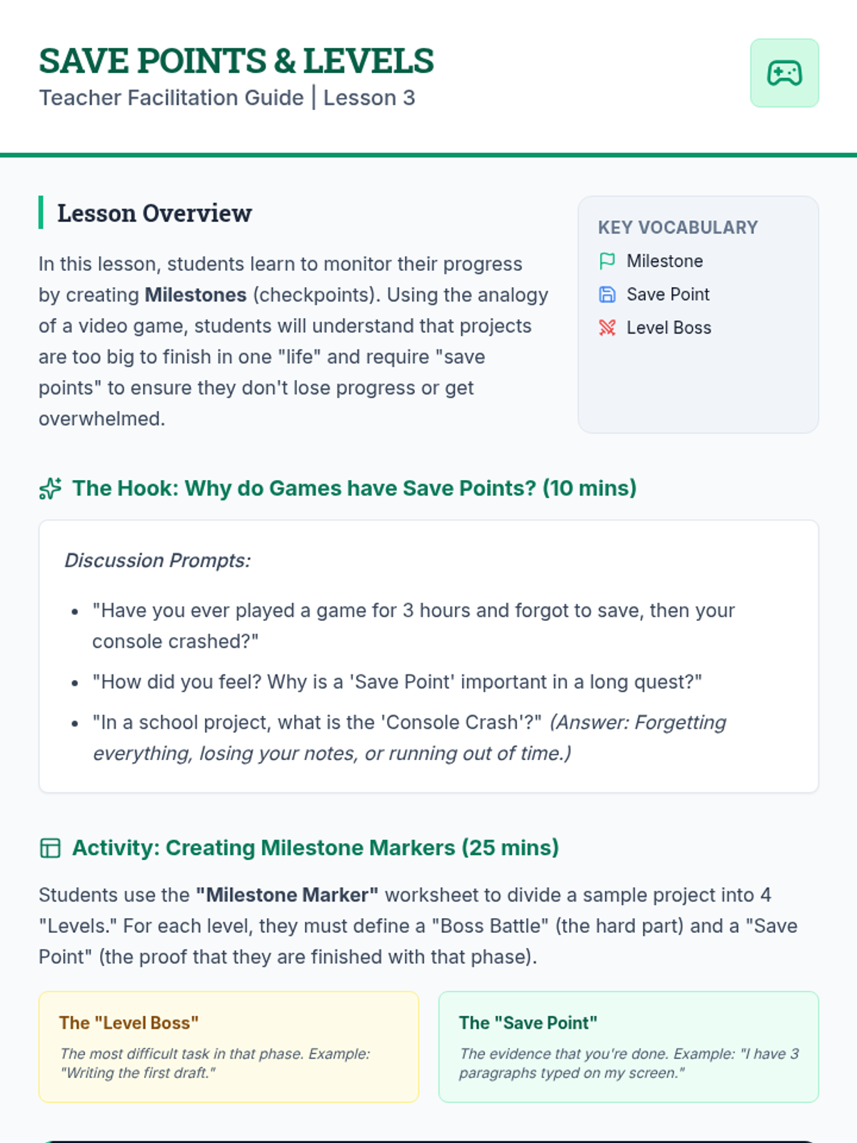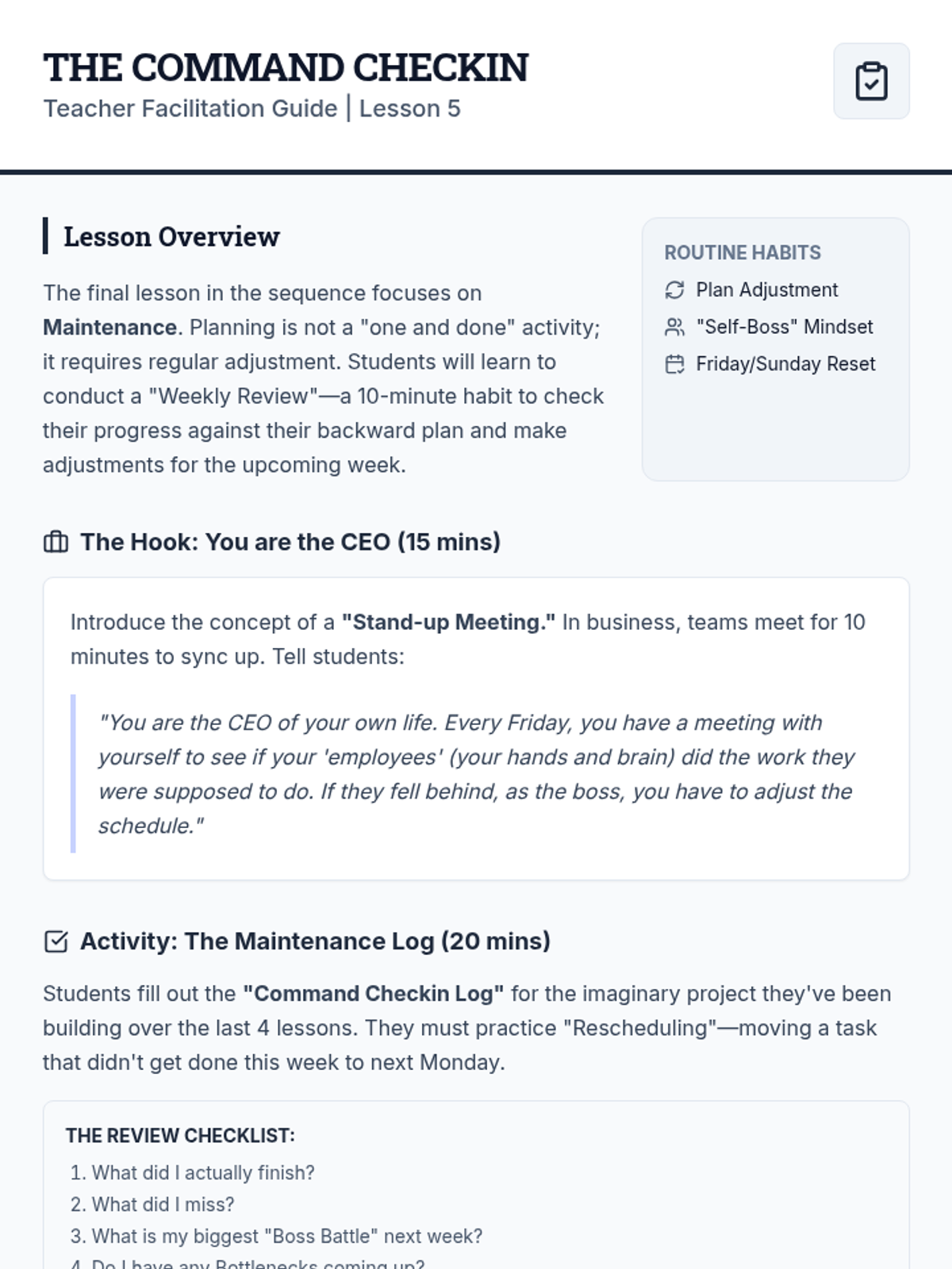 A 5-lesson sequence for 7th-grade students on project planning through backward design. Students learn to map deadlines, set milestones, visualize workflows, and establish review routines to reduce stress and avoid the 'panic zone'.