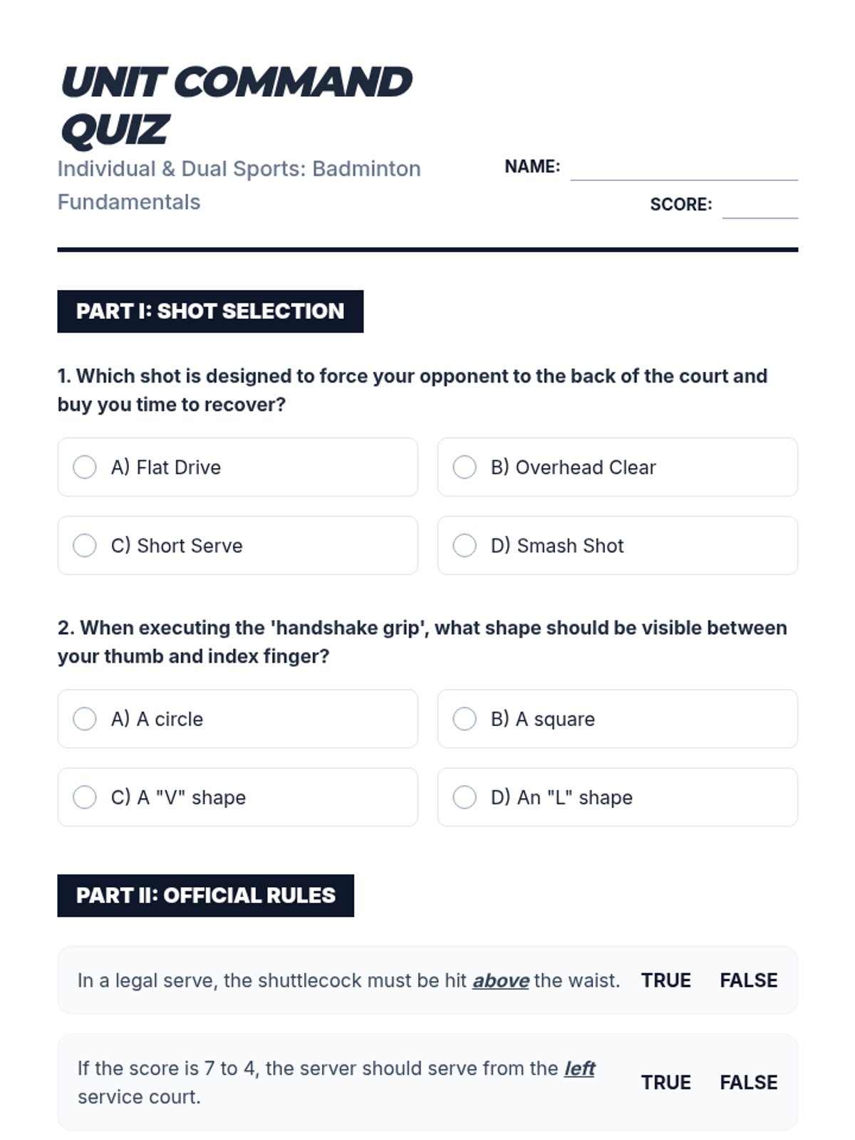 A comprehensive 7th-grade unit on badminton fundamentals, covering grip, footwork, drives, serves, clears, and competitive match play rules. Students progress from basic mechanics to strategic court movement and officiating.