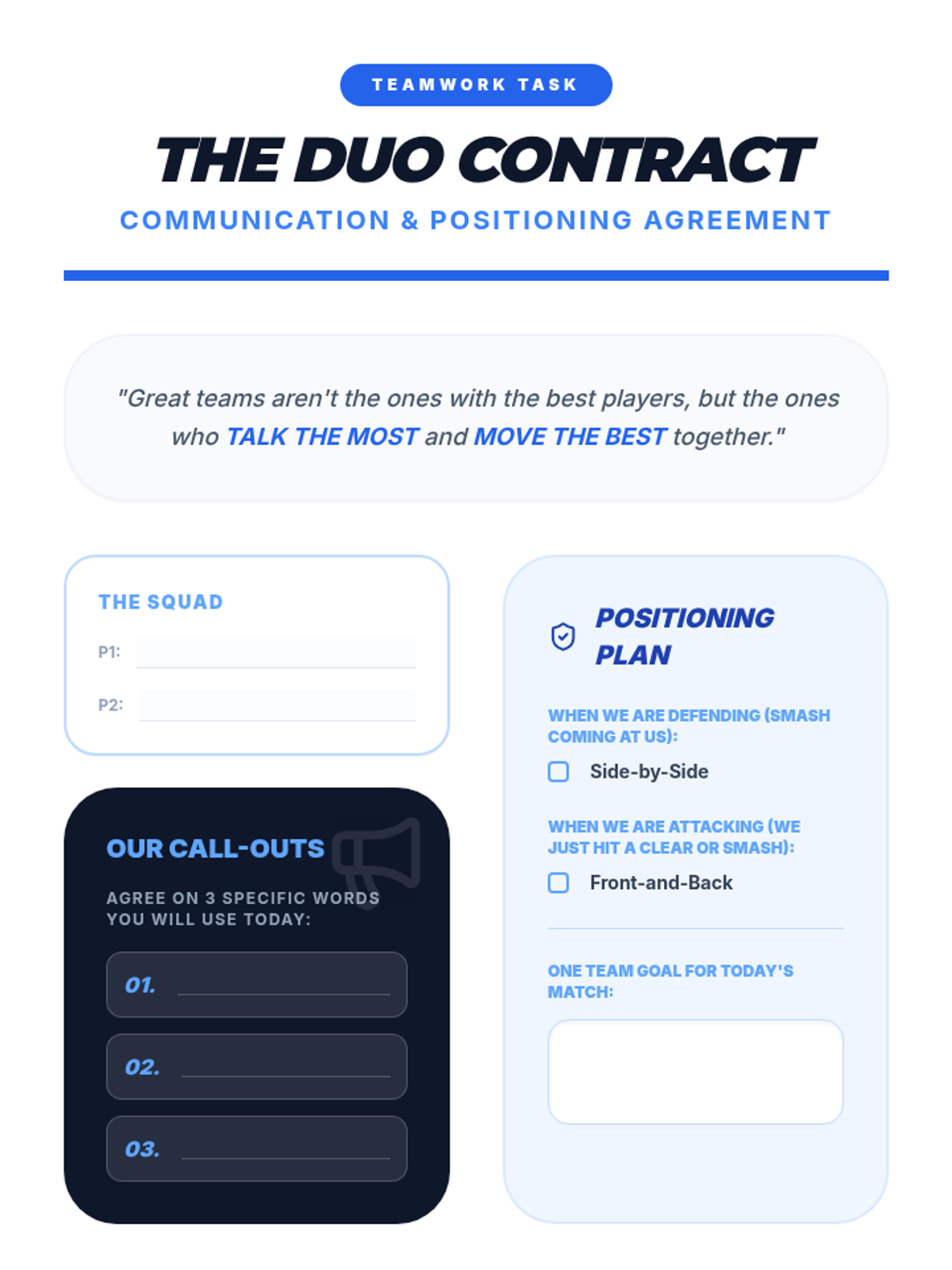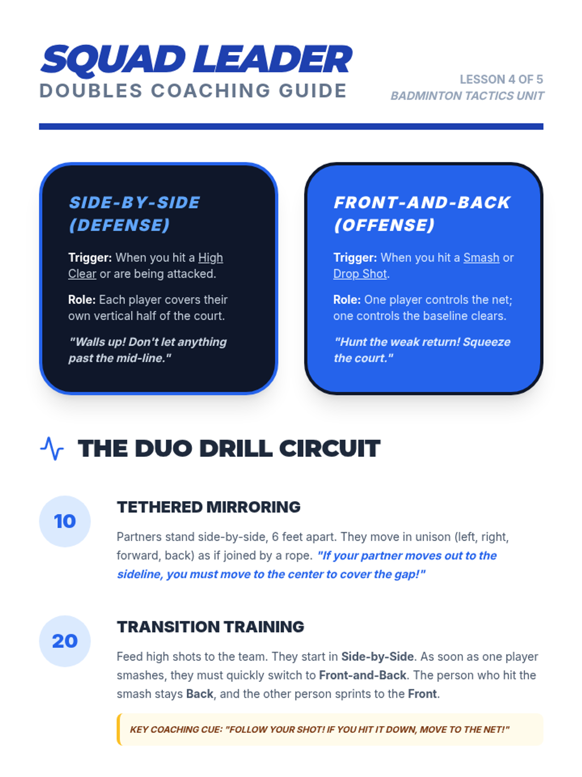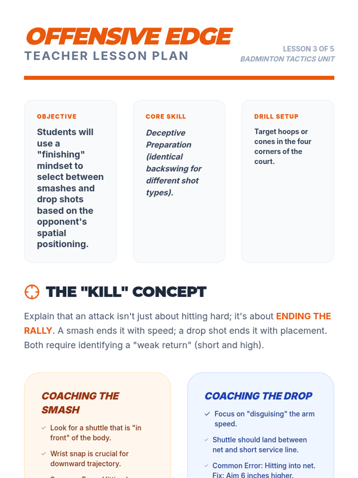 A 6th-grade badminton sequence focusing on tactical spatial awareness, serving precision, offensive shot selection, and doubles communication, culminating in a competitive tournament.