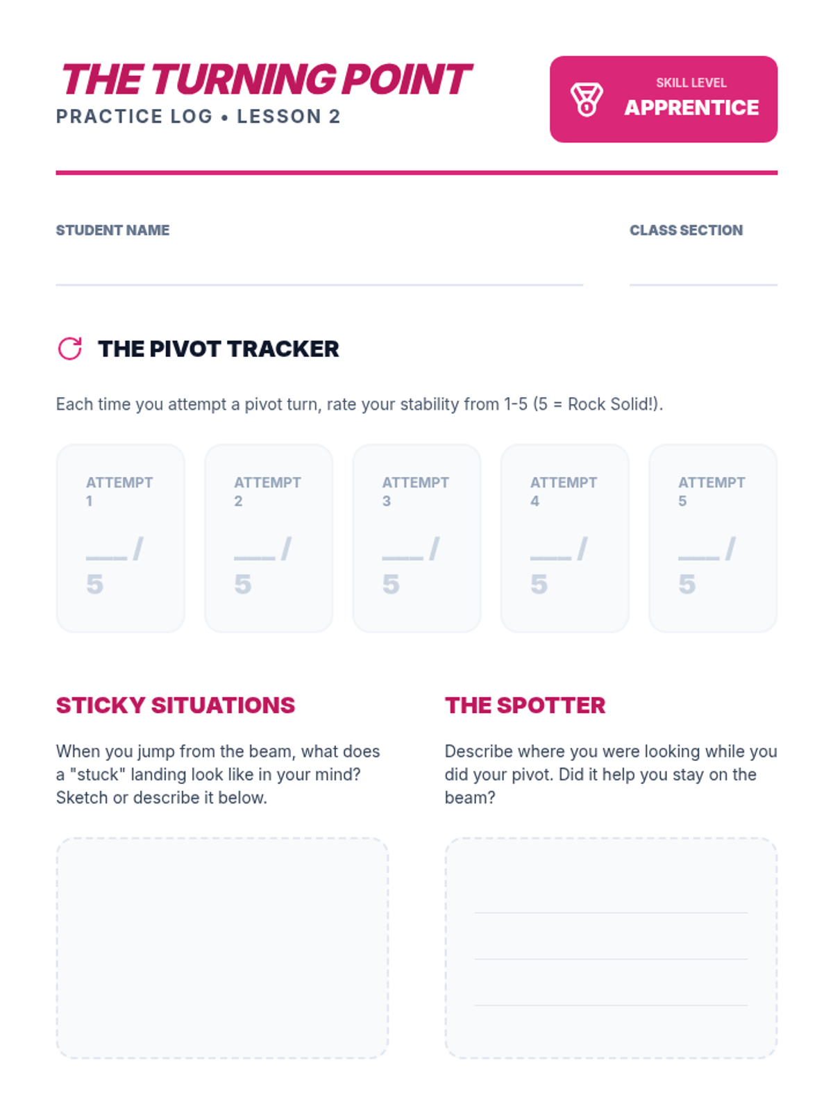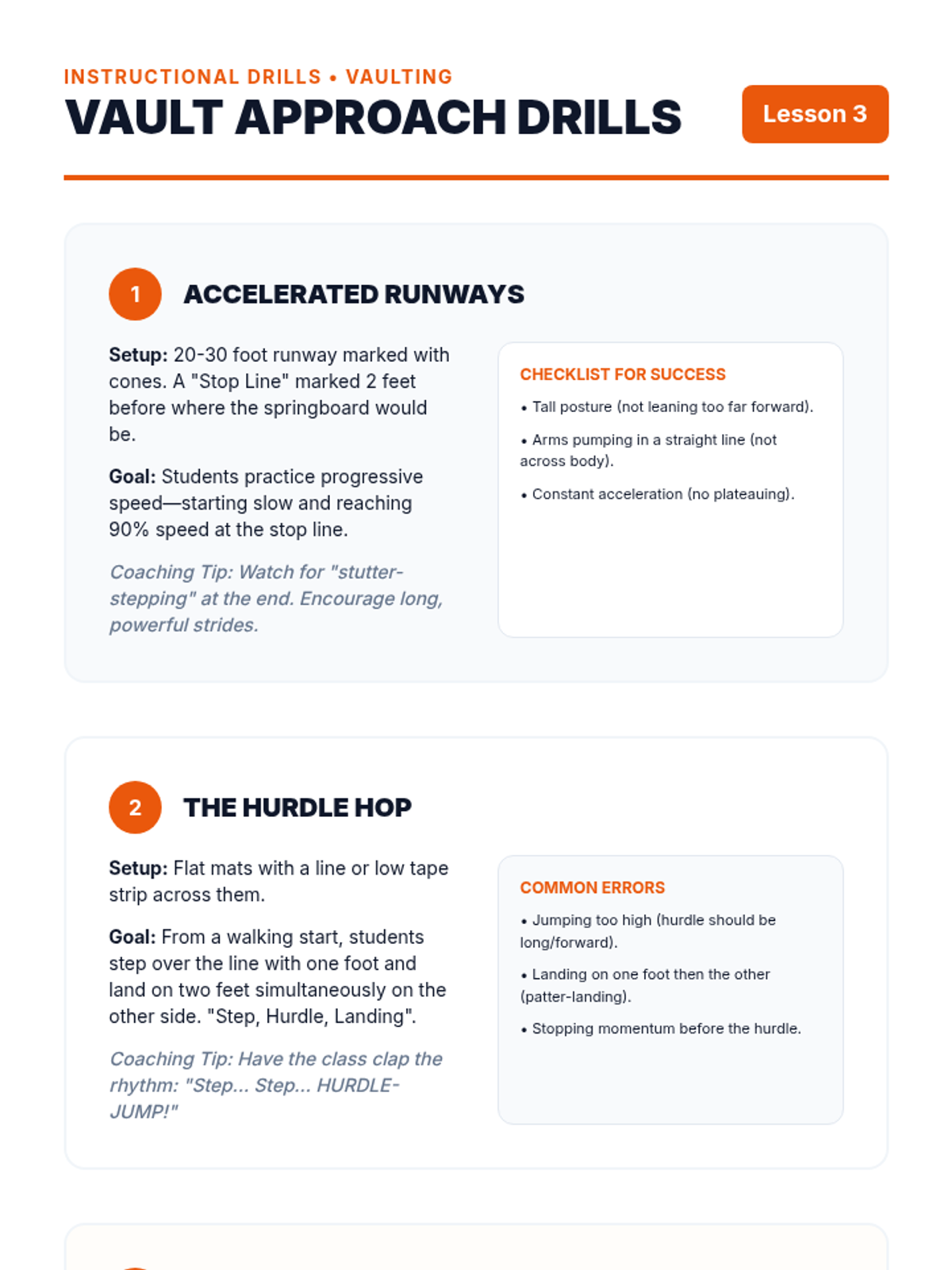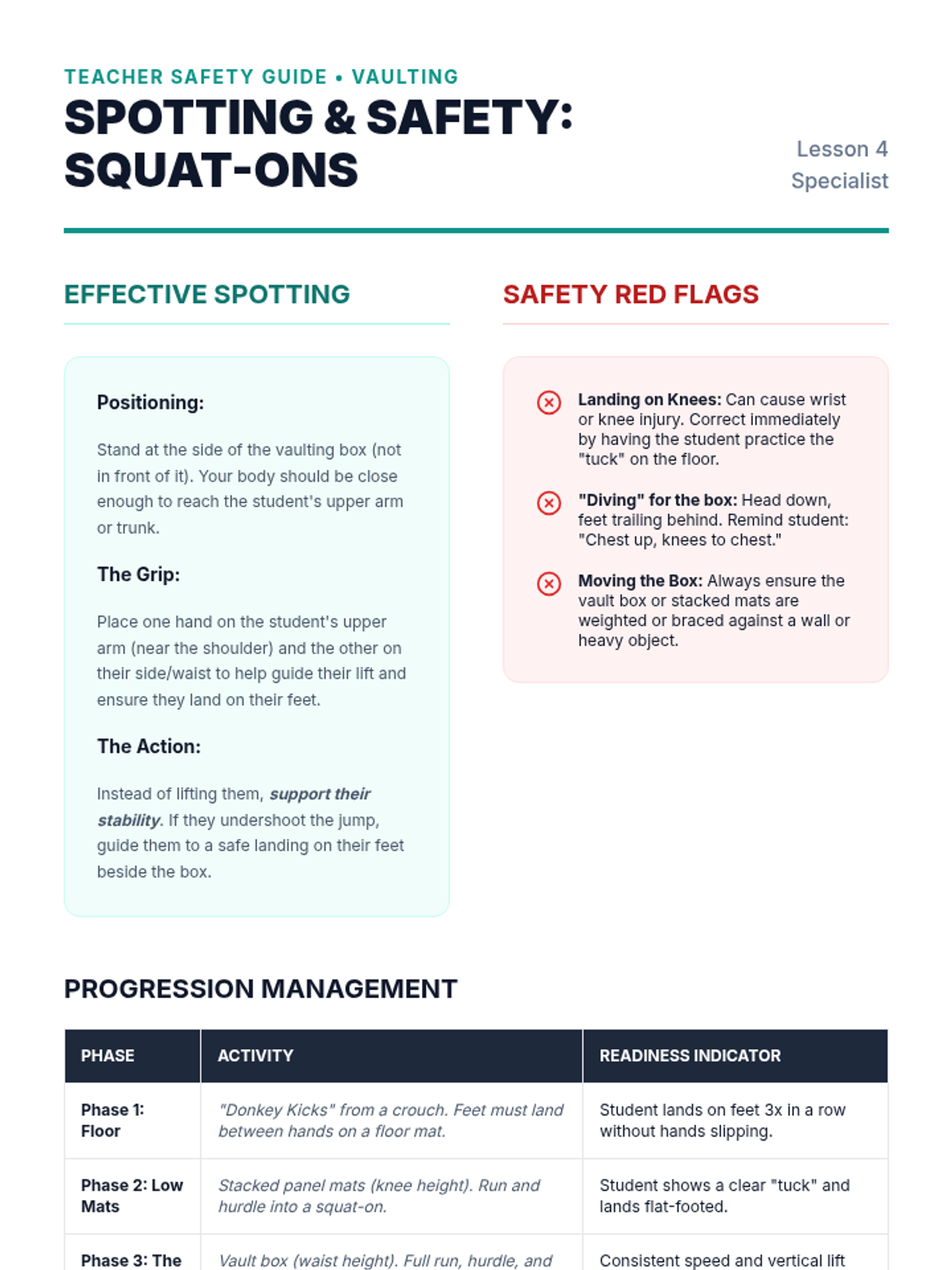 A 5-lesson 4th Grade Gymnastics sequence focusing on low balance beam skills and introductory vaulting mechanics. Students develop dynamic balance, explosive power, and safe landing techniques through station-based learning.