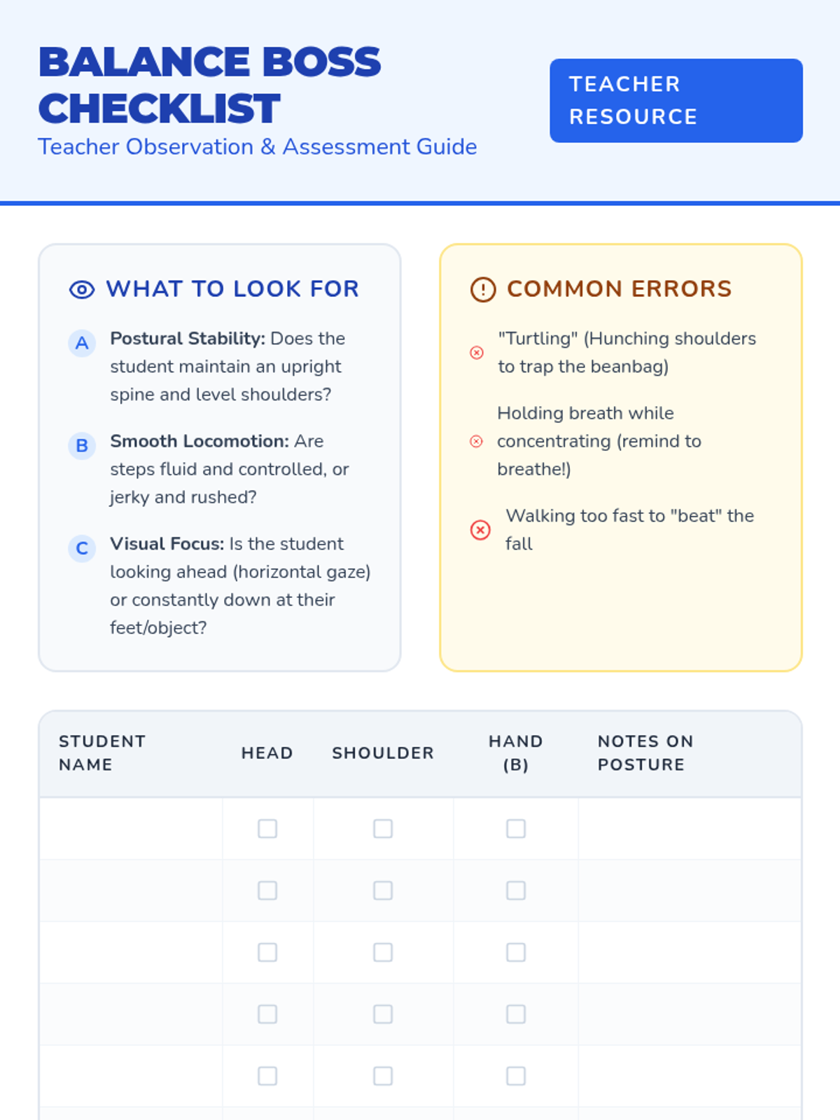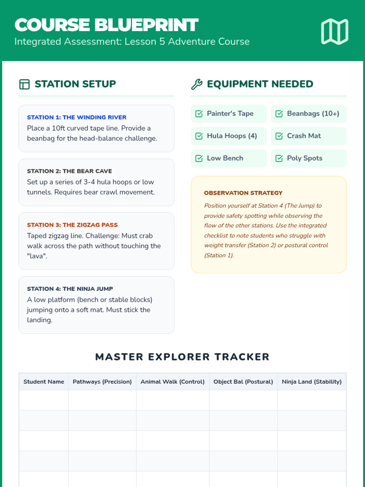 This Kindergarten sequence focuses on dynamic balance and body control. Students explore movement through various pathways, mimic animal locomotion, balance objects while moving, and master safe landing techniques, culminating in a comprehensive obstacle course adventure.
