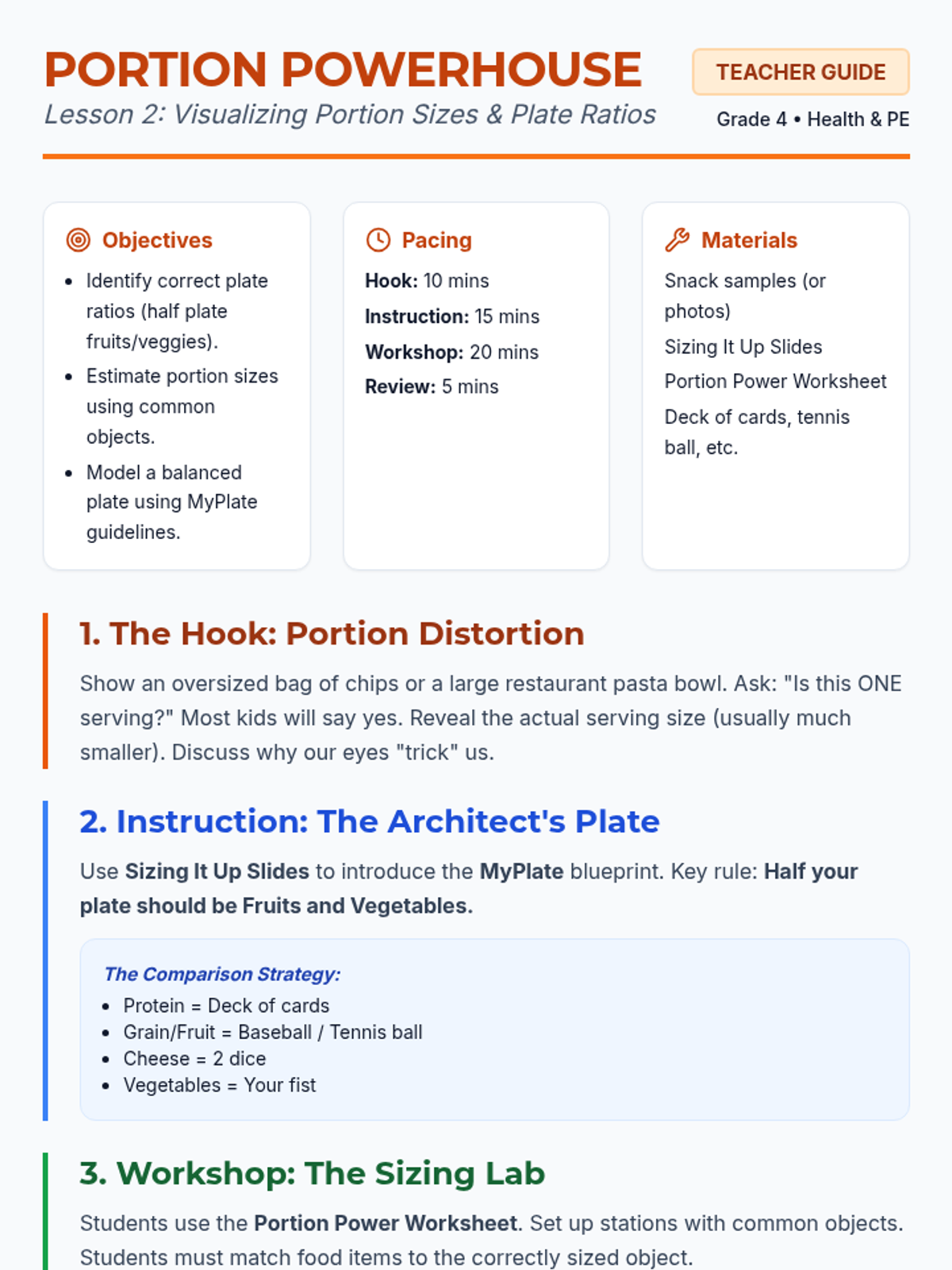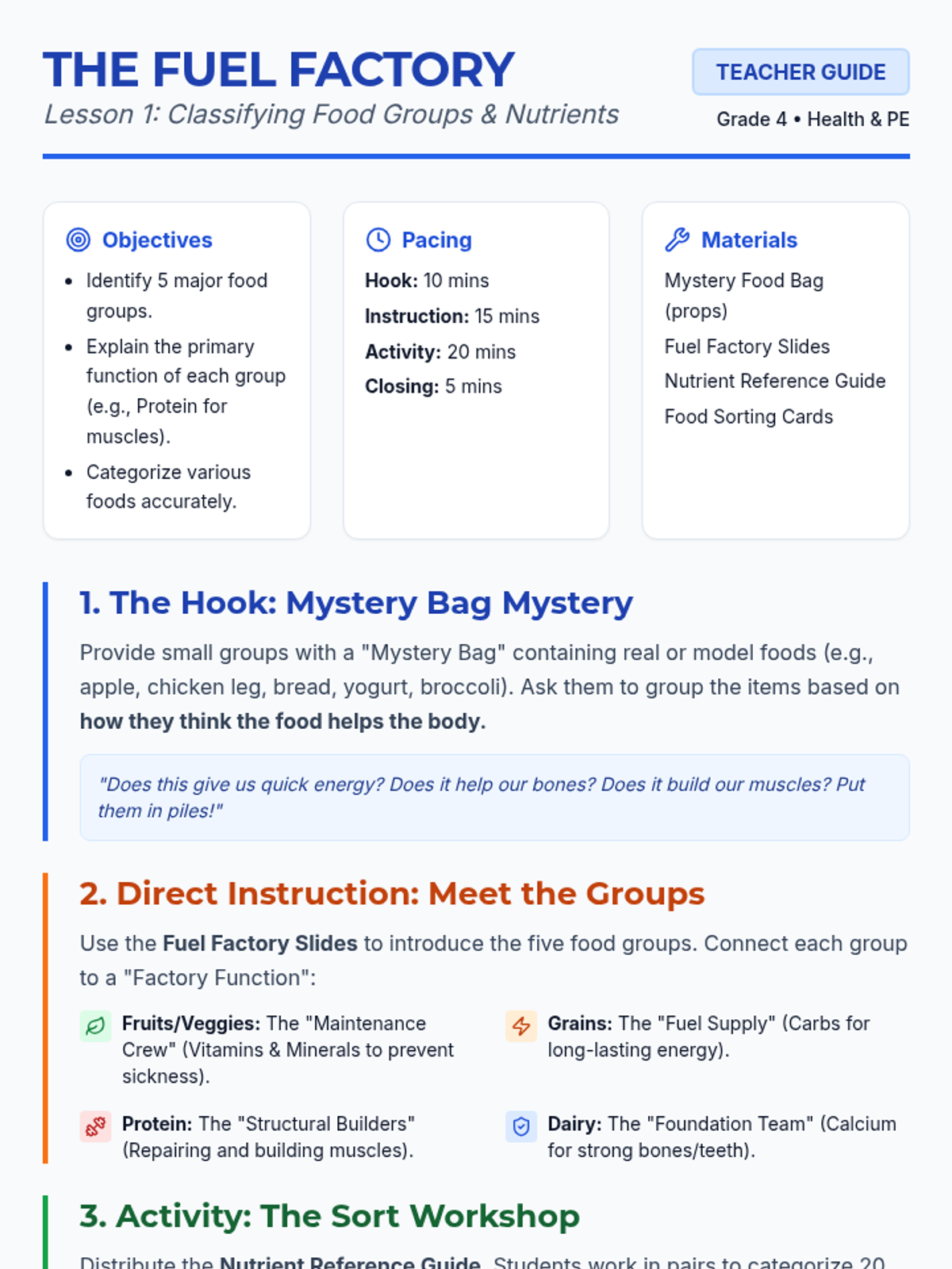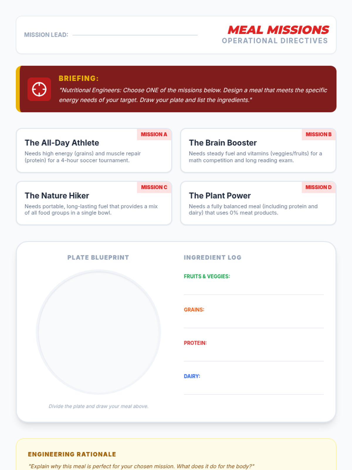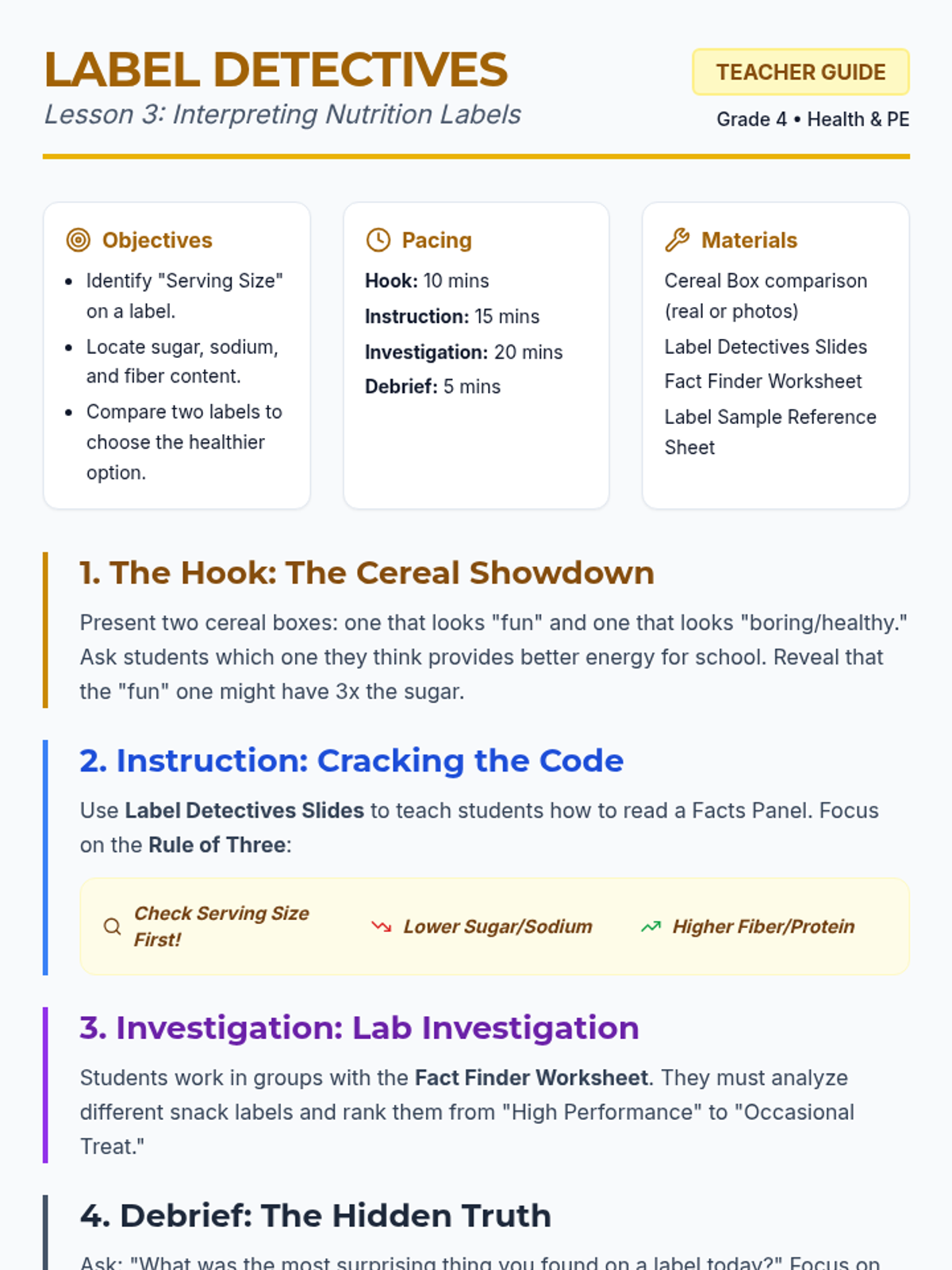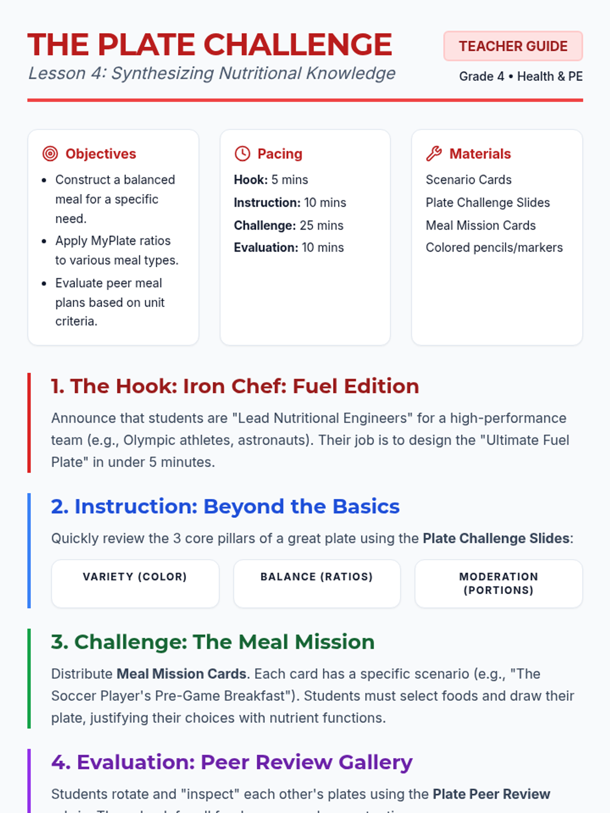A comprehensive 4th-grade nutrition unit where students master the MyPlate framework, analyze nutrition labels, and design balanced meal plans to fuel their bodies effectively.