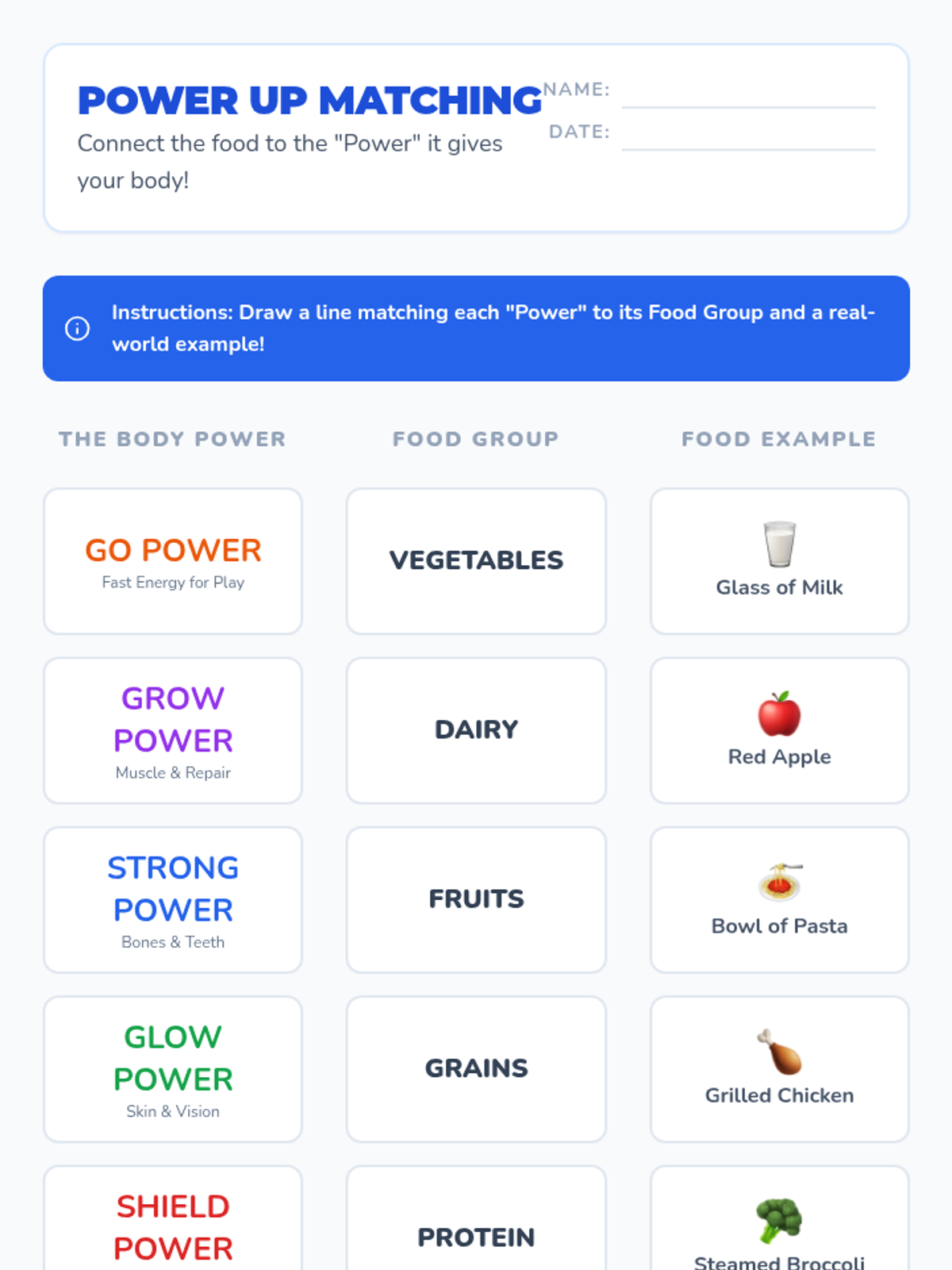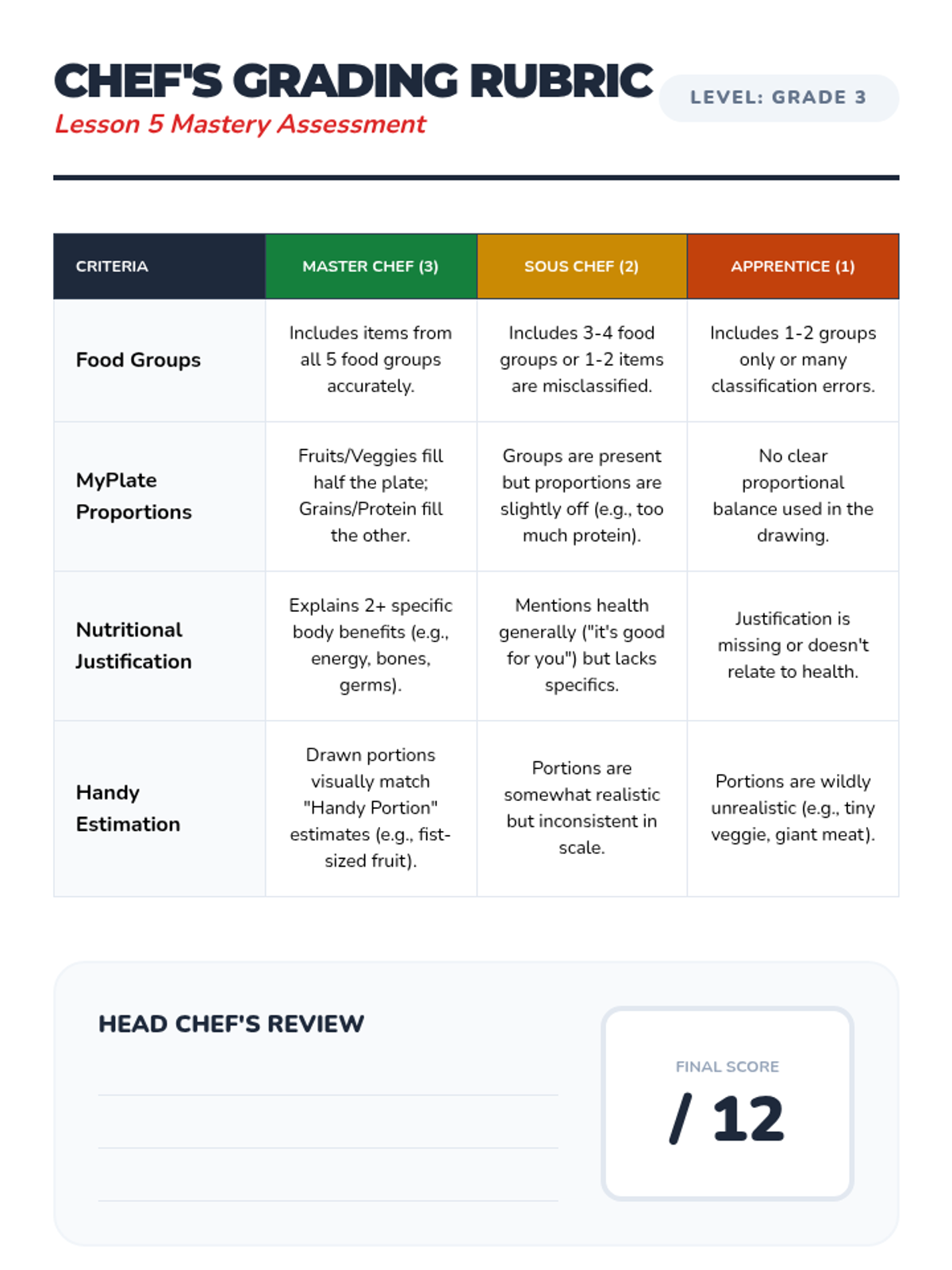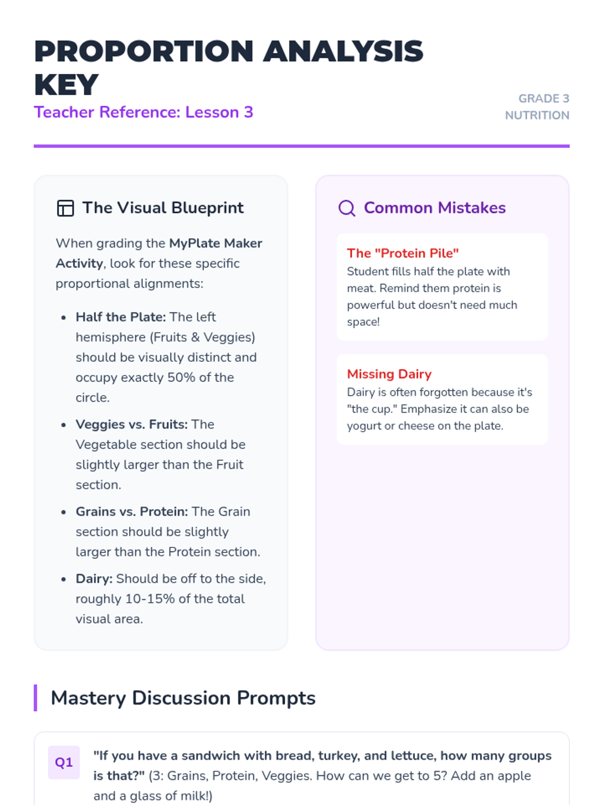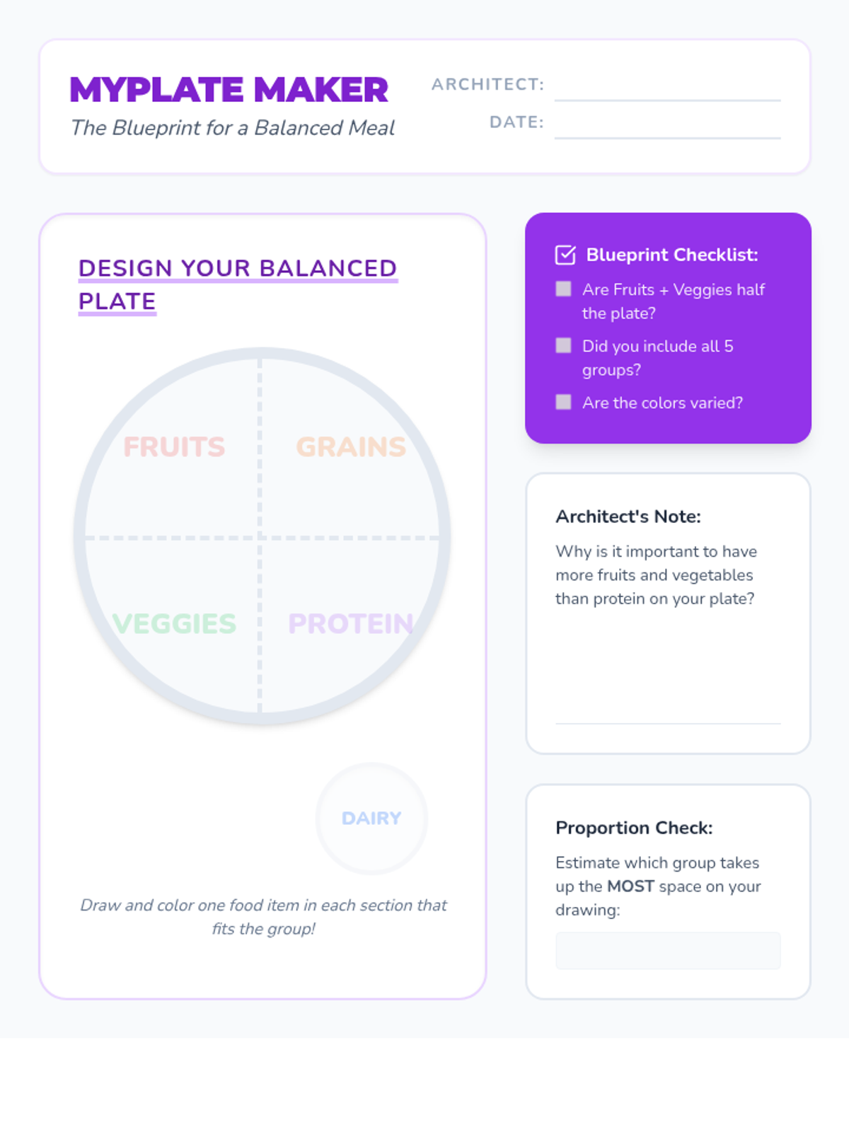 A comprehensive project-based unit where 3rd graders become 'Nutrition Architects'. Students explore the five food groups, link nutrients to body functions, master proportions using MyPlate, and culminate by designing a balanced lunch menu.