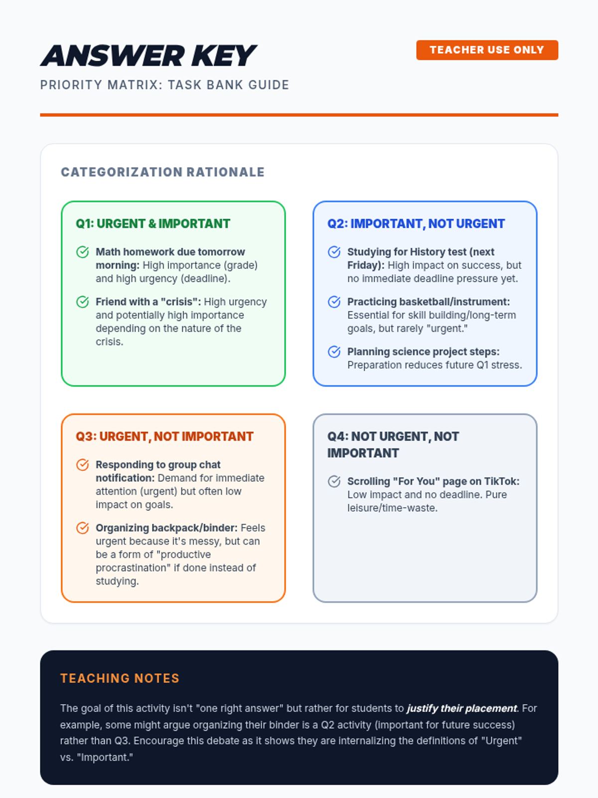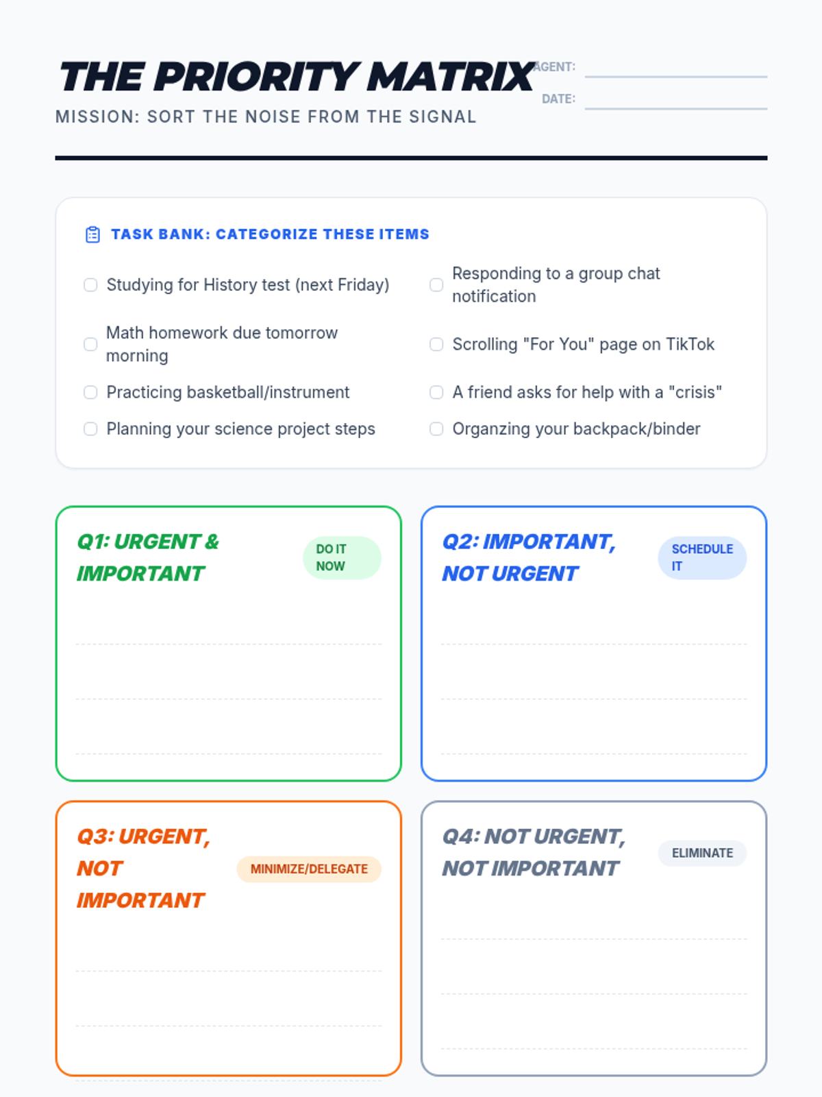 A comprehensive unit for 8th graders to master time management, prioritization using the Eisenhower Matrix, and time-blocking techniques to balance school and life.