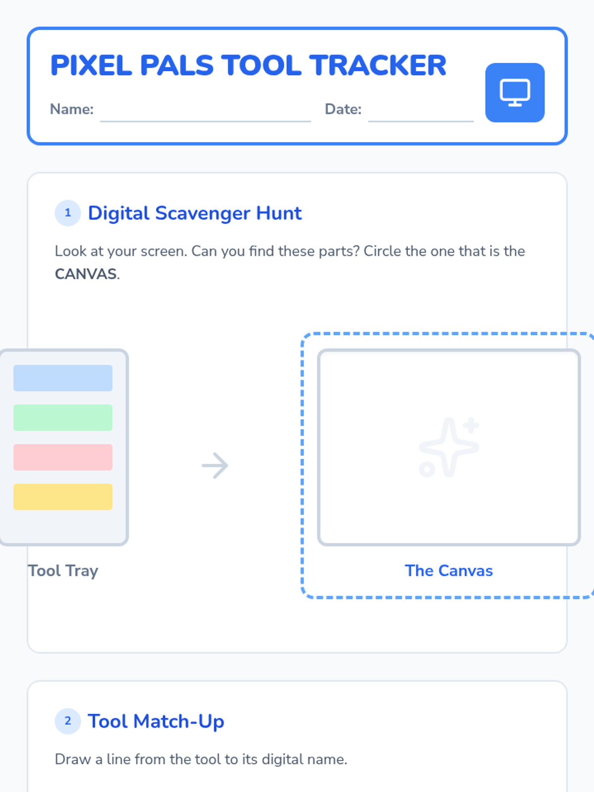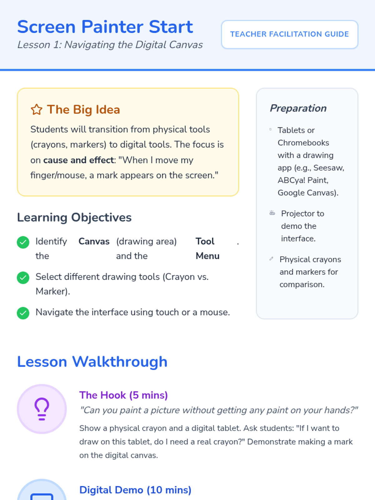 A foundational sequence for Kindergarteners to explore digital design, moving from basic tool navigation and shape manipulation to intentional composition and typography using digital media.