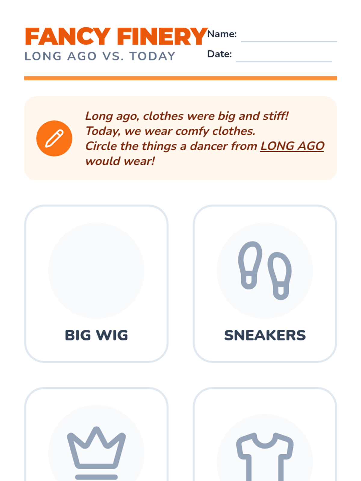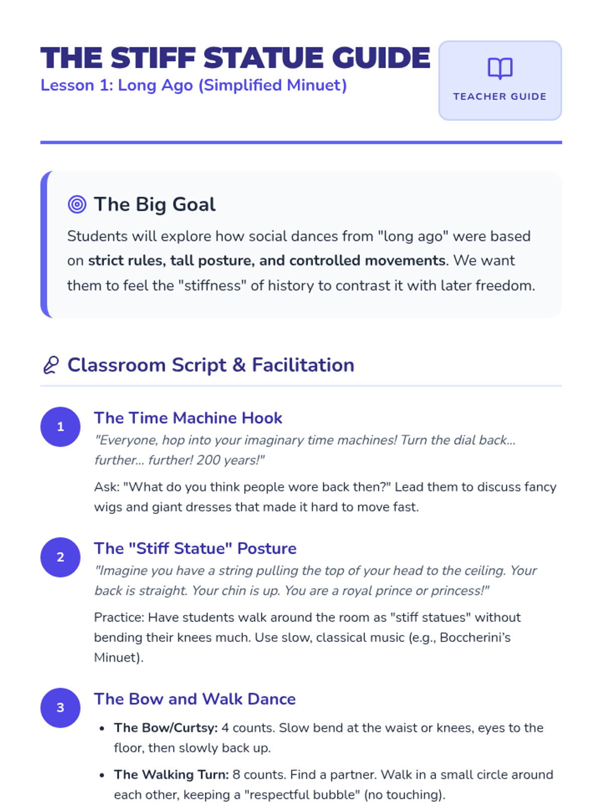 A kindergarten sequence exploring how social dance has changed over time, from formal historical dances to modern rhythmic styles. Students will use a 'time machine' concept to travel through different eras, experiencing how posture, rhythm, and freedom of movement have evolved.