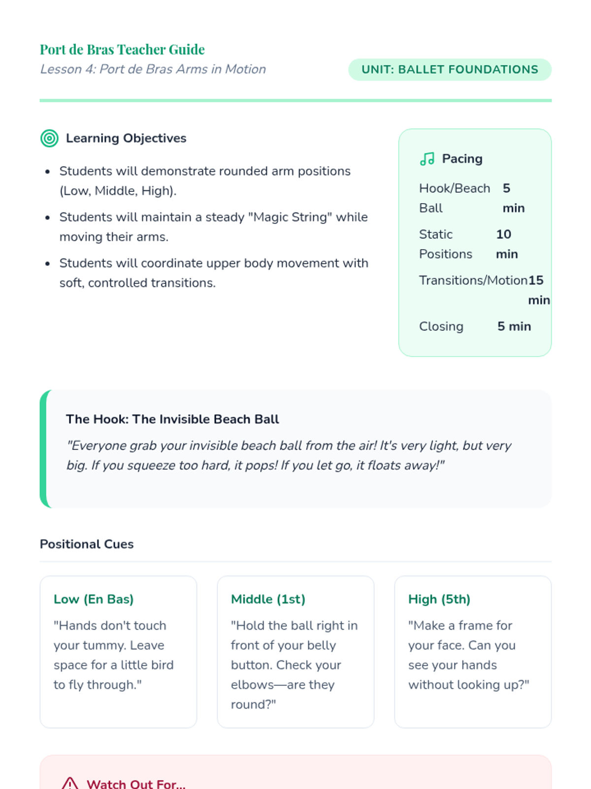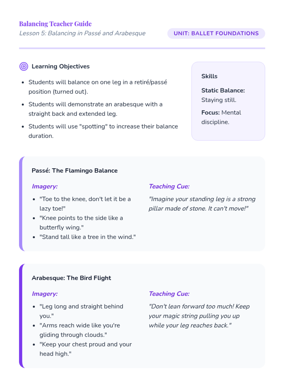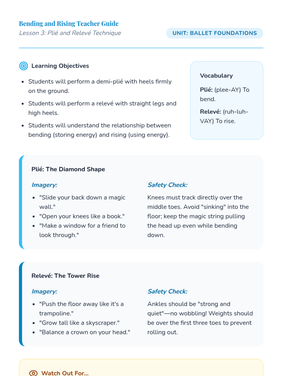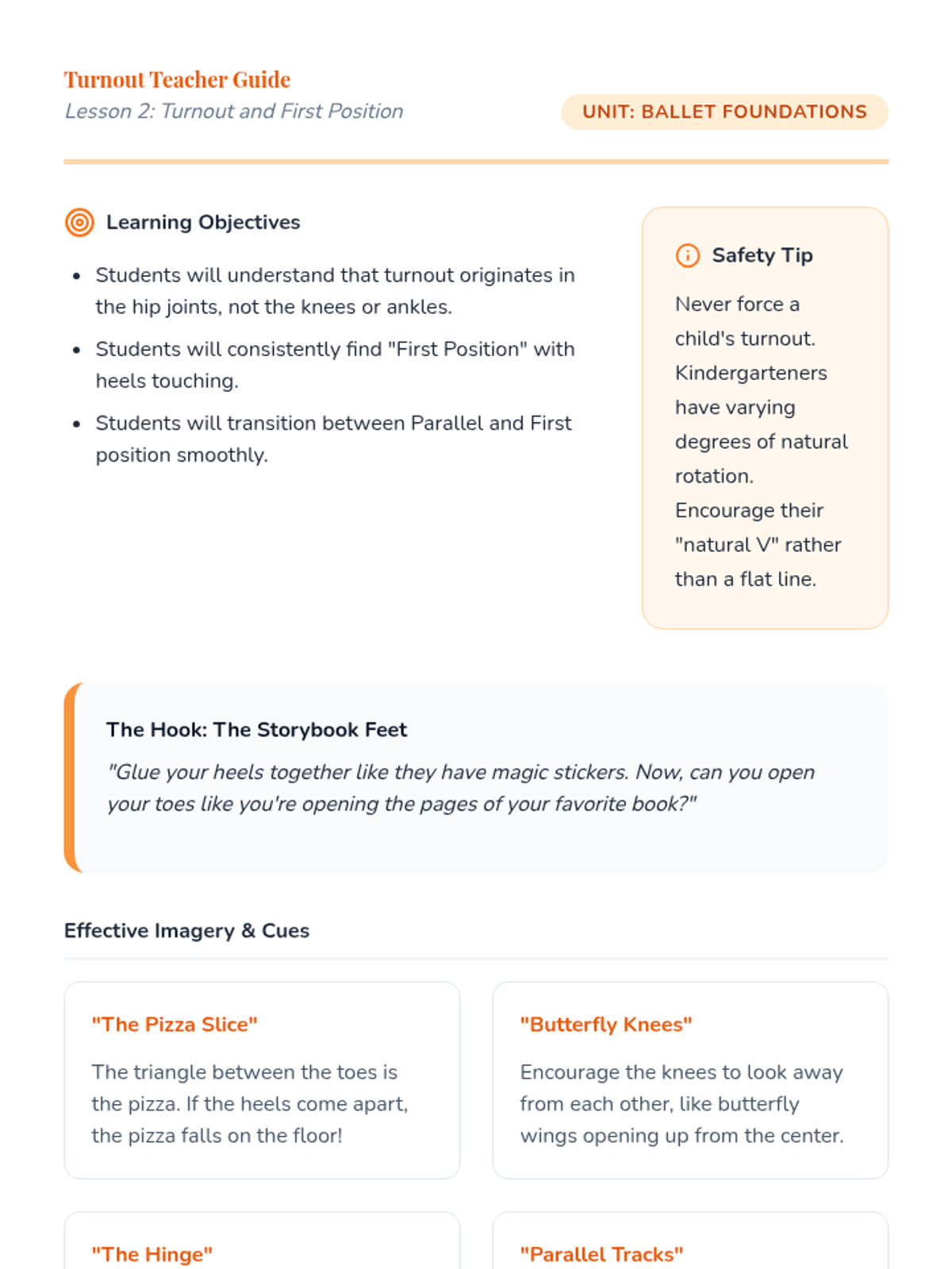 A foundational ballet sequence for Kindergarteners exploring posture, turnout, basic movements, and balance through creative imagery and playful instruction.