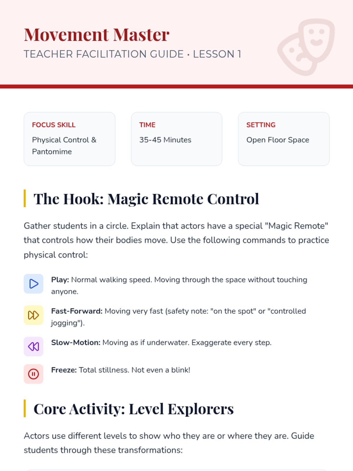 A Kindergarten theater sequence where students explore their 'Actor's Toolbox'—the body, voice, and imagination. Through movement games, vocal play, and emotional expression, students learn how to transform into characters and tell stories on stage.
