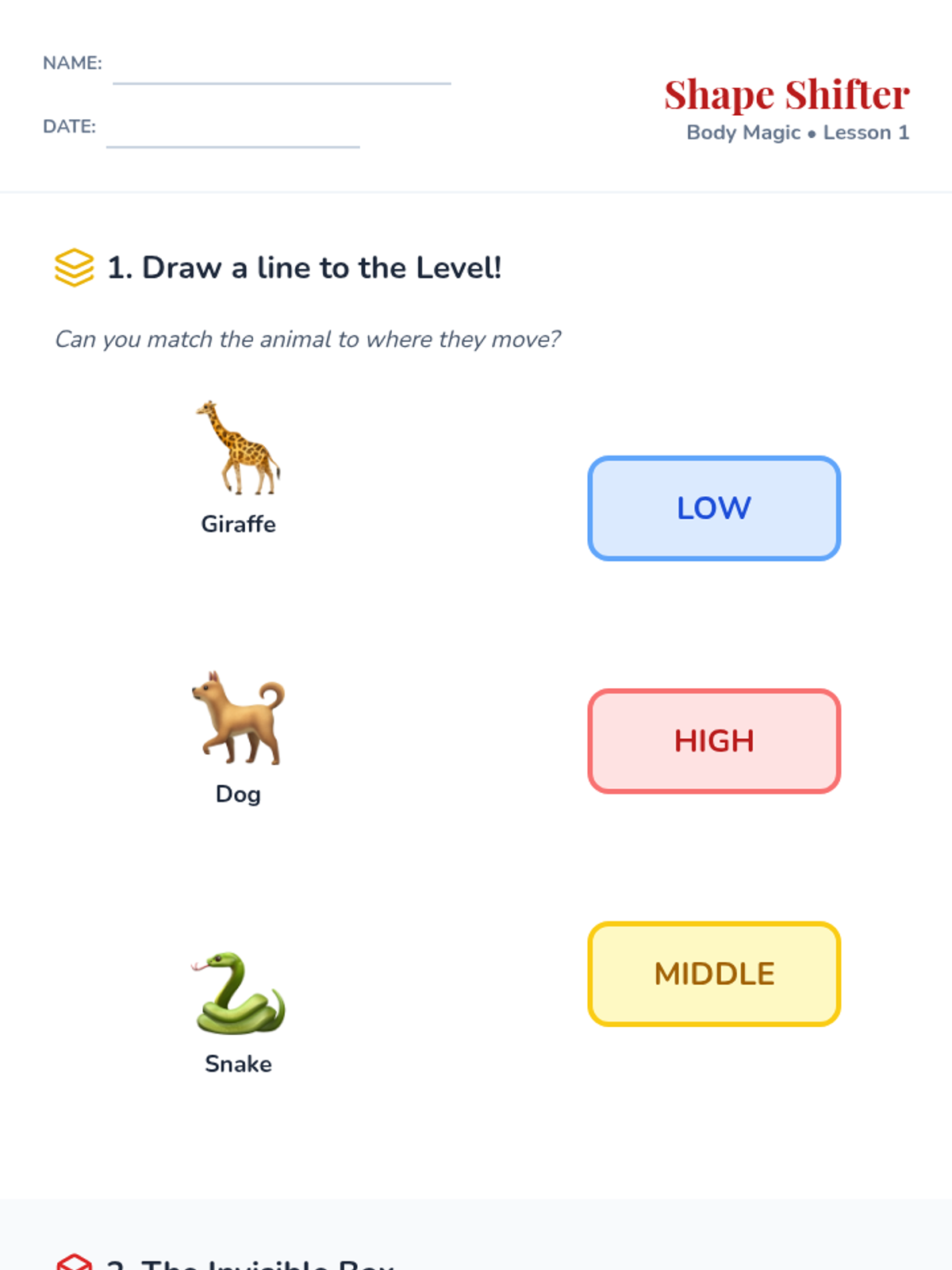 This sequence introduces Pre-K students to the expressive power of creative movement. Students learn to use their bodies to communicate animals, weather, emotions, and stories, developing physical empathy and creative confidence through guided improvisation and play.