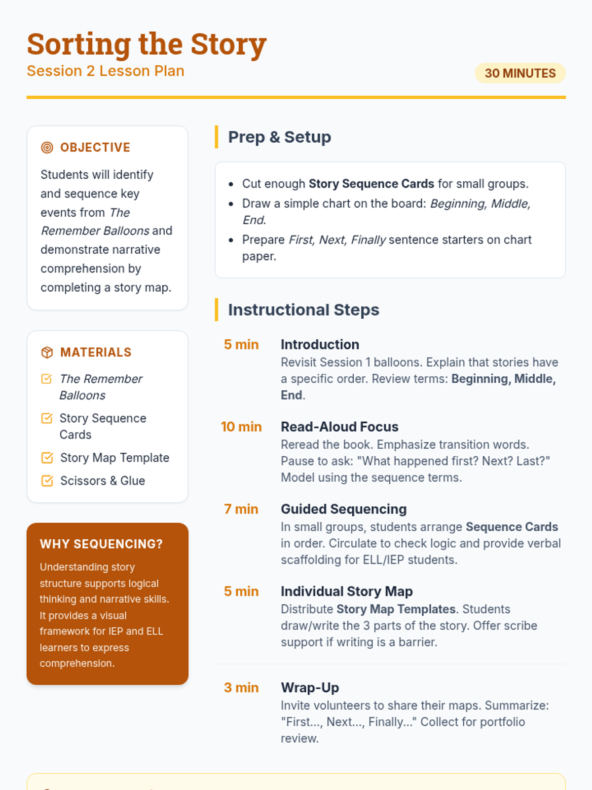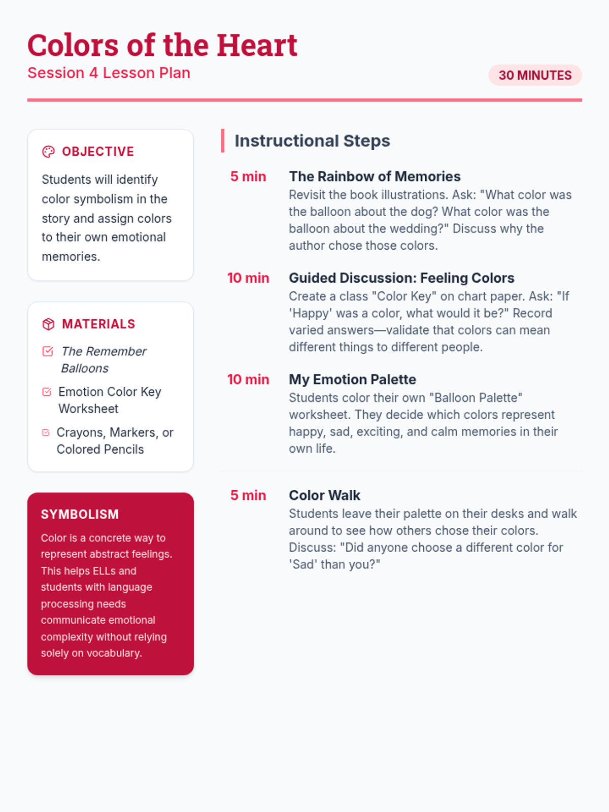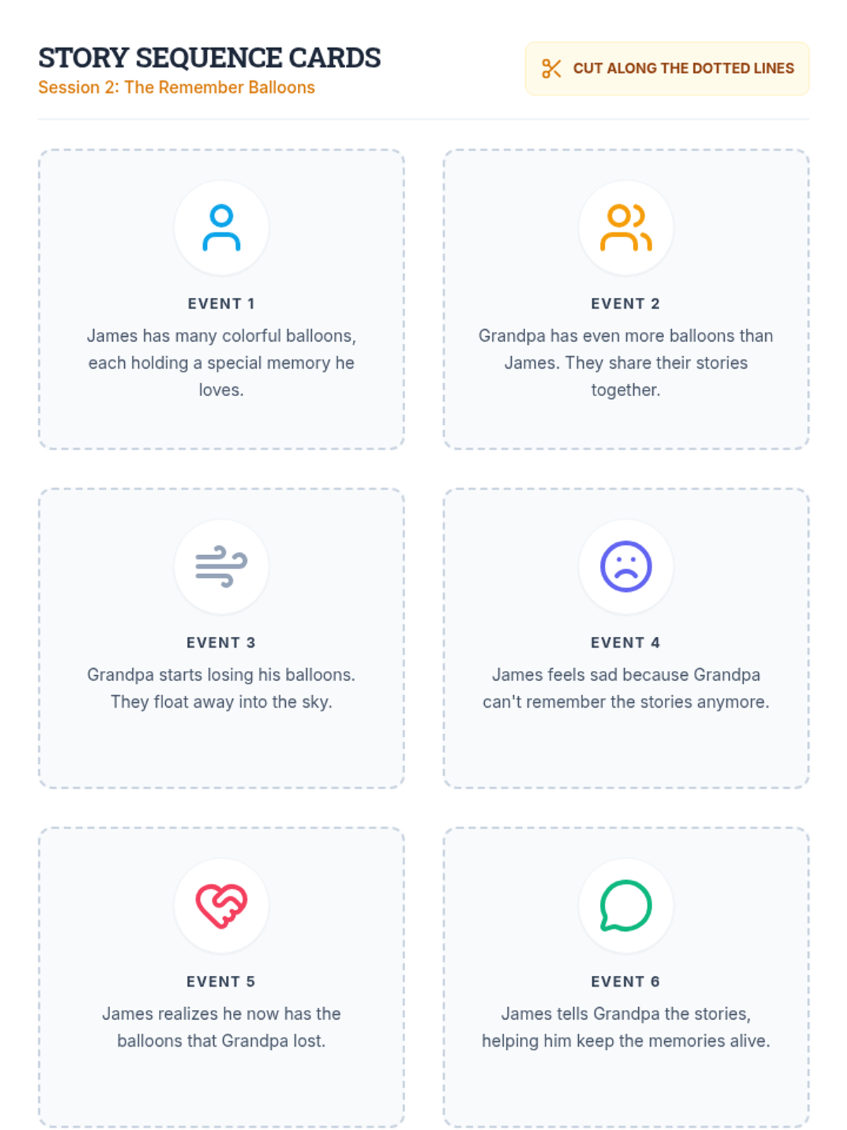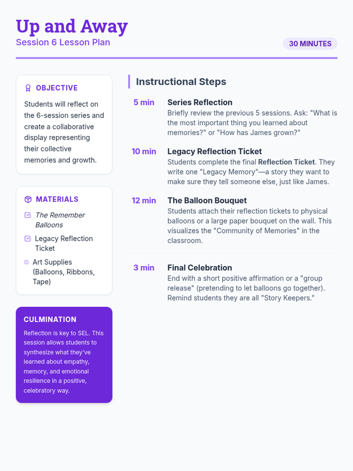 A 6-session social-emotional learning series based on 'The Remember Balloons' by Jessie Oliveros. Students explore memory, loss, and empathy through storytelling, sequencing, and symbolic art activities designed for K-8 learners.