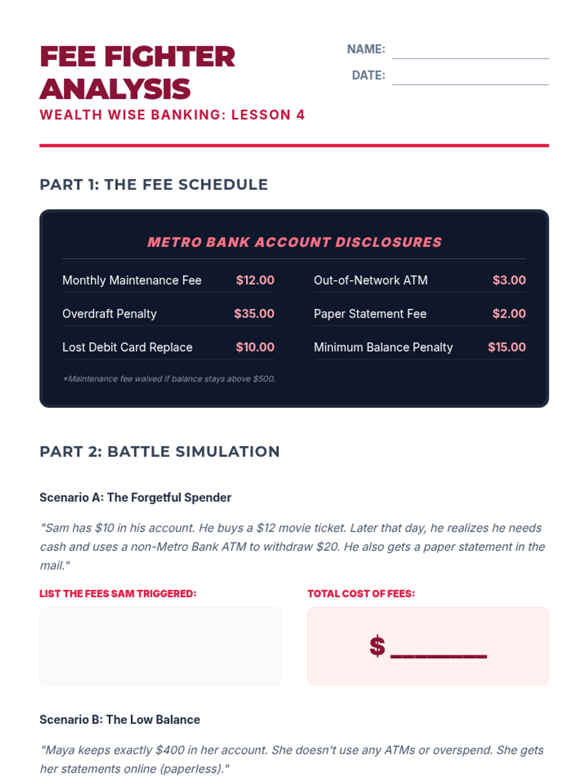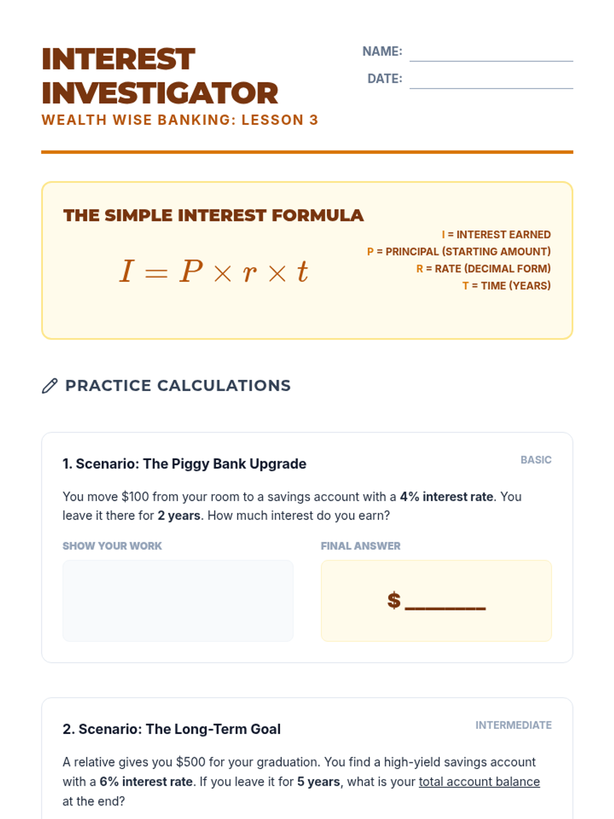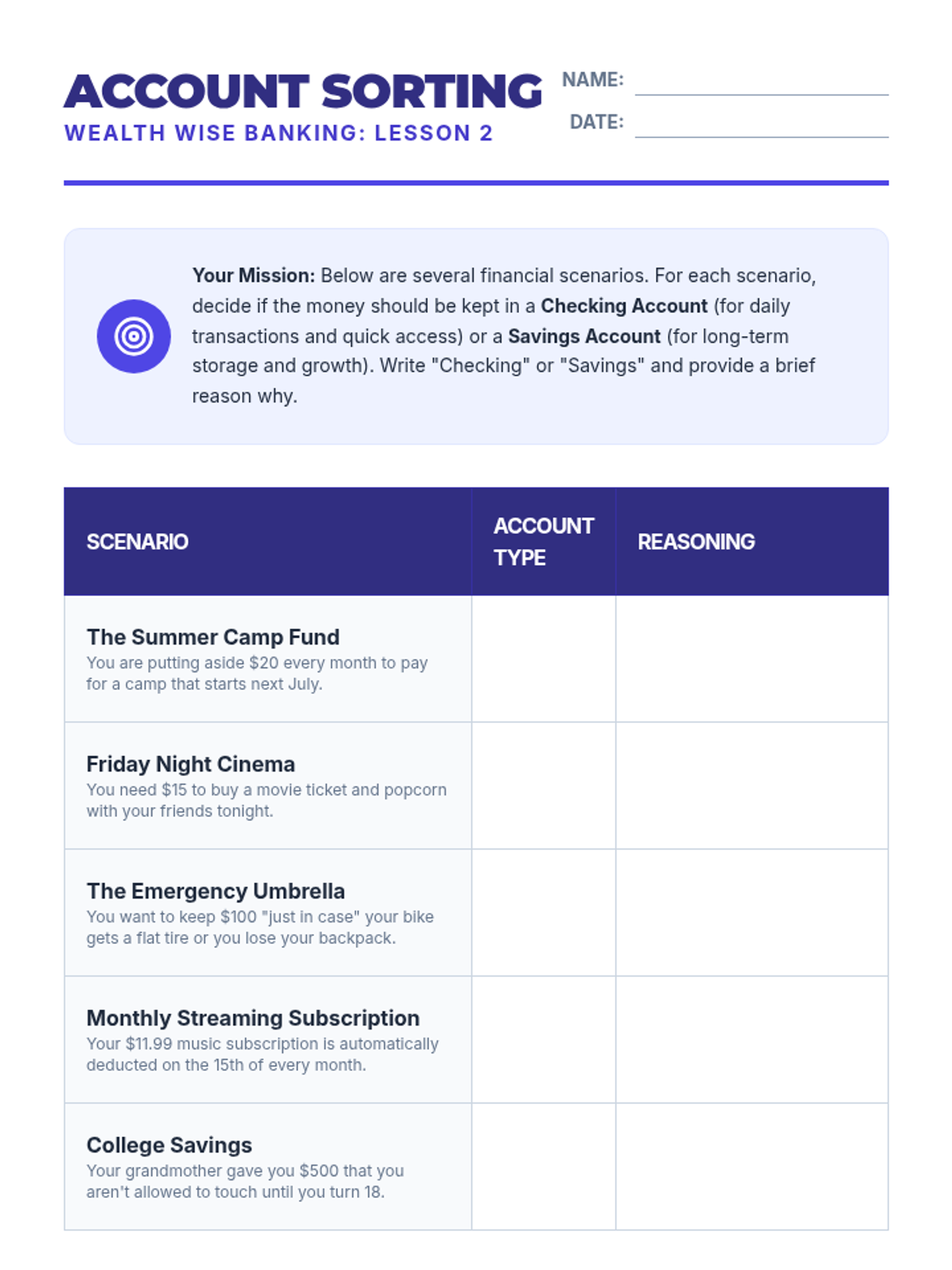 A comprehensive 5-lesson unit for 6th graders focused on the differences between checking and savings accounts, the institutions that provide them, and the mathematical growth and costs associated with banking. Students learn to evaluate account features, calculate interest, and avoid fees through inquiry and simulation.