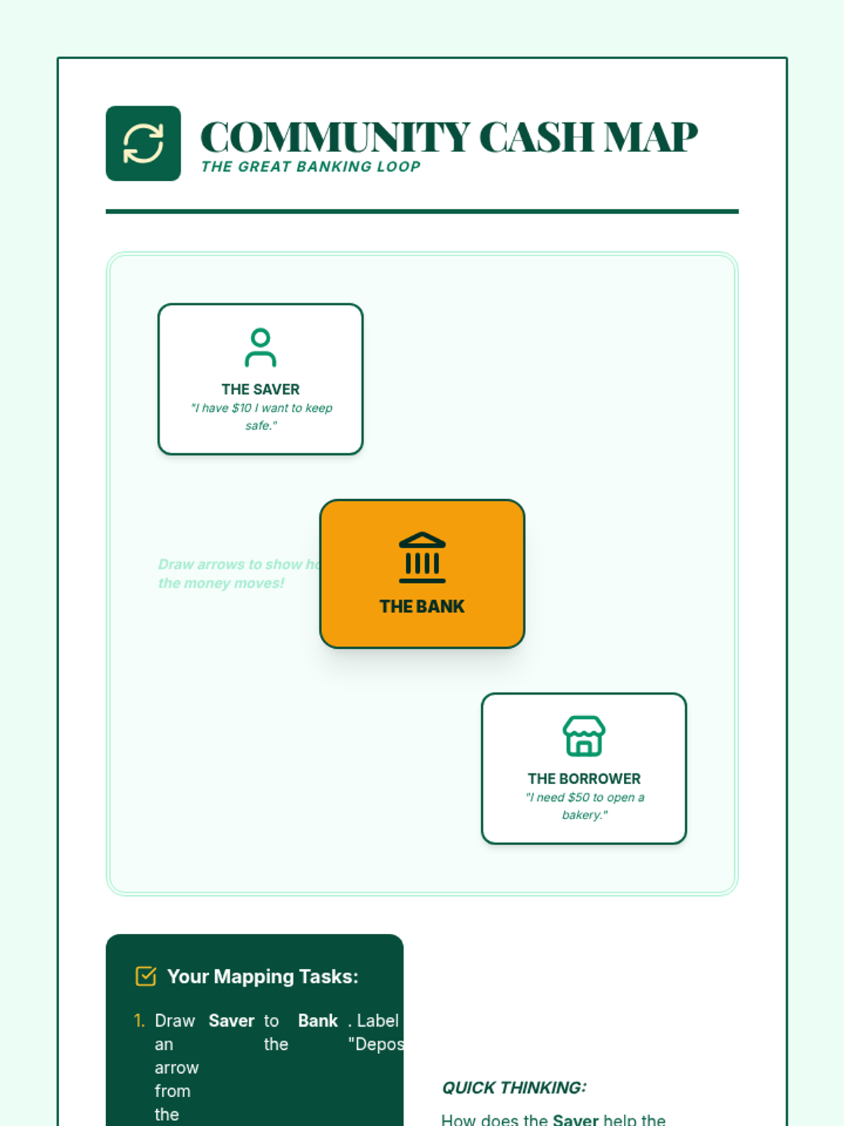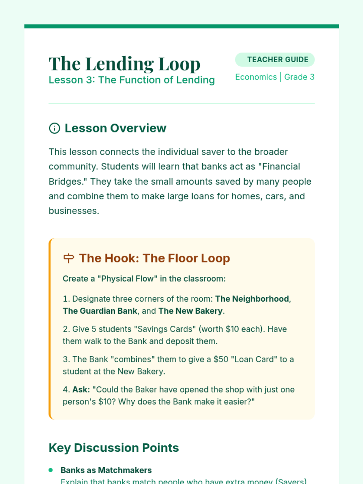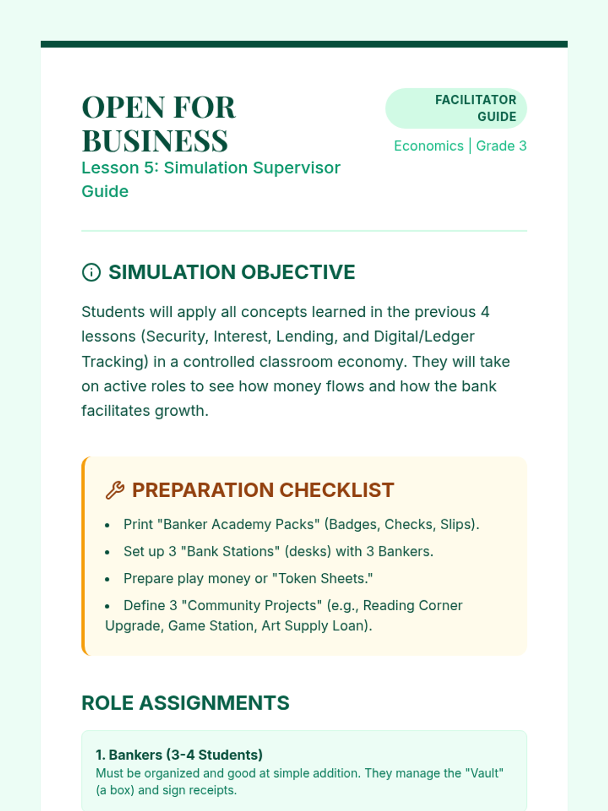 A 5-lesson sequence demystifying the role of banks as institutions that store money, lend capital, and facilitate the flow of currency. Students explore security, simple interest, lending systems, digital money, and participate in a final banking simulation.