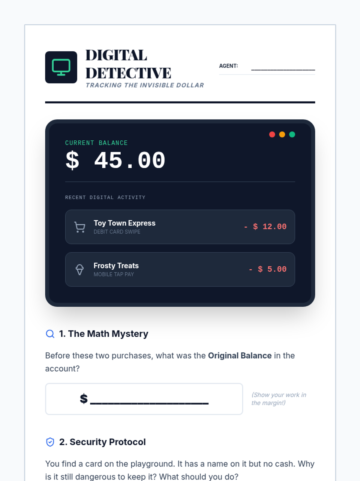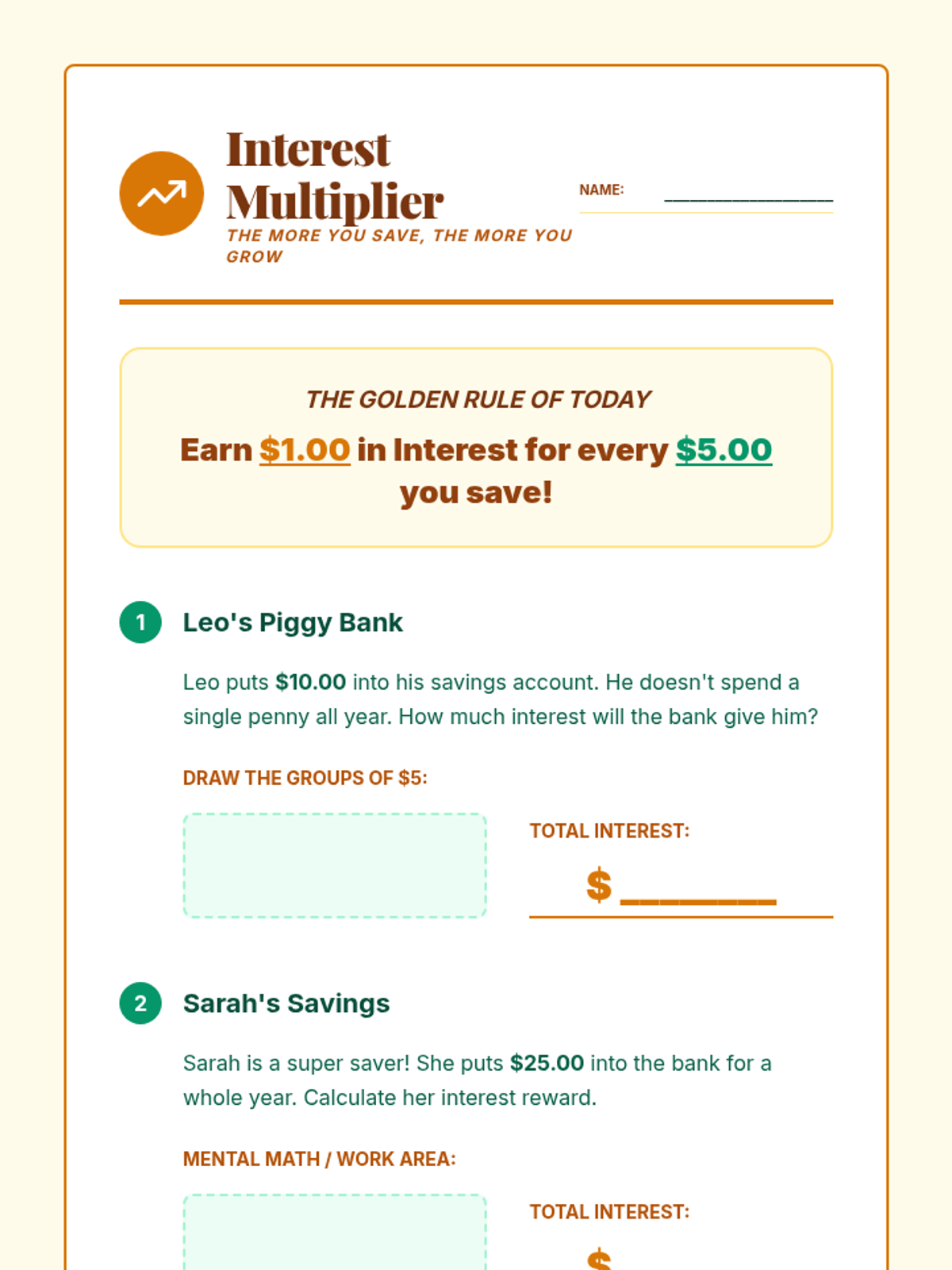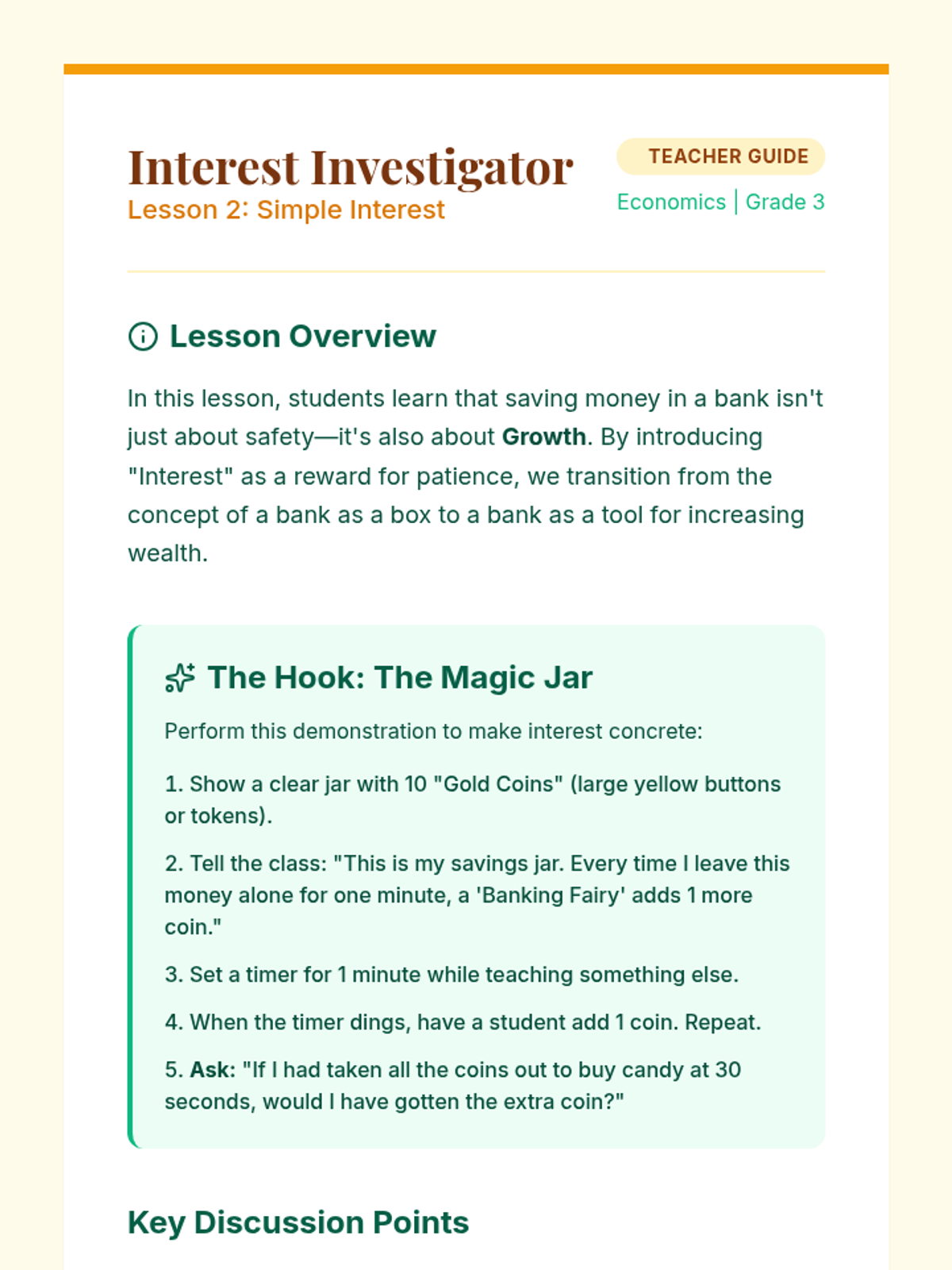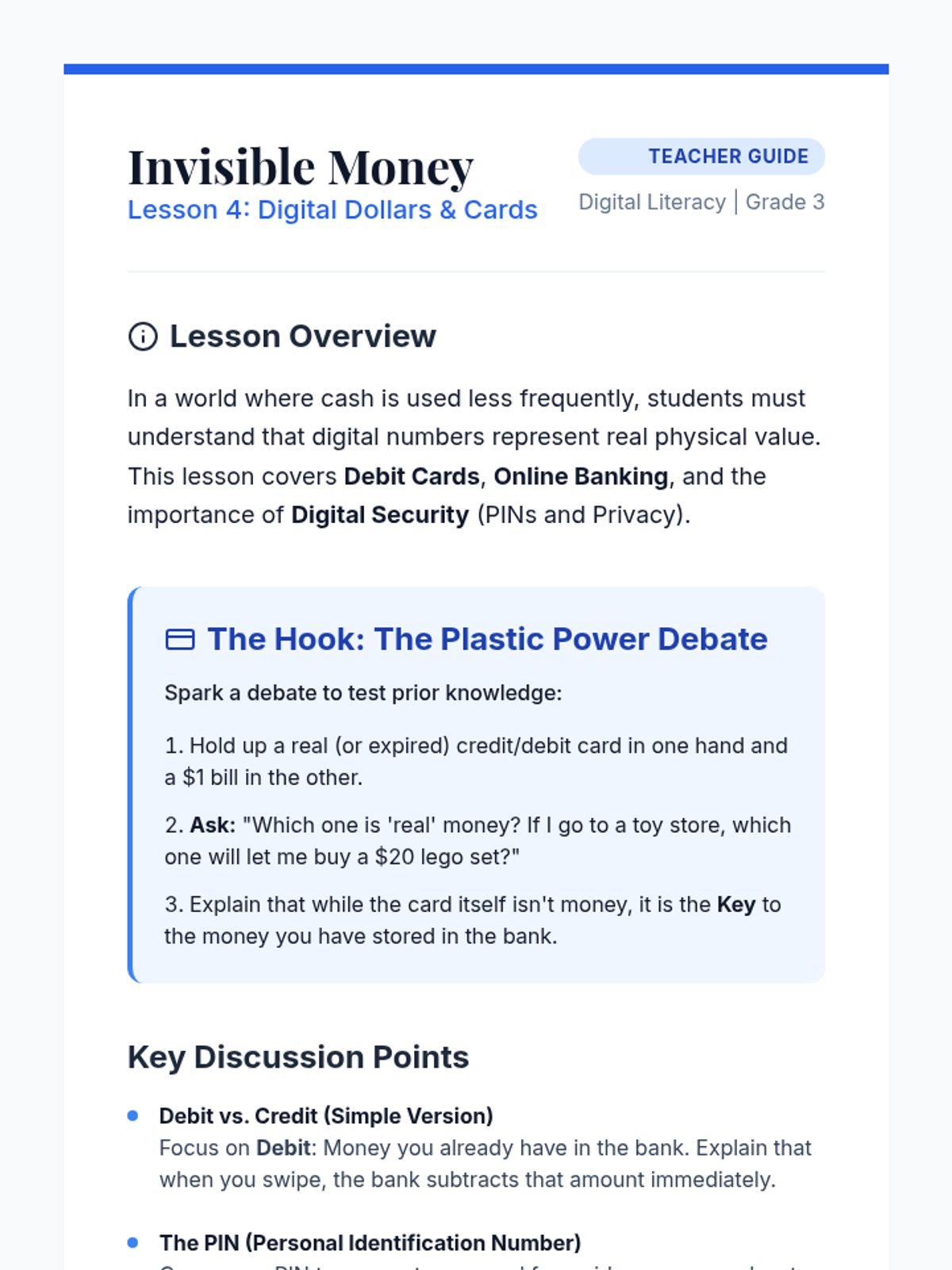 A 5-lesson sequence demystifying the role of banks as institutions that store money, lend capital, and facilitate the flow of currency. Students explore security, simple interest, lending systems, digital money, and participate in a final banking simulation.
