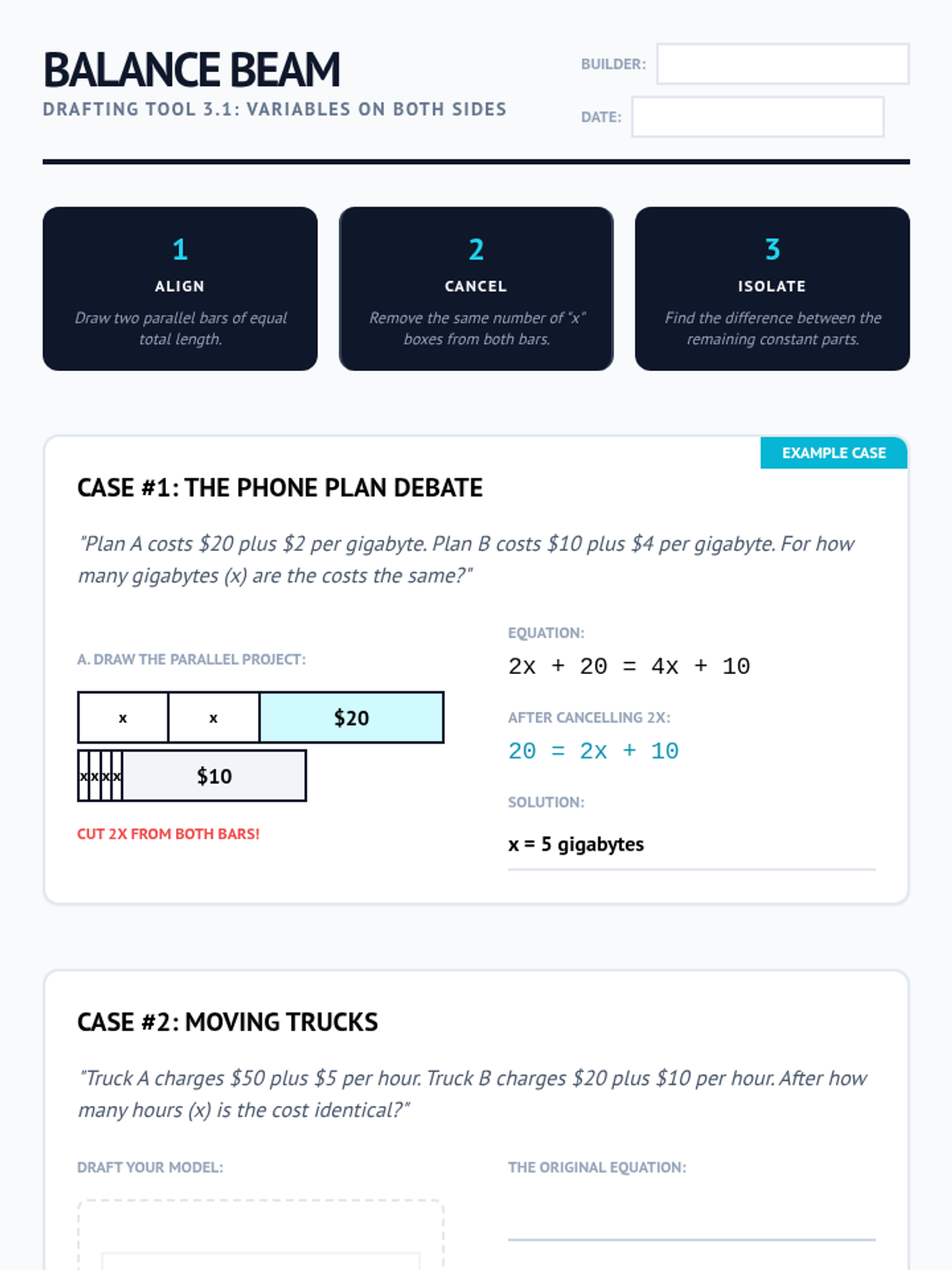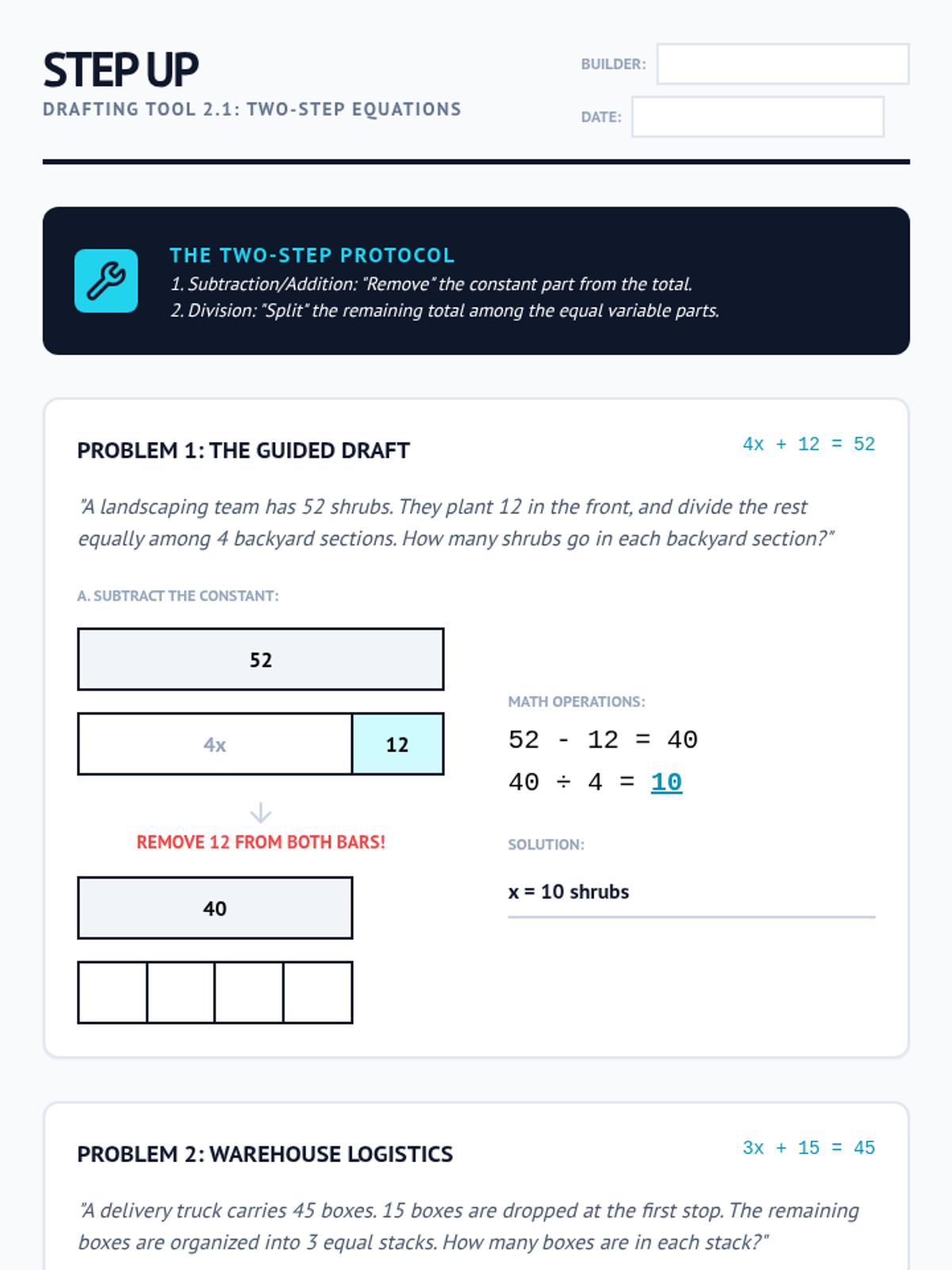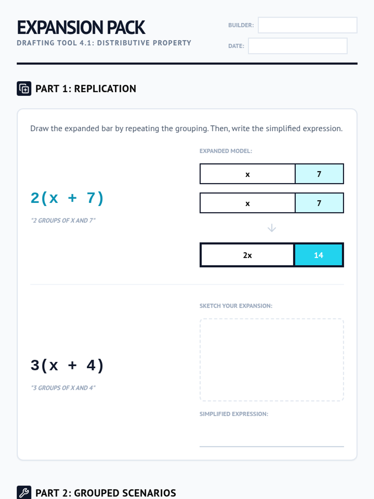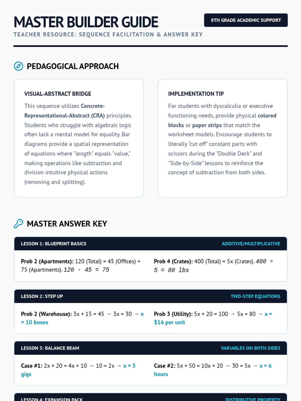 A comprehensive sequence focused on using bar models (tape diagrams) to bridge the gap between arithmetic reasoning and algebraic abstraction. Students progress from simple part-whole relationships to complex equations with variables on both sides and the distributive property.