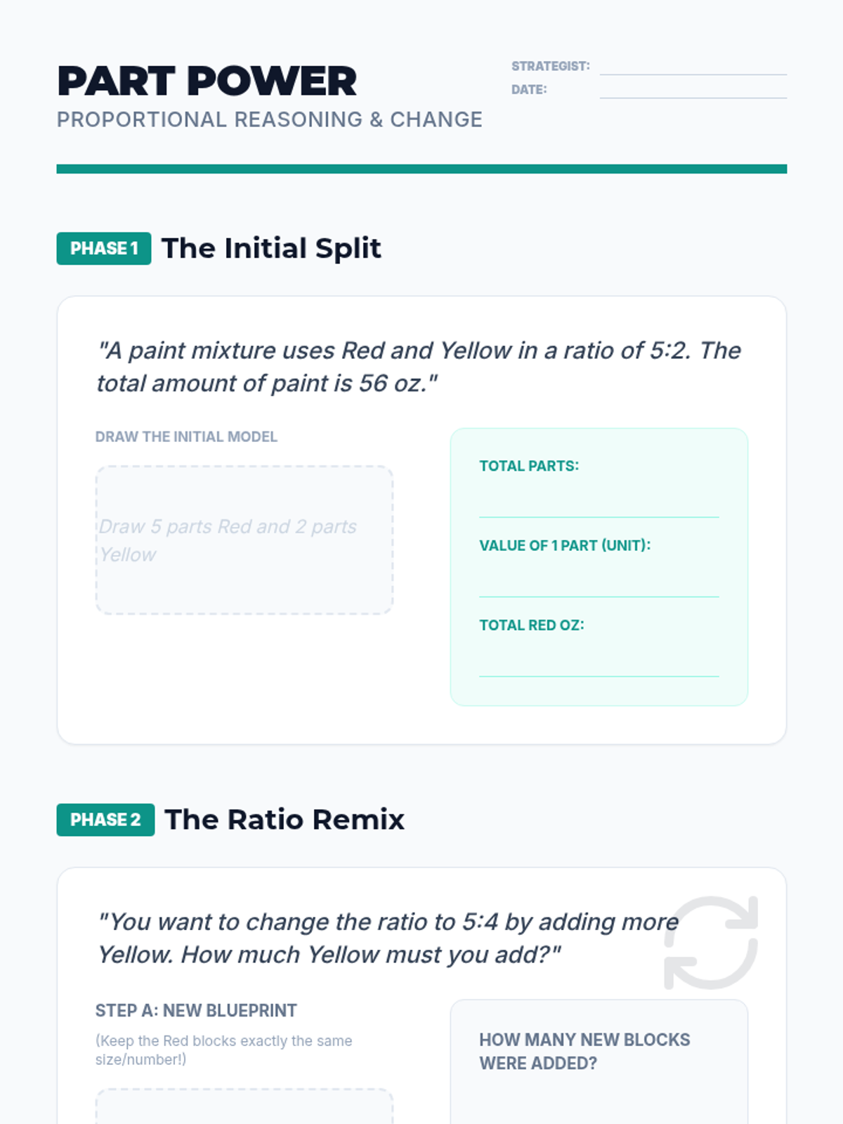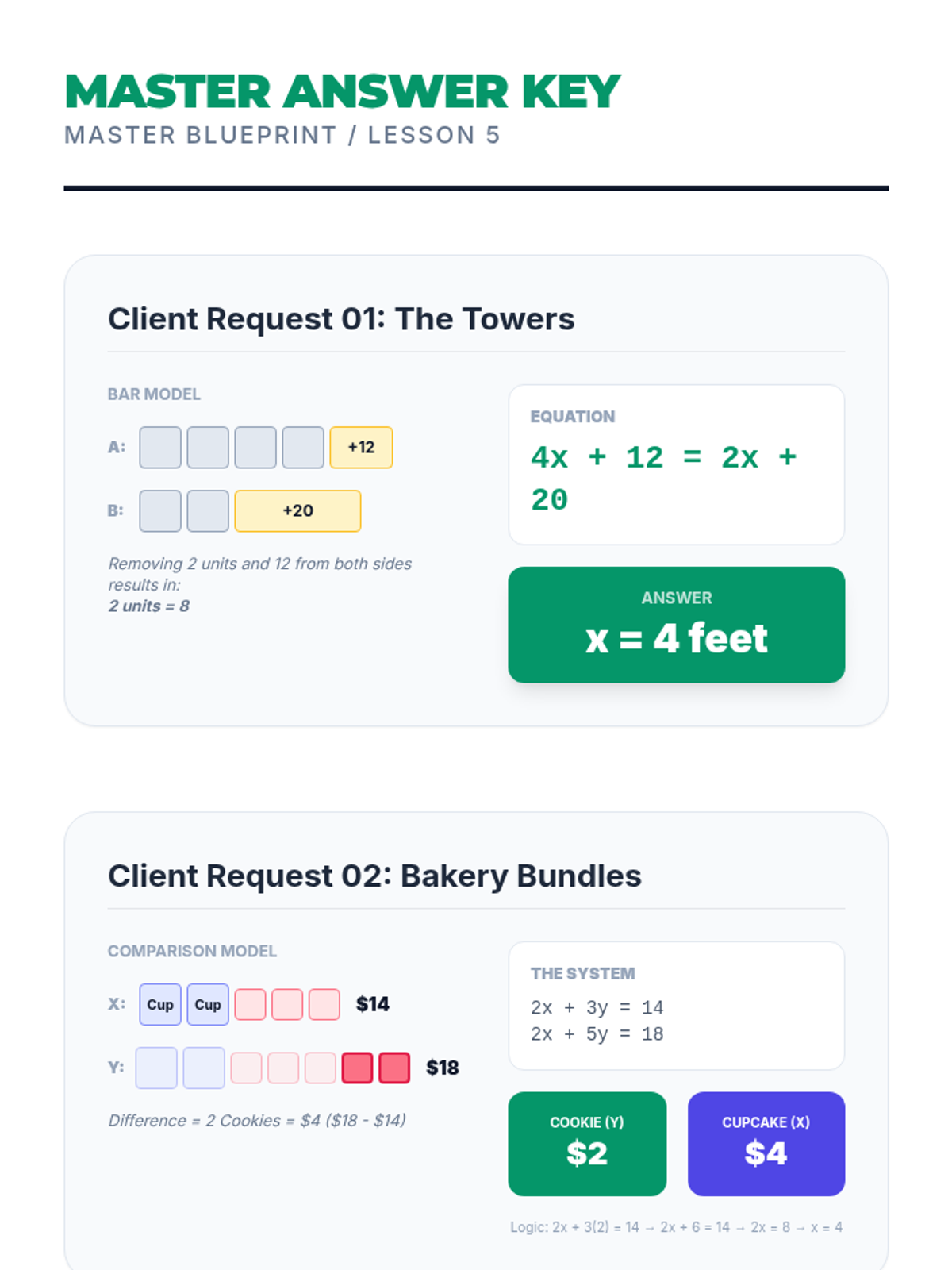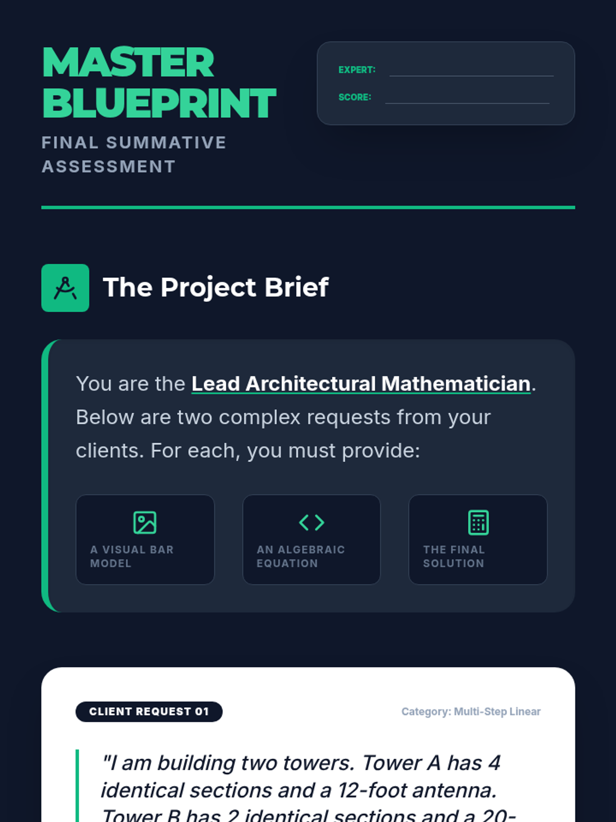 A sequence designed for 10th-grade students to master algebraic word problems using bar modeling. This visual approach scaffolds the transition from text-based problems to symbolic algebra, specifically supporting students who struggle with abstract math concepts.