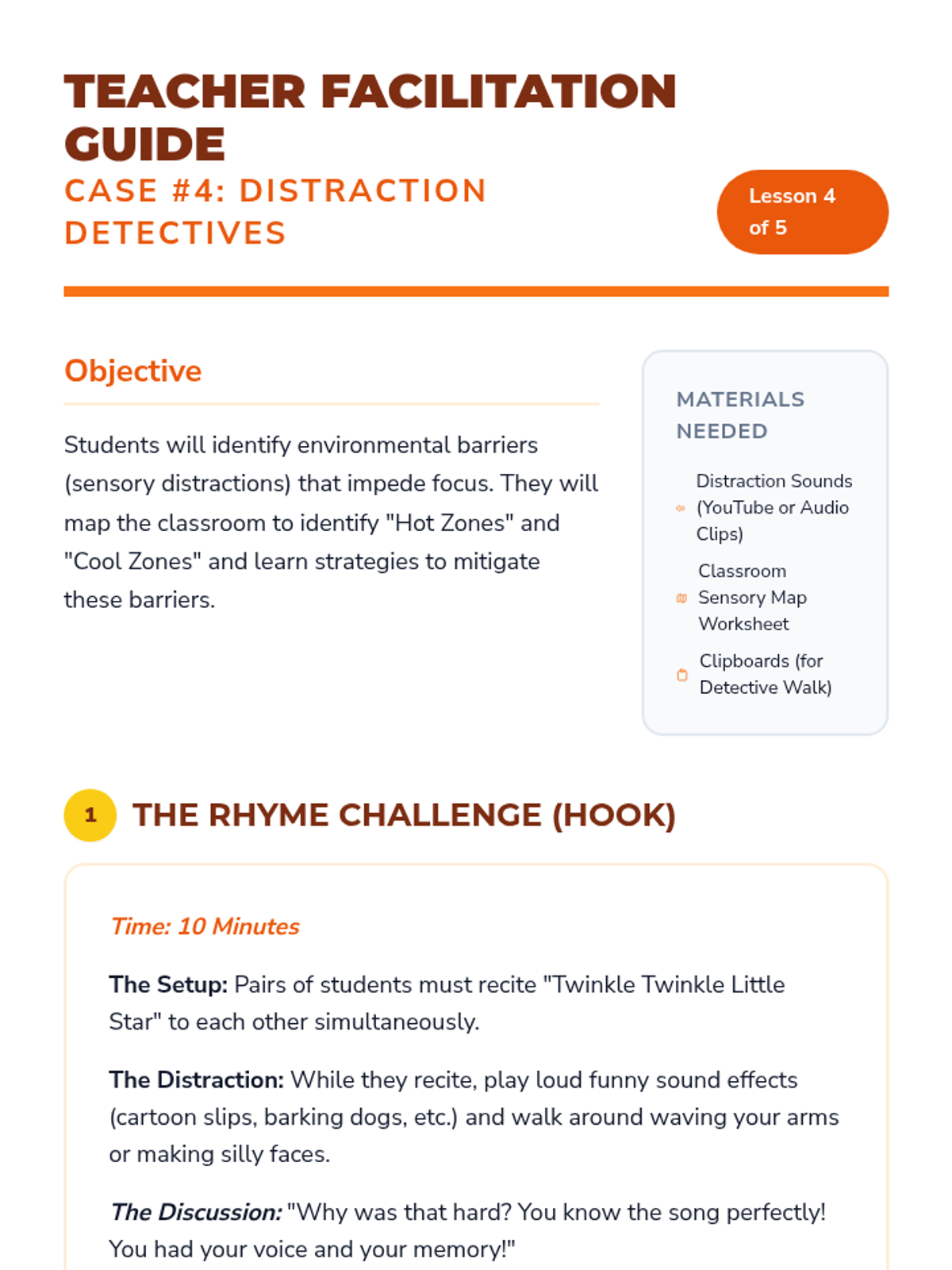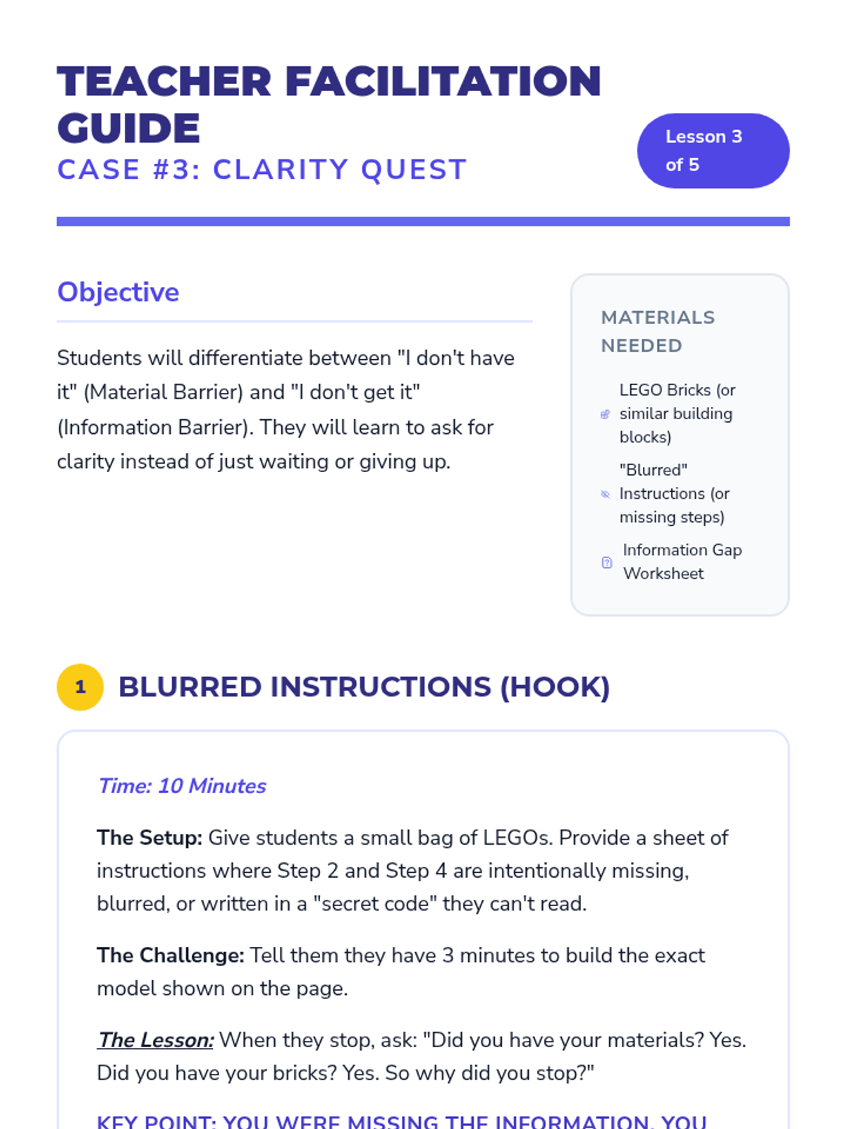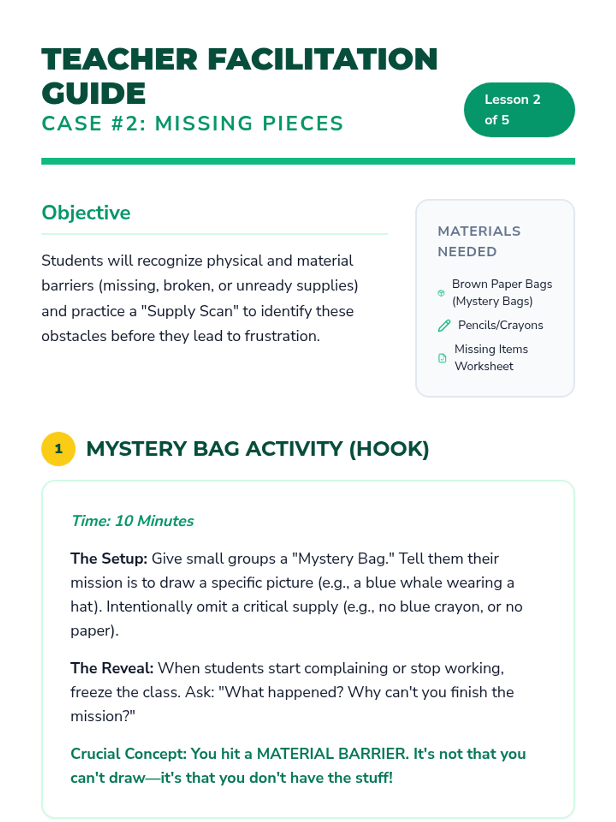 A 5-lesson unit for 3rd-grade students focused on identifying and categorizing obstacles that prevent task completion. Students learn to recognize internal emotional signals and external barriers (physical, informational, and environmental) to build self-advocacy and problem-solving skills.
