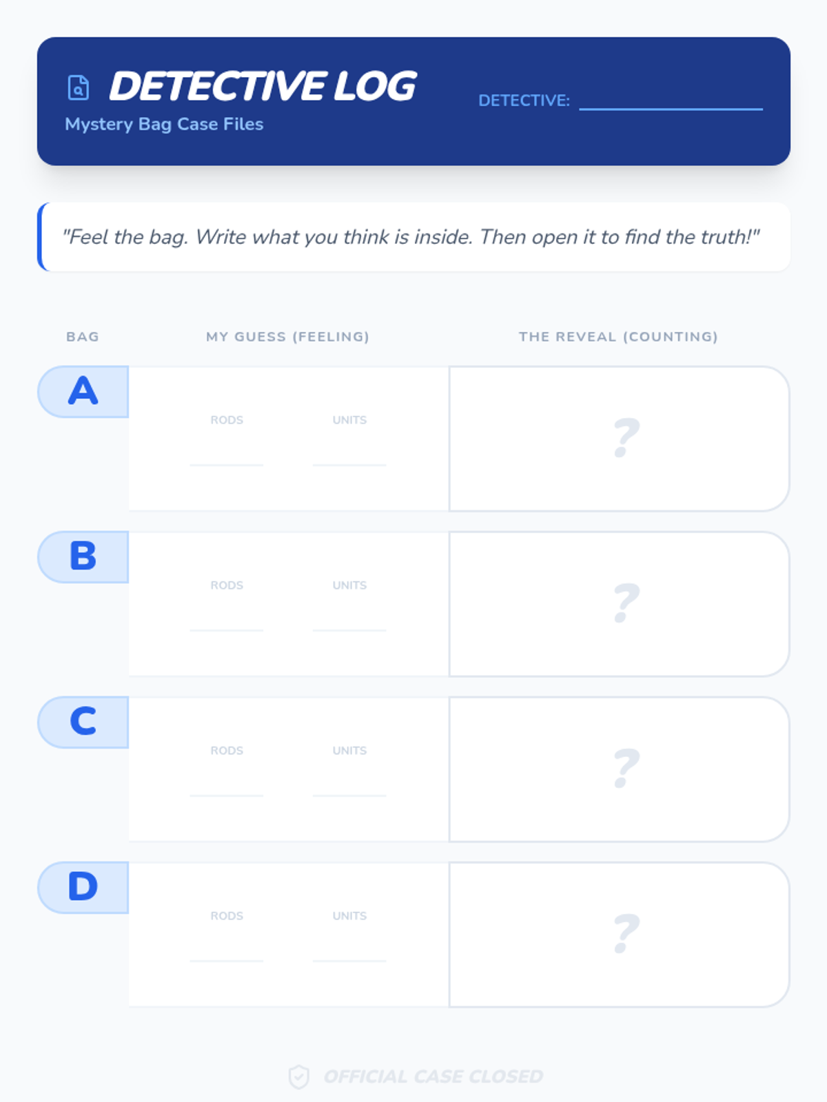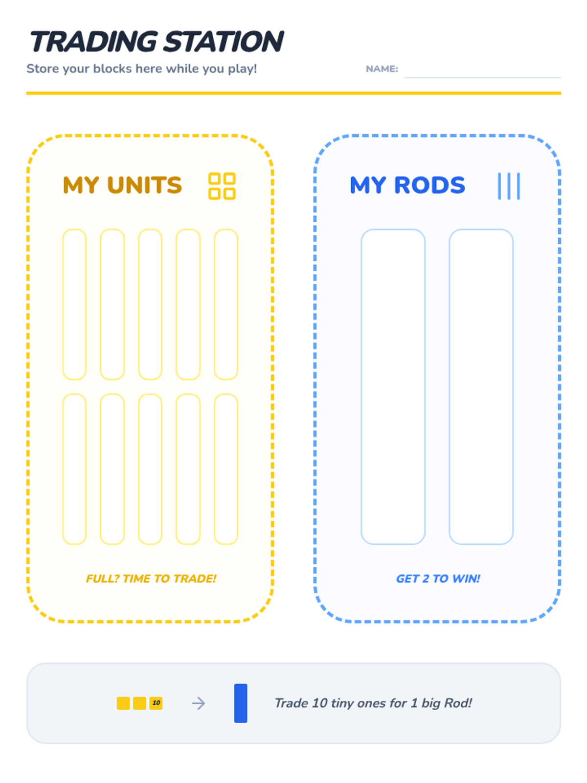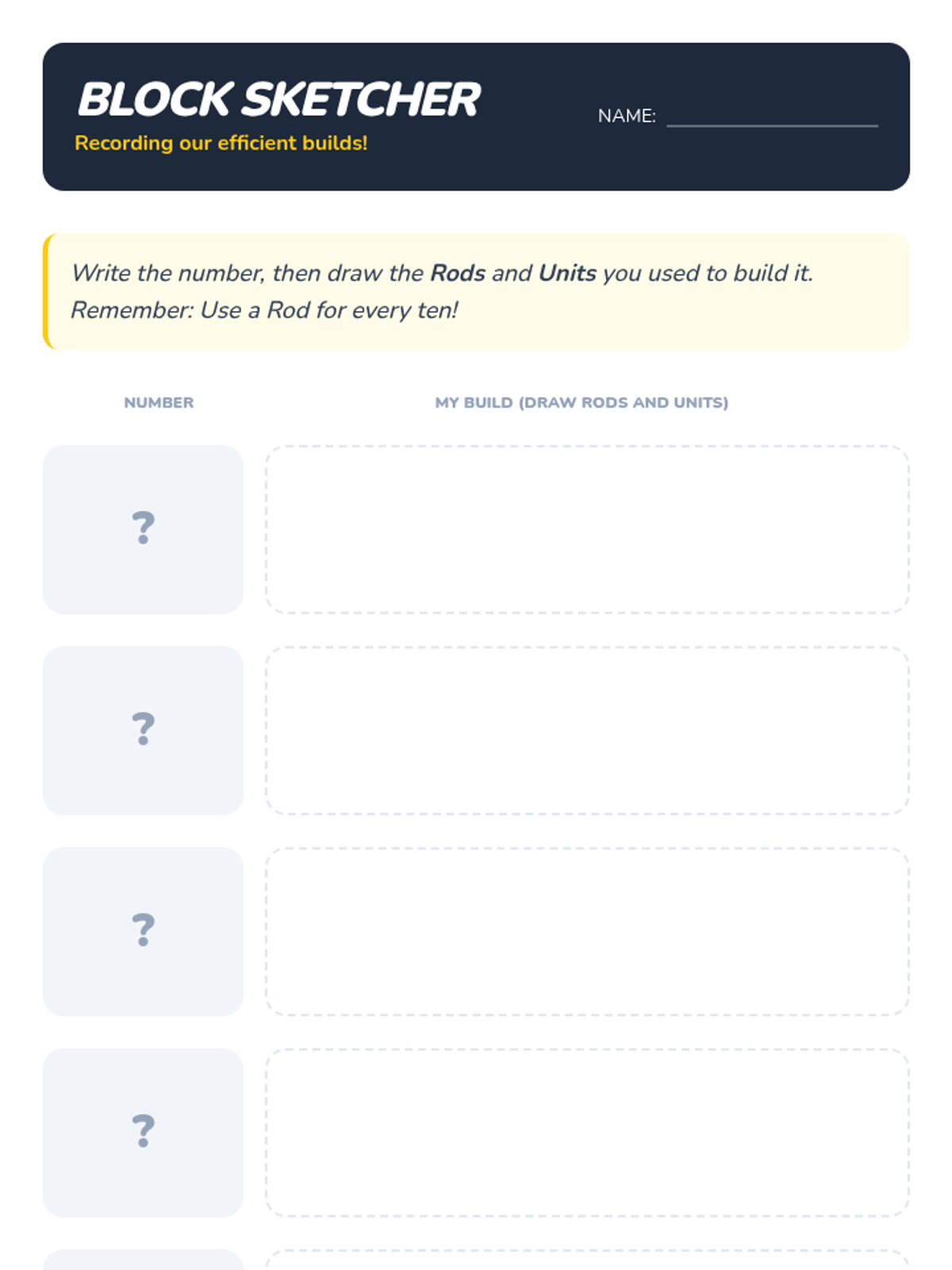 This kindergarten sequence introduces base-ten blocks (units and rods) through hands-on play and games. Students discover the relationship between ones and tens, practice efficient number building, and learn to 'trade' (regroup) and 'break' (decompose) blocks to prepare for multi-digit arithmetic.