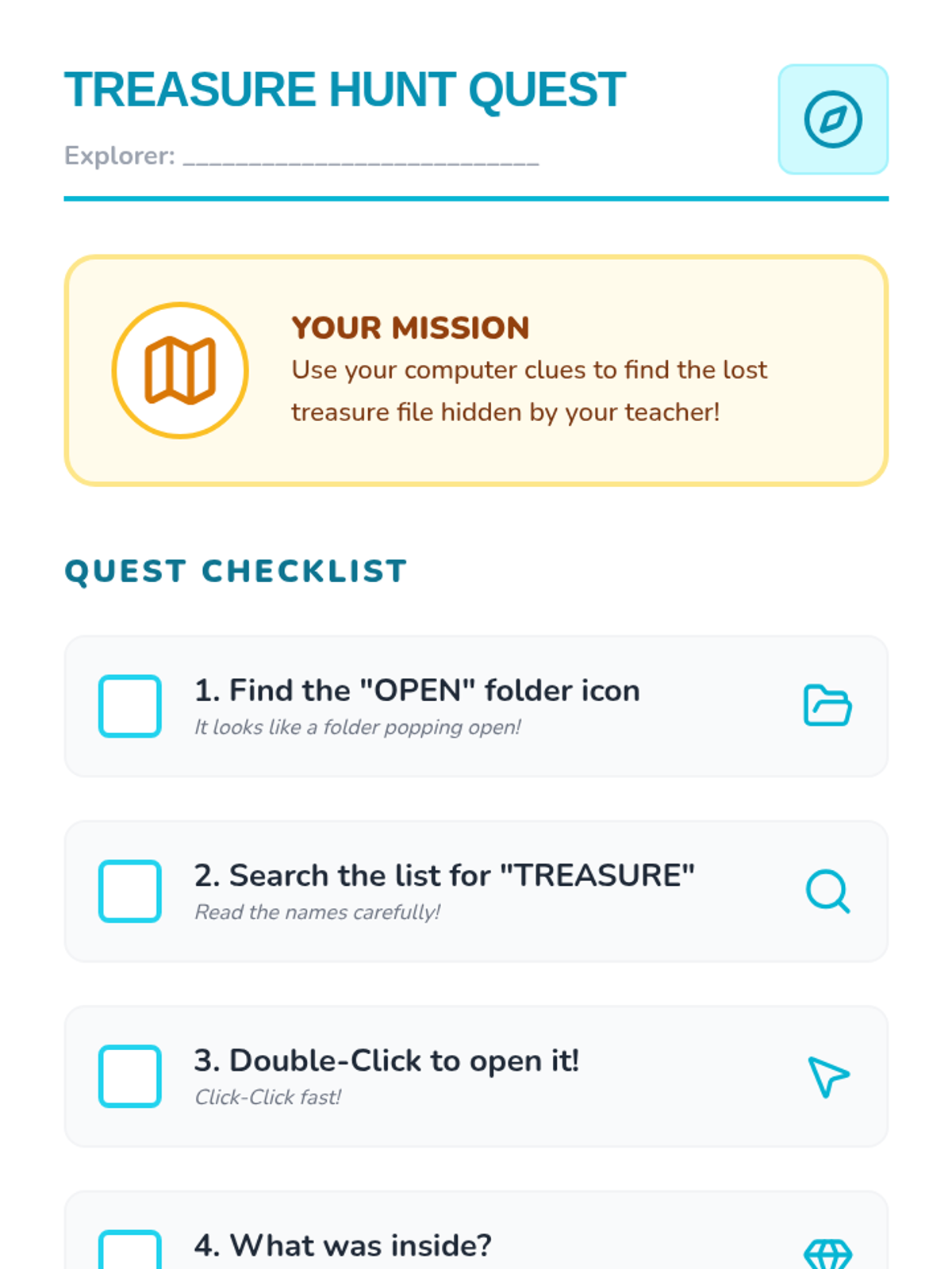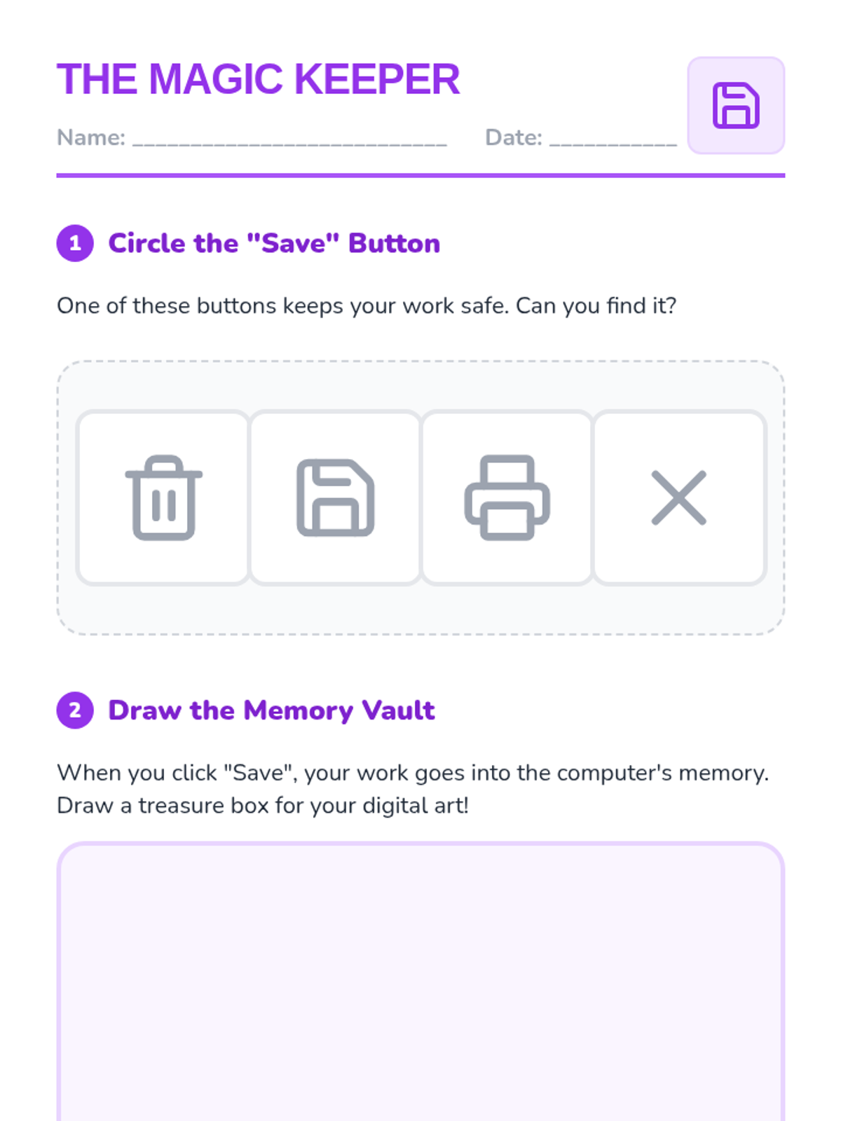 This sequence introduces 1st-grade students to the concepts of creating, saving, naming, and retrieving digital files. Through hands-on activities and analogies, students learn that digital work must be intentionally 'kept' to be accessed later.