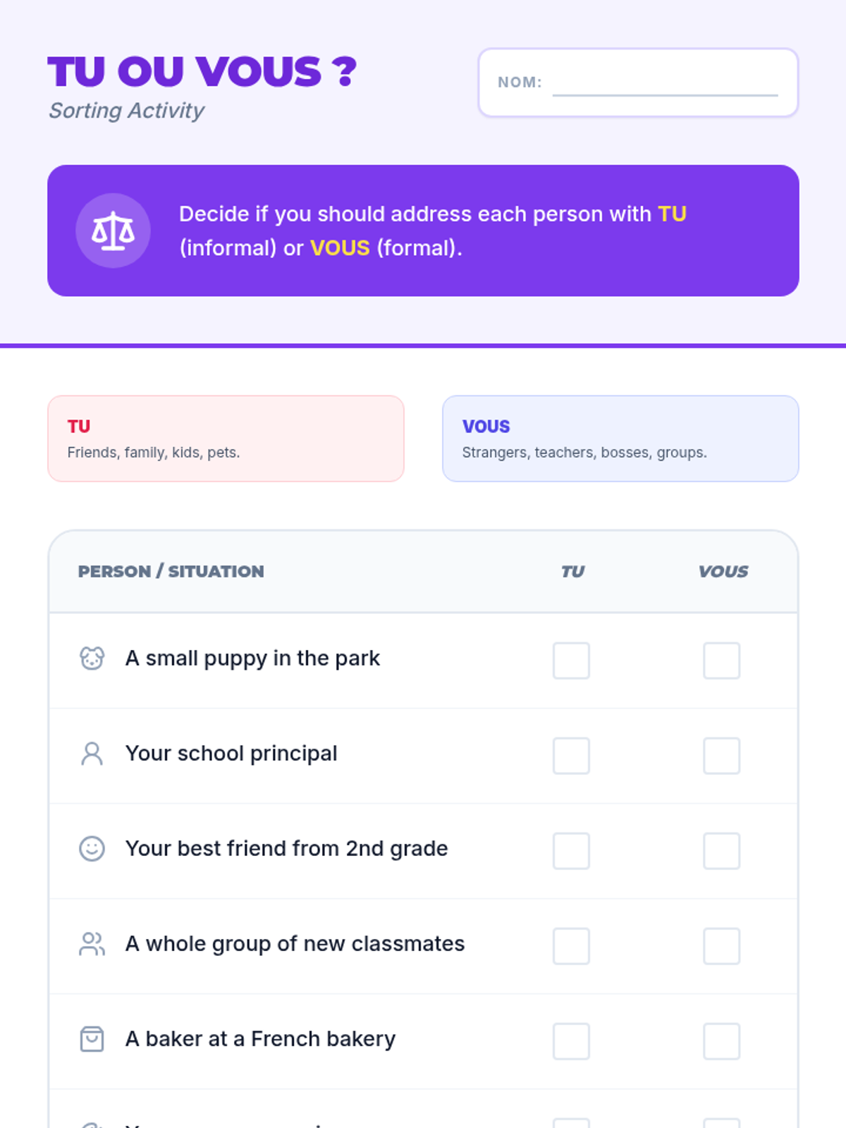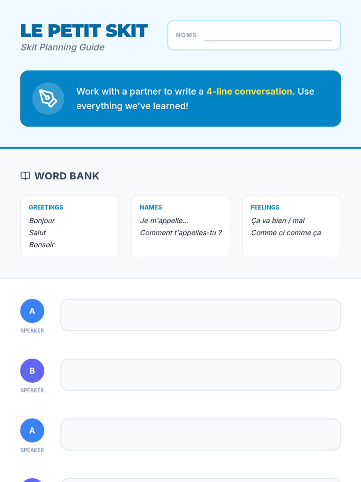 This sequence introduces 5th-grade students to foundational French communication, focusing on greetings, introductions, and cultural nuances of address. Through interactive games and role-play, students build the confidence to conduct basic social exchanges in French.