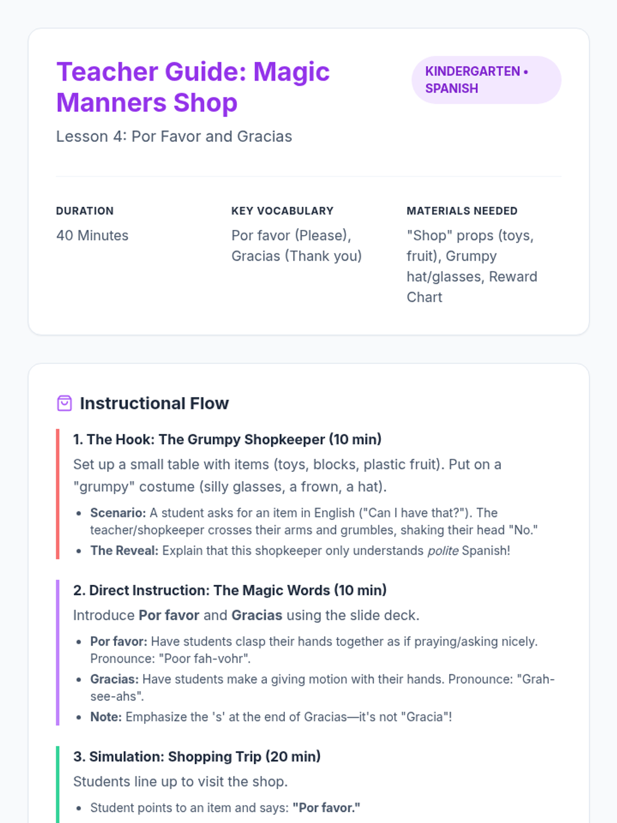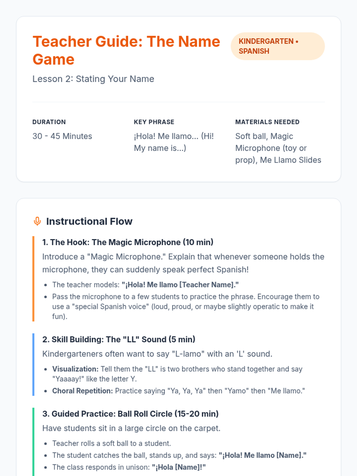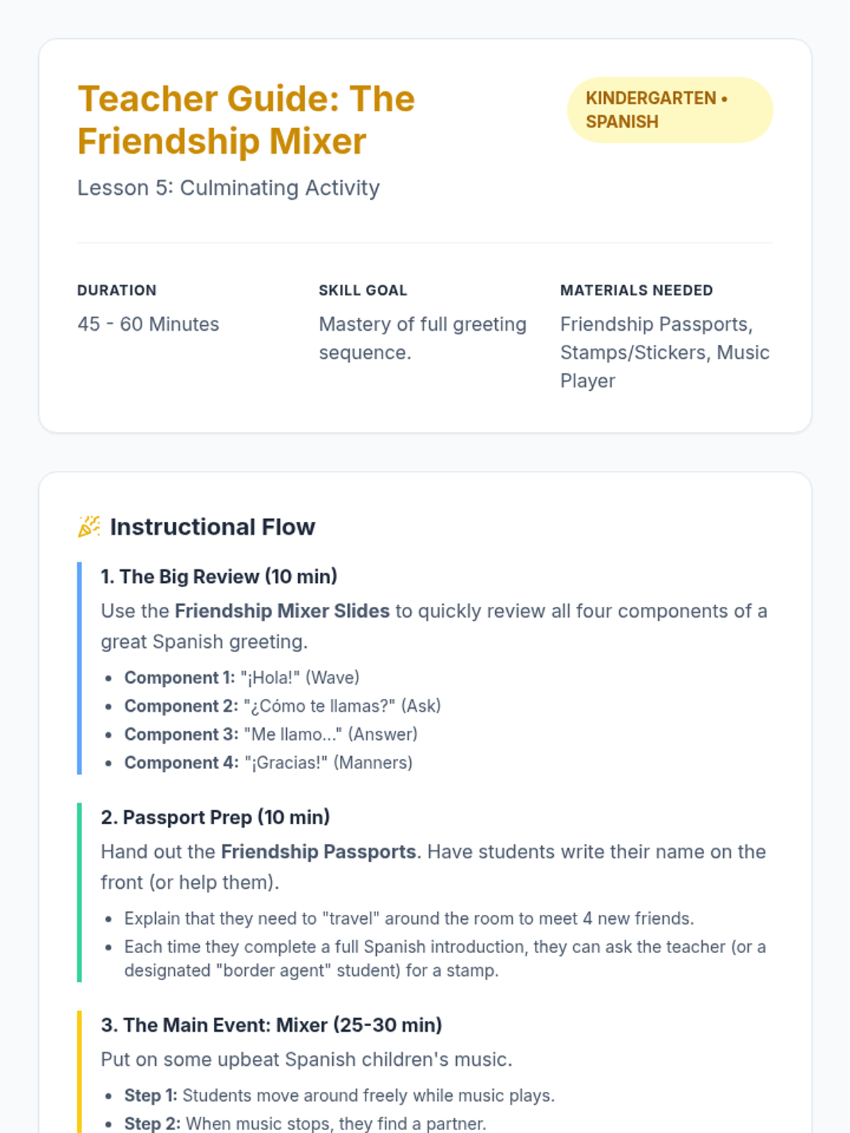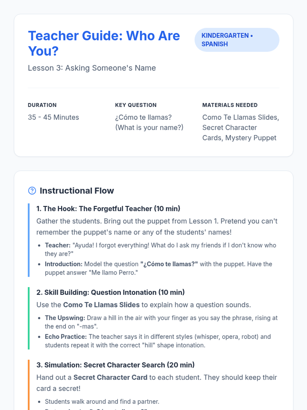 A fun, interactive introduction to Spanish greetings and self-introductions for Kindergarten students. This unit uses puppets, games, and music to build oral confidence and basic social skills in a second language.