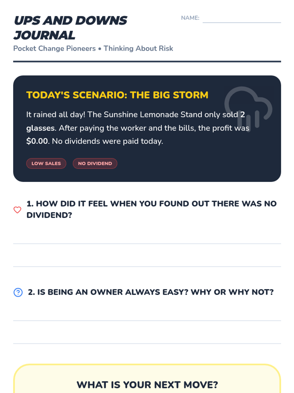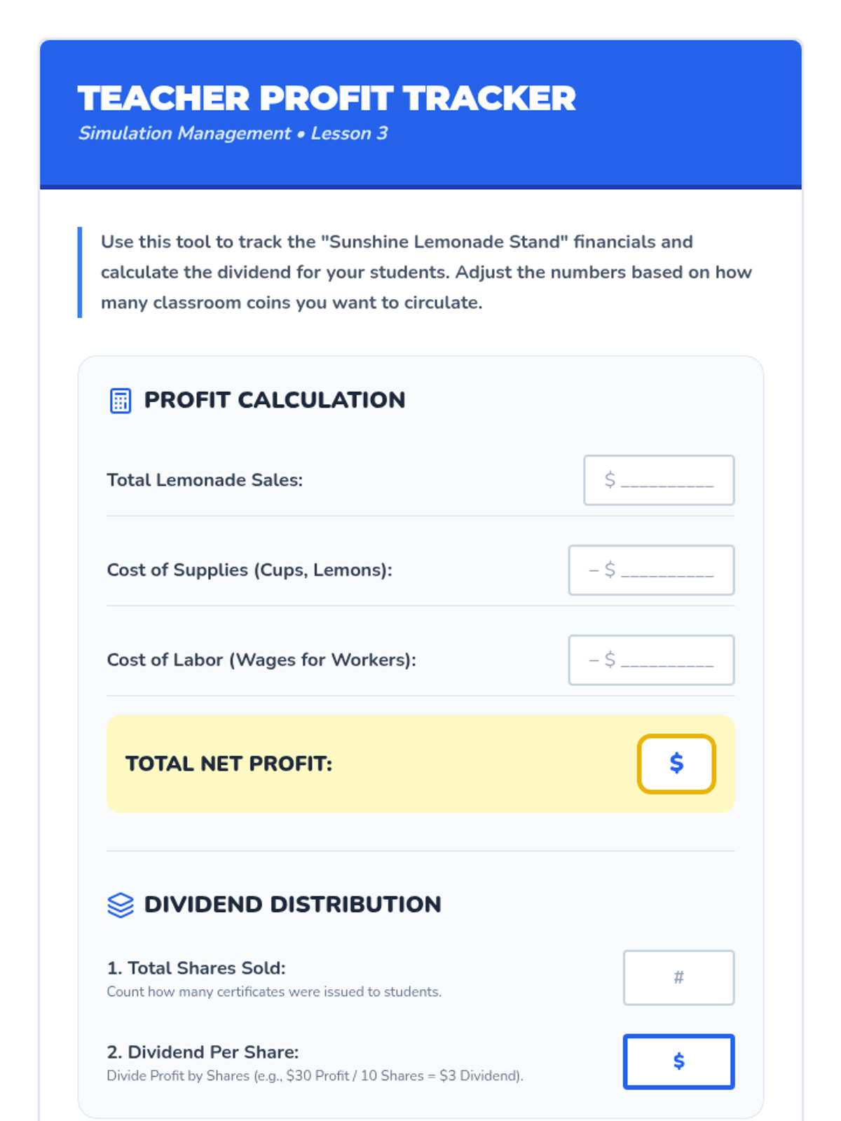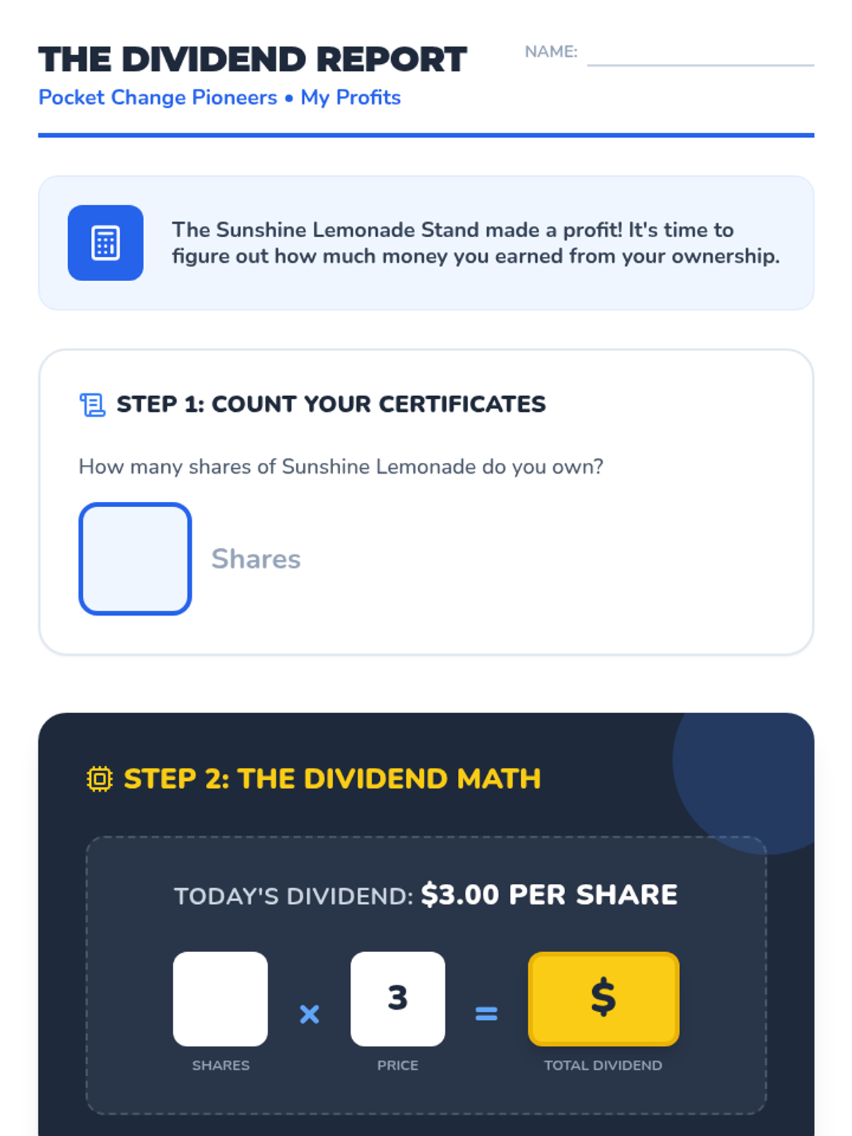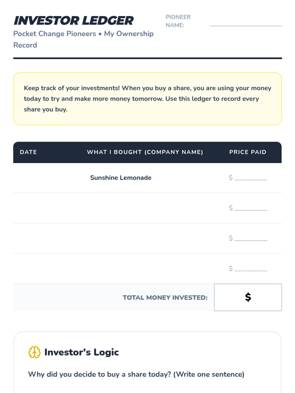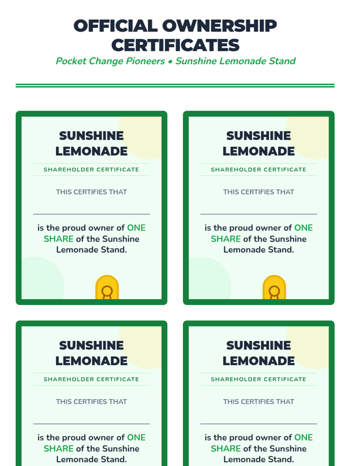 A series of 5 lessons for 2nd graders to understand basic investment concepts through the lens of ownership. Students learn the difference between working for a wage and owning an asset that generates value, using a lemonade stand simulation to explore shares, profits, dividends, and risk.
