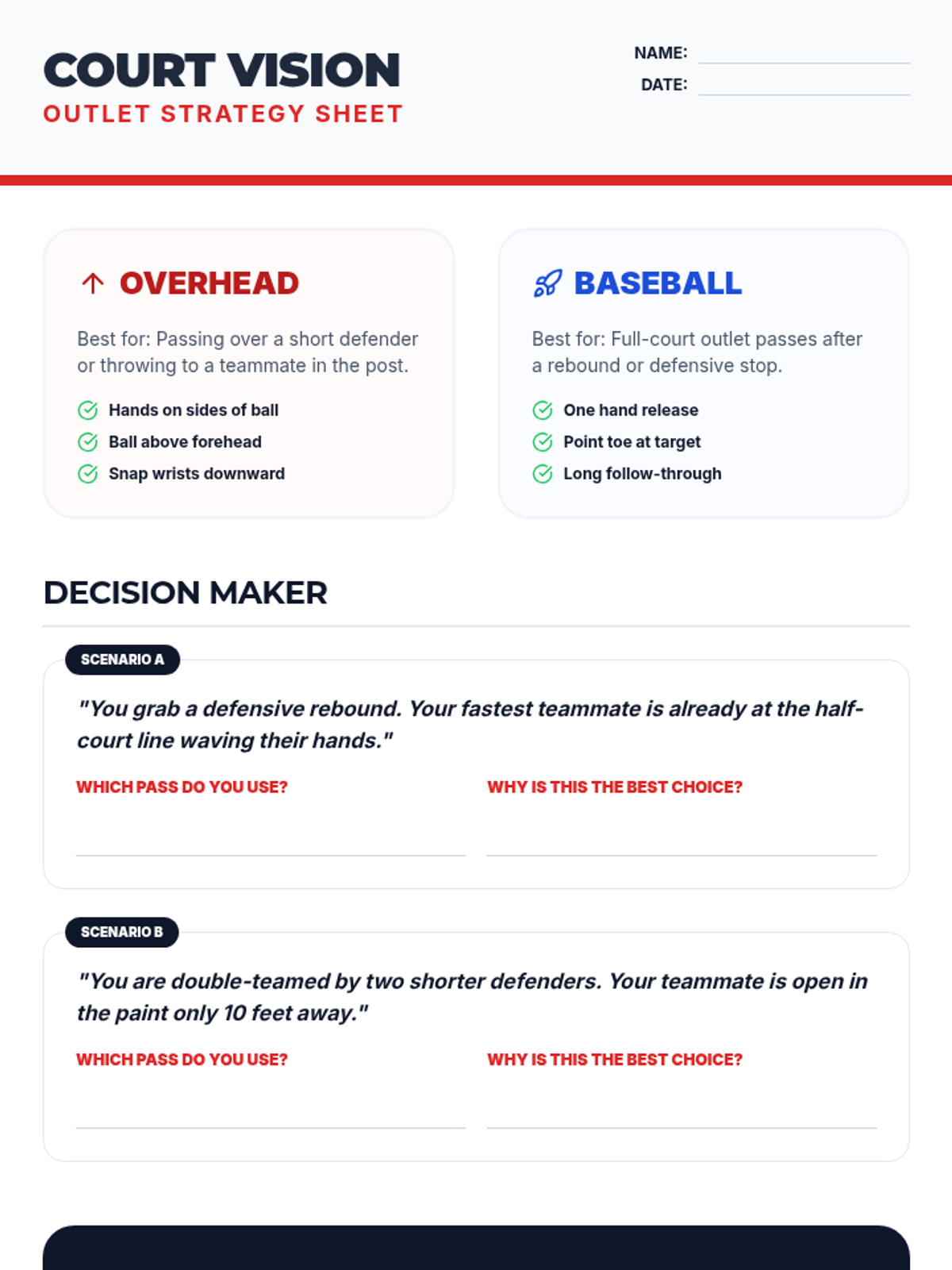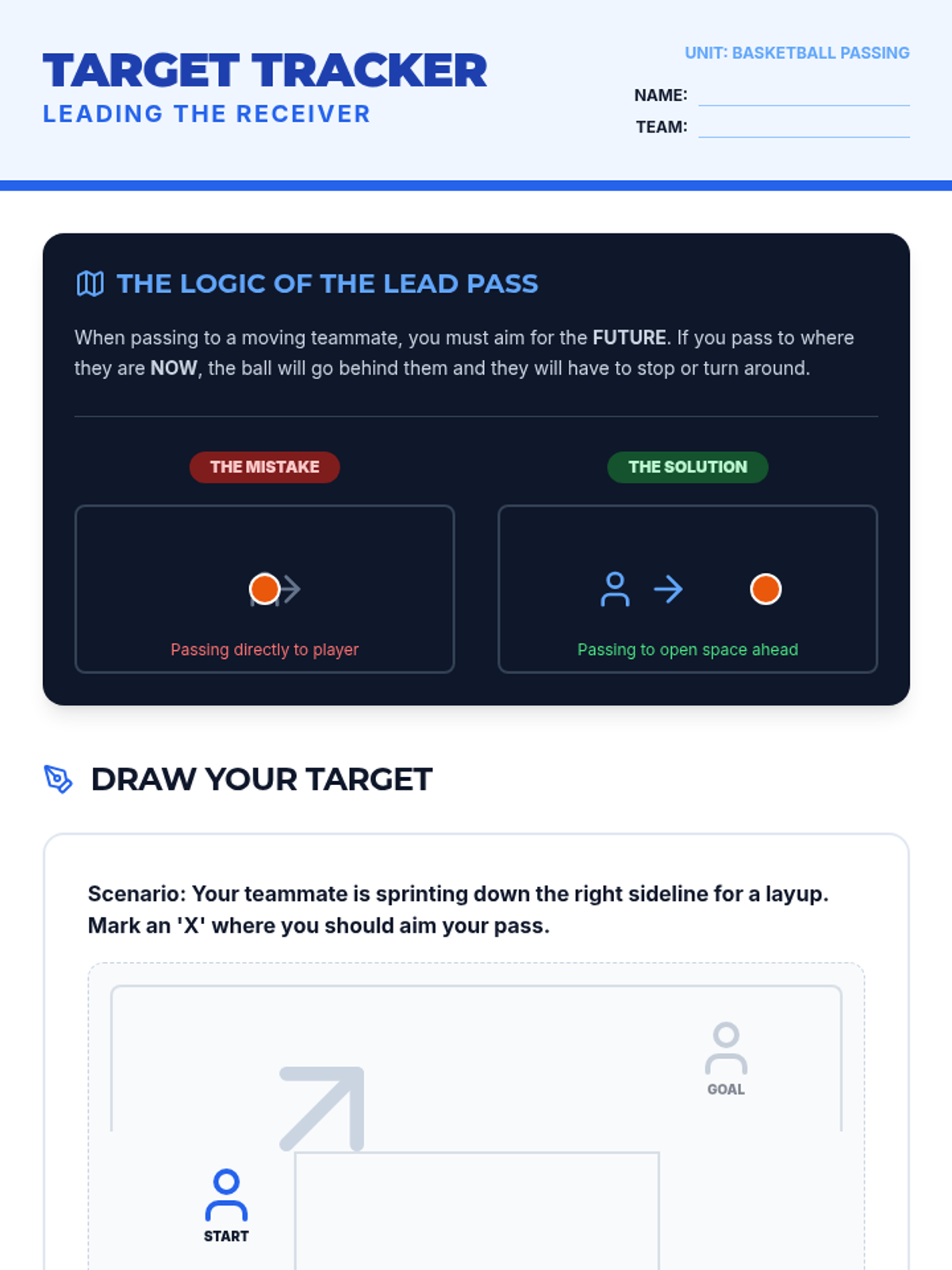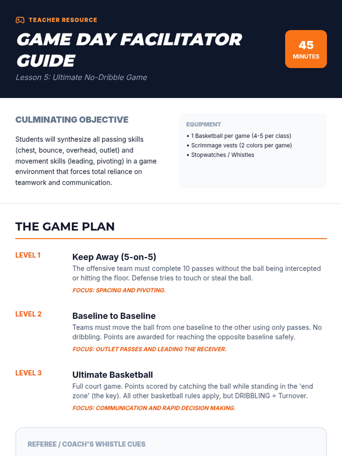 A 5th-grade physical education unit focused on the mechanics and strategy of basketball passing. Students transition from stationary passing to dynamic movement, pivoting for angles, and long-range outlet passes, culminating in no-dribble games that emphasize teamwork and communication.