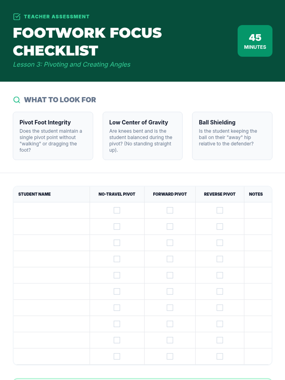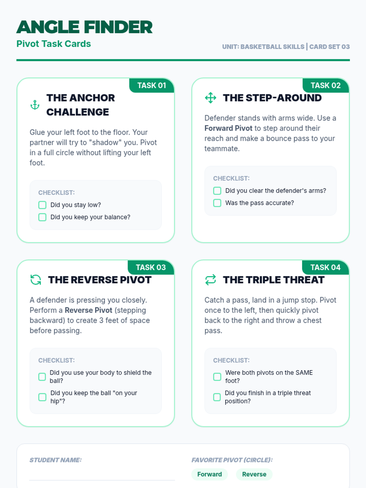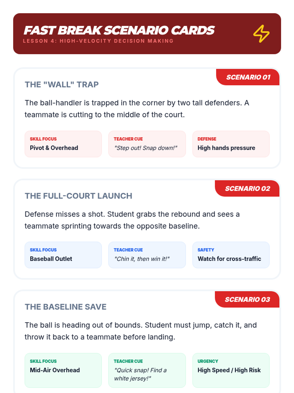 A 5th-grade physical education unit focused on the mechanics and strategy of basketball passing. Students transition from stationary passing to dynamic movement, pivoting for angles, and long-range outlet passes, culminating in no-dribble games that emphasize teamwork and communication.