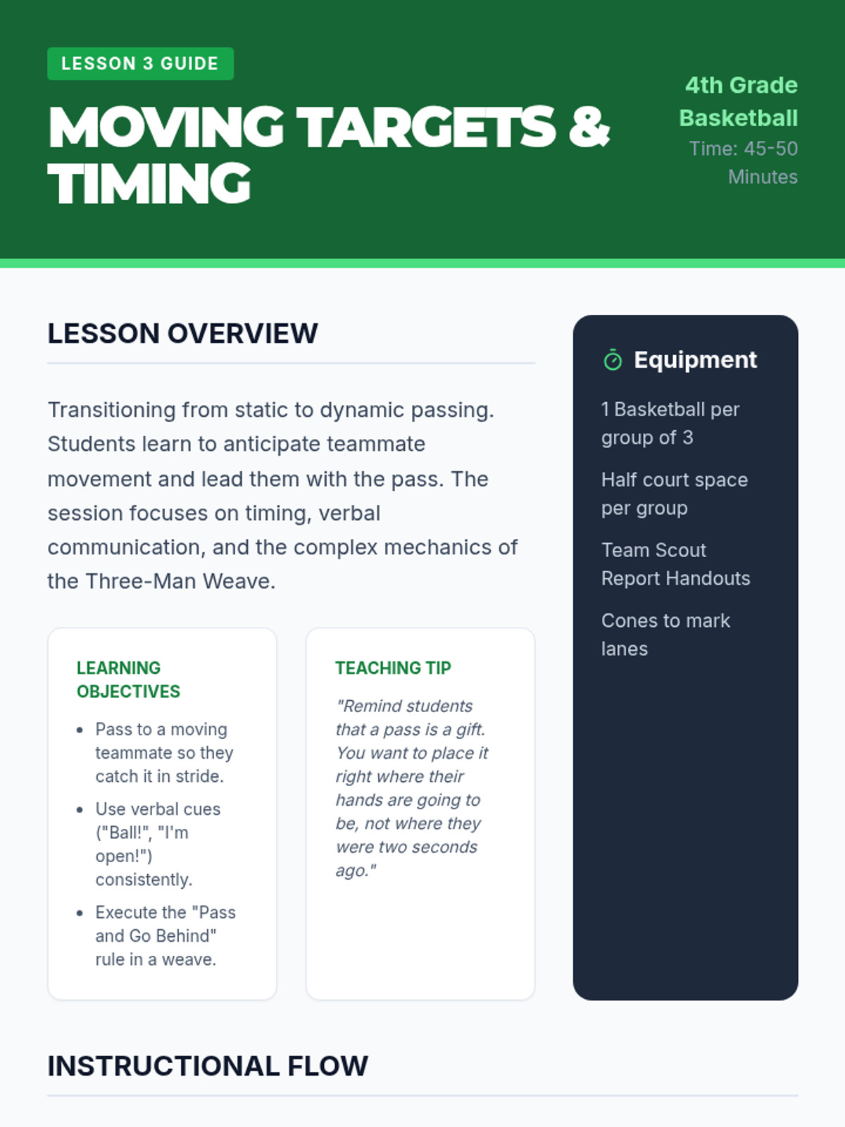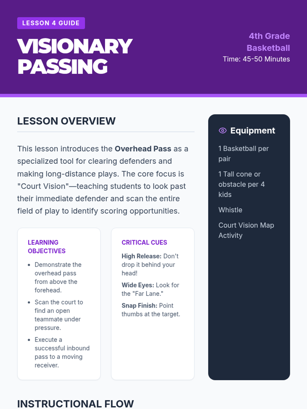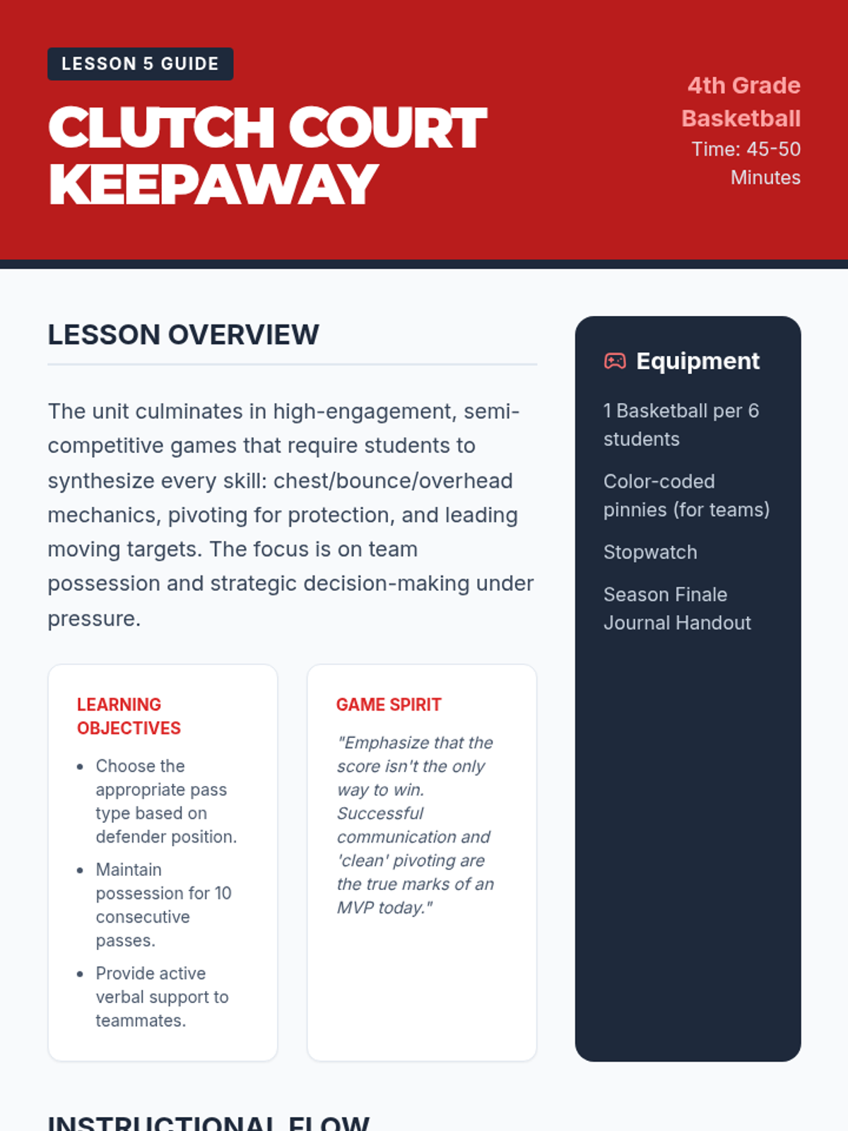 A comprehensive basketball unit for 4th graders focusing on the mechanics of passing, pivoting, and team communication. Students progress from static passing form to dynamic movement and decision-making under pressure.