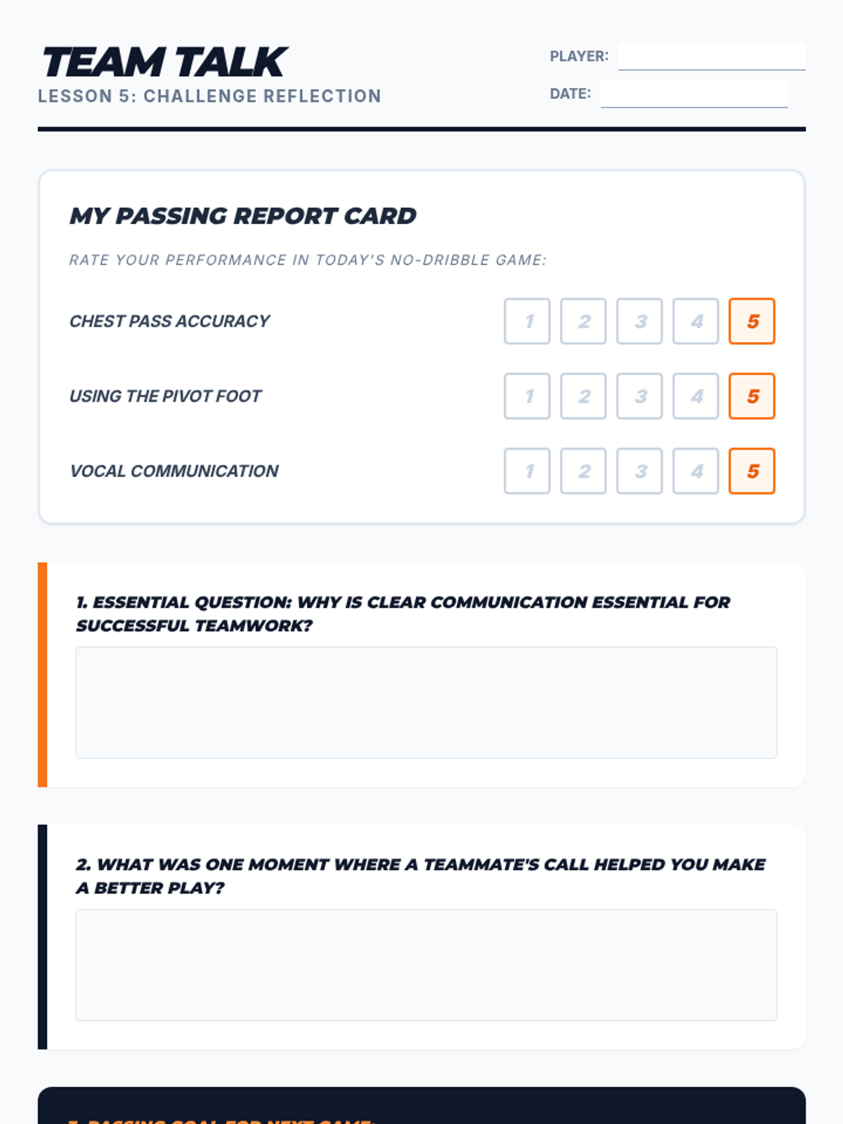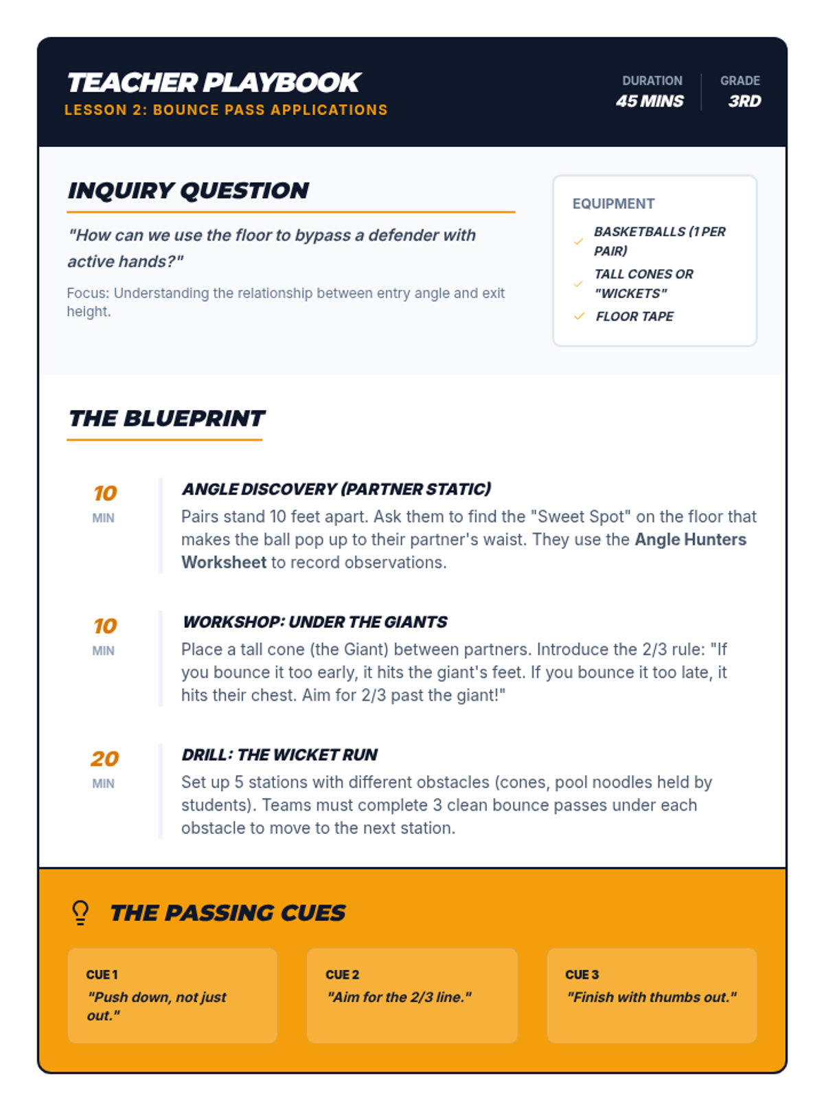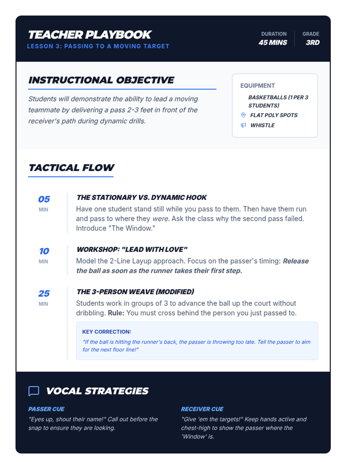 A 5-lesson sequence for 3rd Grade students focusing on basketball passing mechanics, strategic bounce passes, leading moving targets, triple-threat positioning, and collaborative team communication without dribbling.