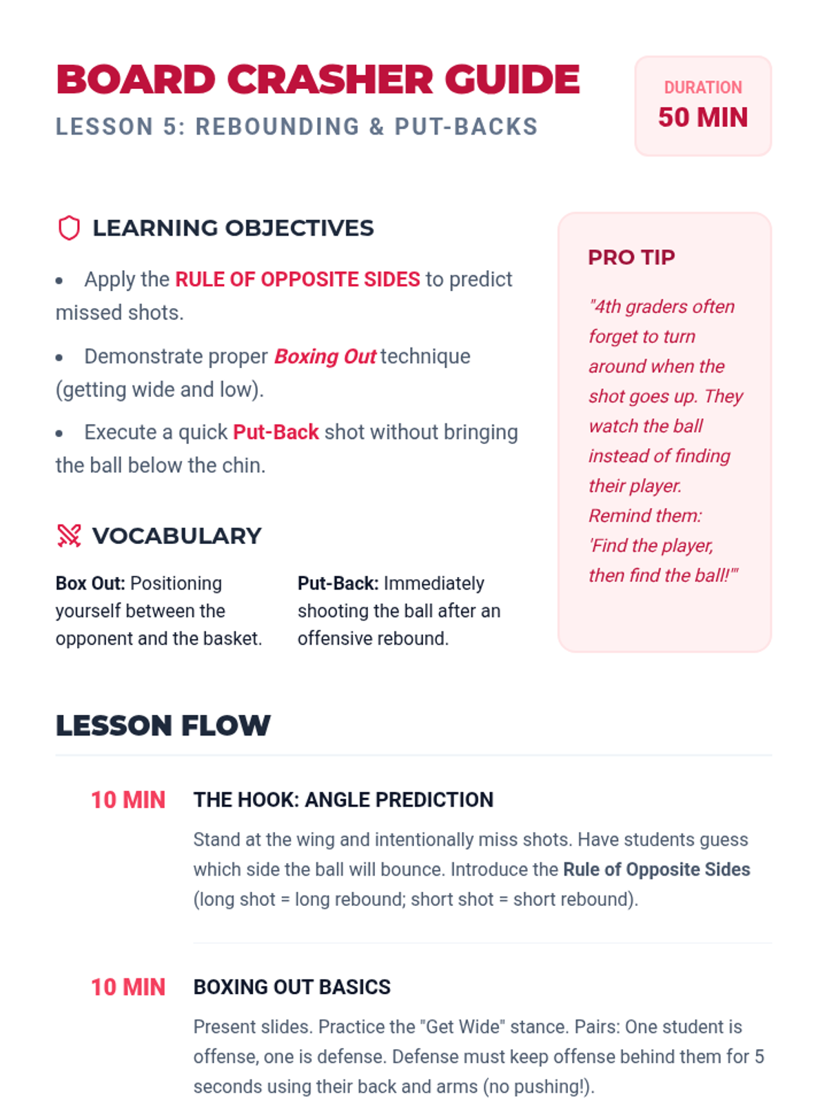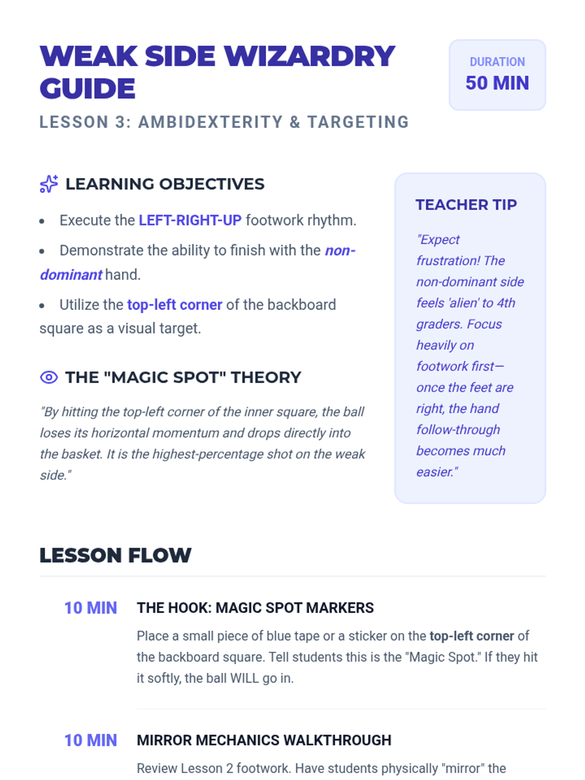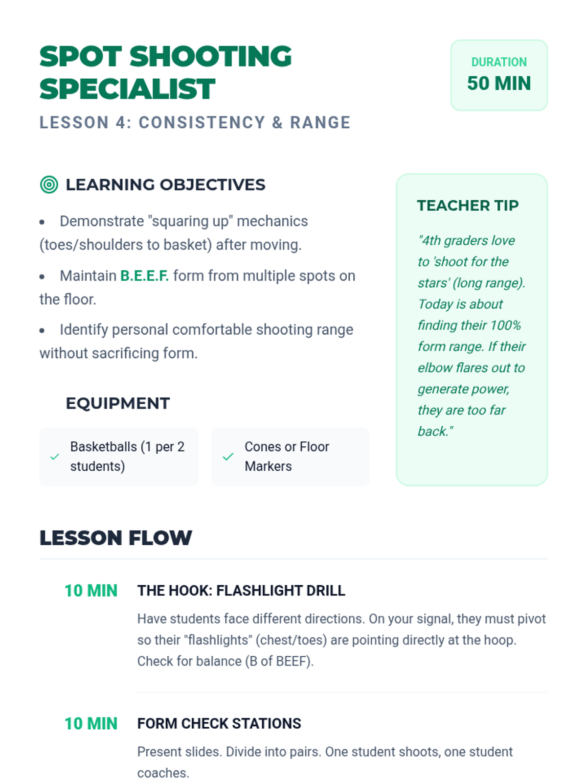 A comprehensive 5-lesson sequence for 4th graders focused on shooting mechanics using the BEEF principle, layup footwork on both sides, and rebounding techniques. This unit moves from static form to dynamic movement on the court.