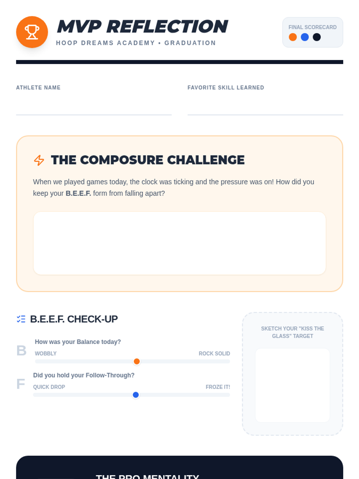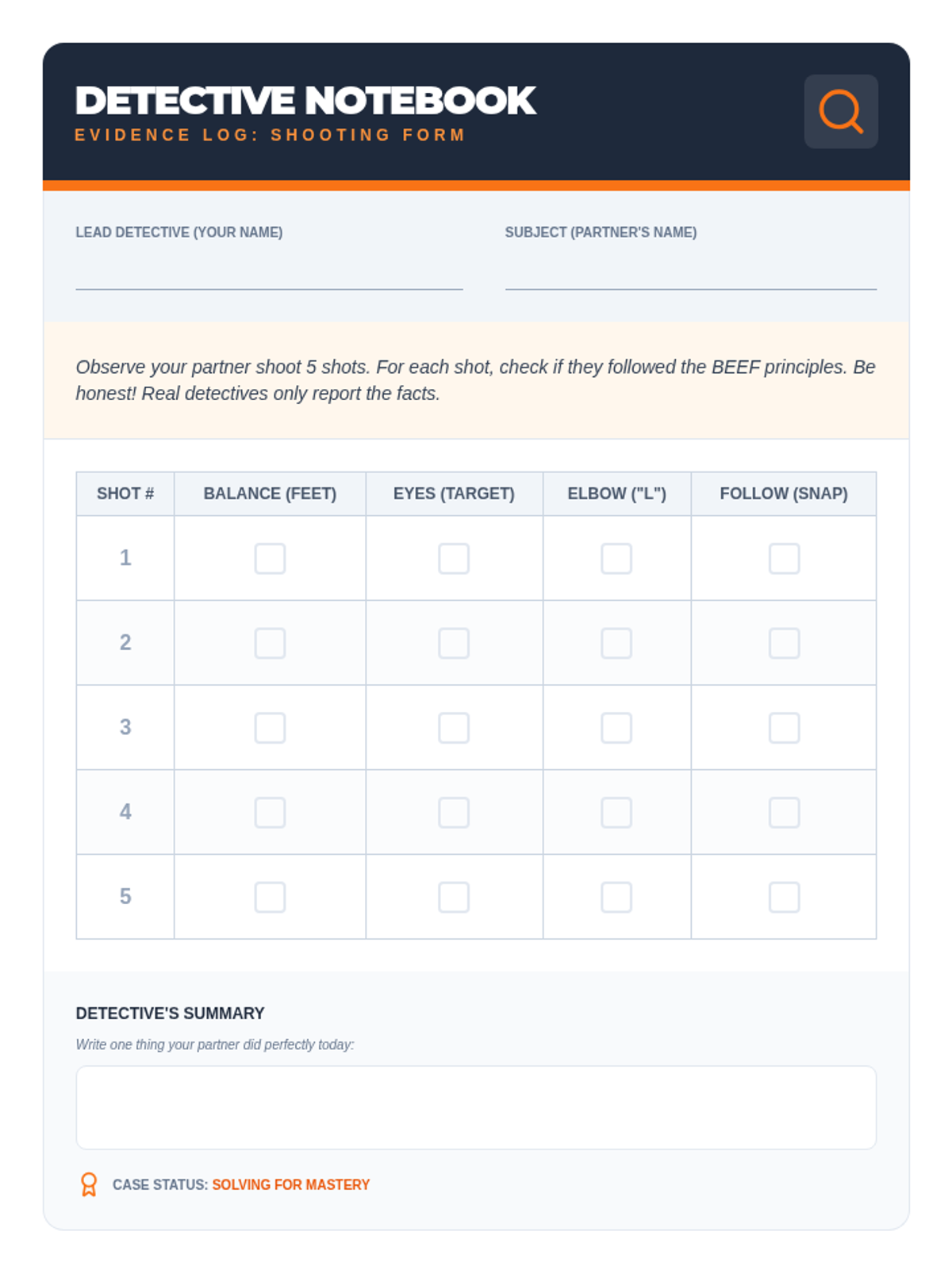 This workshop-style sequence breaks down shooting a basketball for 3rd graders using the B.E.E.F. acronym (Balance, Eyes, Elbow, Follow-through). Students progress from stationary form shooting to dynamic layups, focusing on body alignment and consistent mechanics over shooting accuracy.