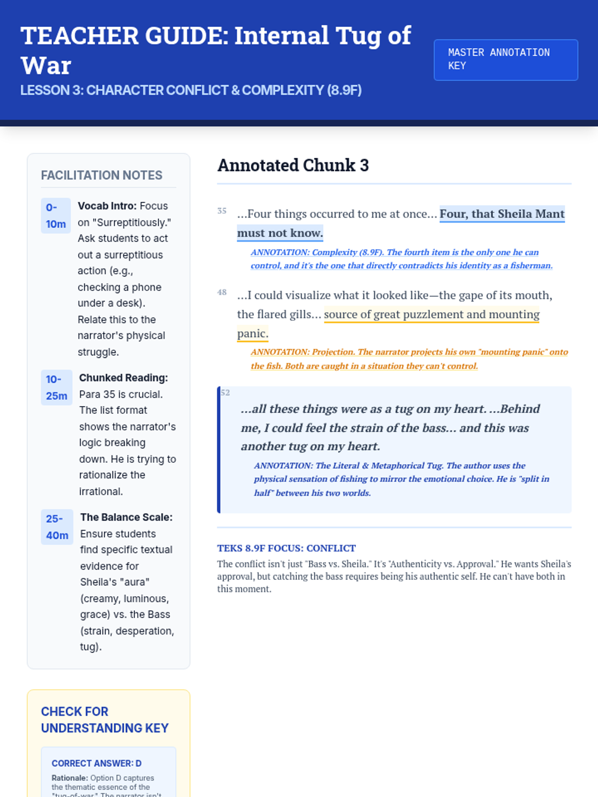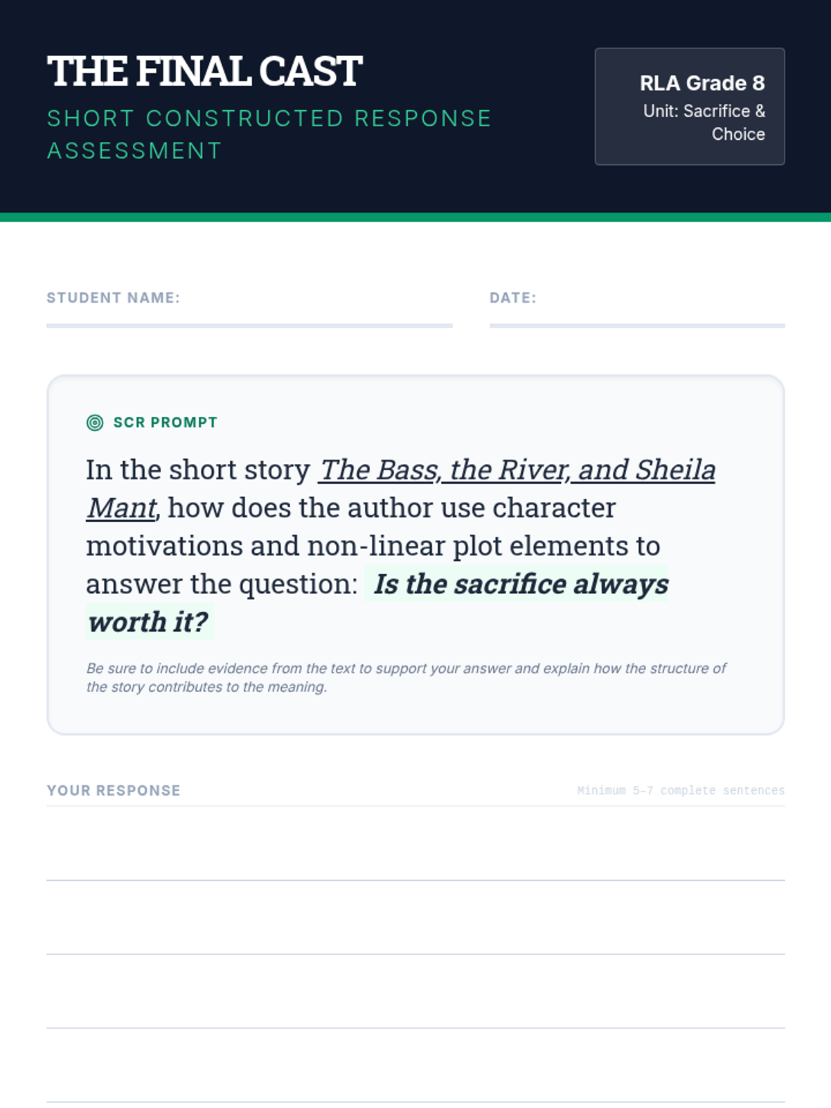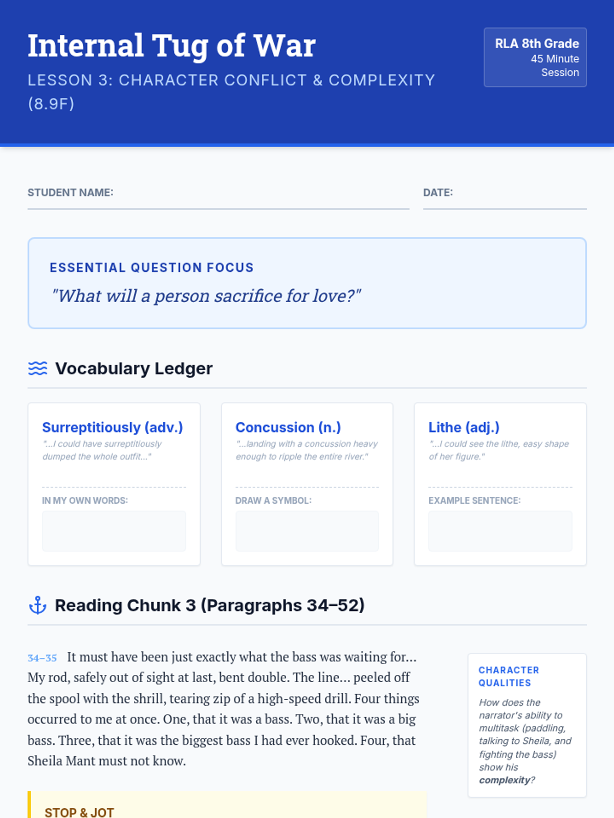 A 6-day RLA unit for 8th grade focusing on 'The Bass, the River, and Sheila Mant'. Students explore character complexity (8.9F) and non-linear plot elements (8.9A) through the lens of sacrifice and love.