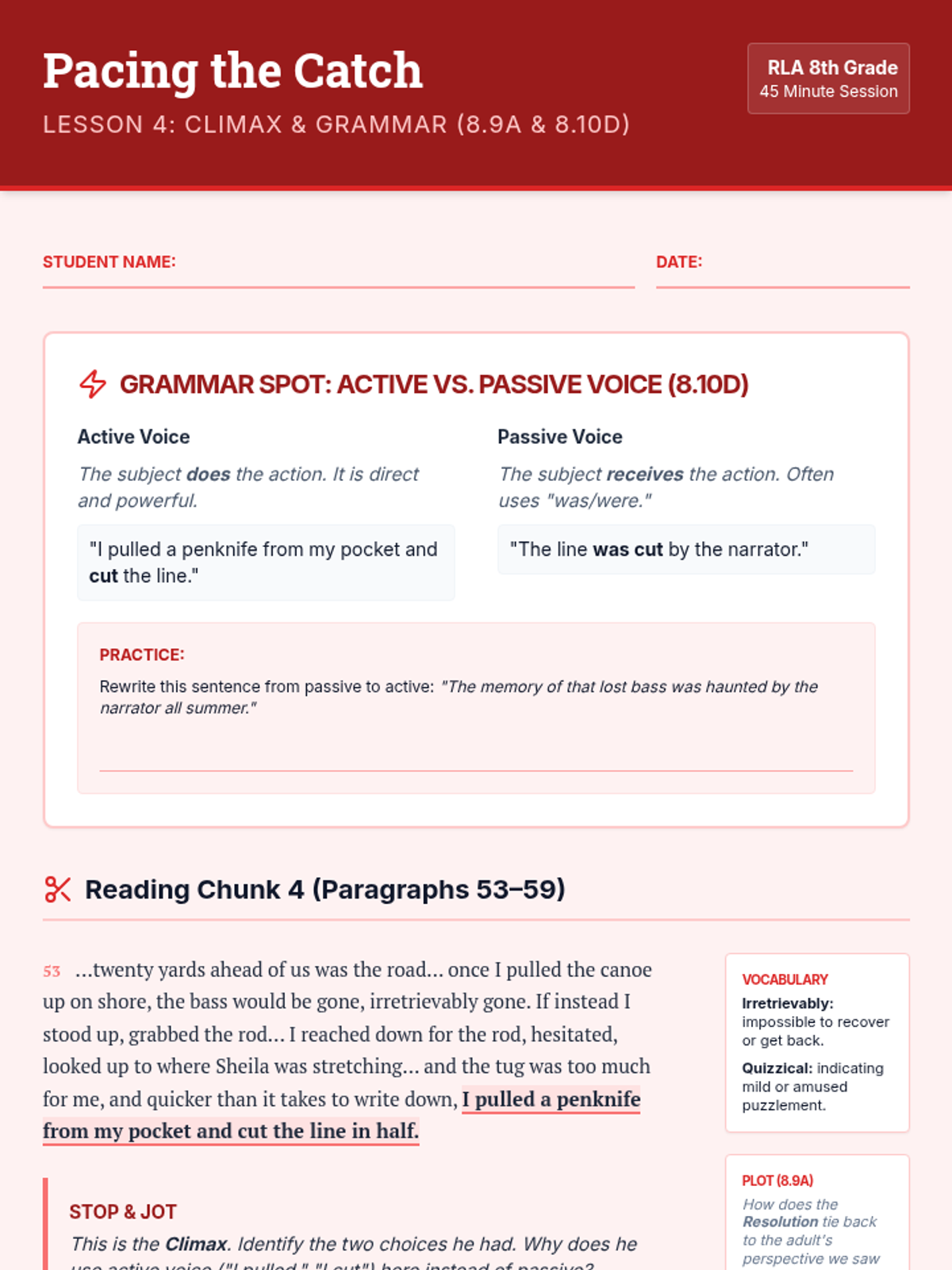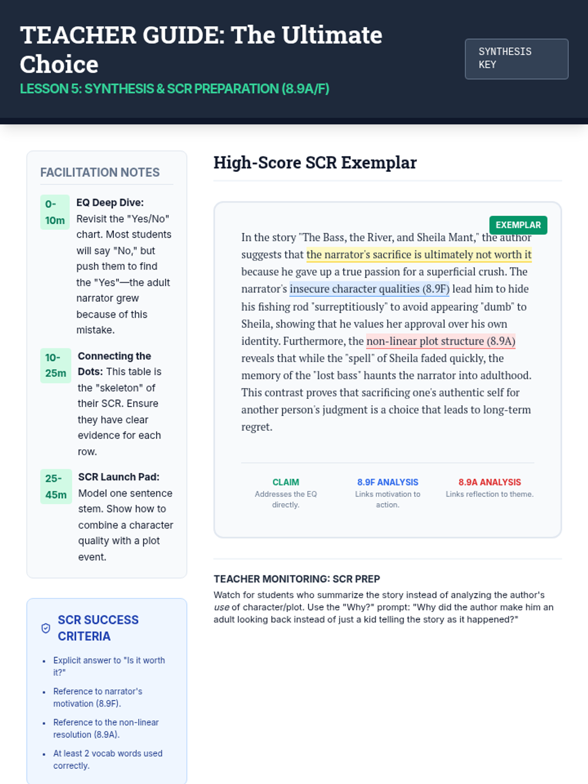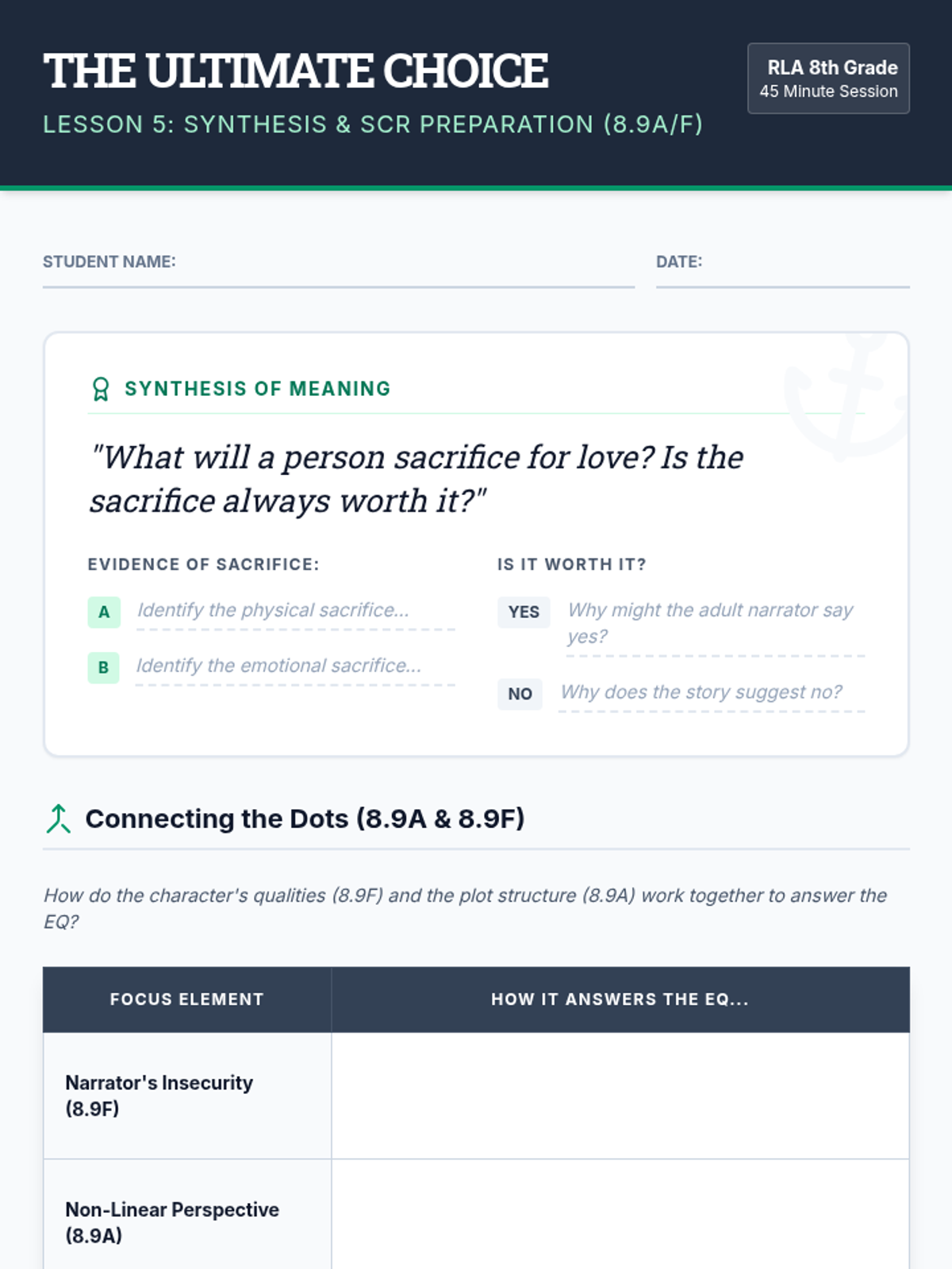 A 6-day RLA unit for 8th grade focusing on 'The Bass, the River, and Sheila Mant'. Students explore character complexity (8.9F) and non-linear plot elements (8.9A) through the lens of sacrifice and love.